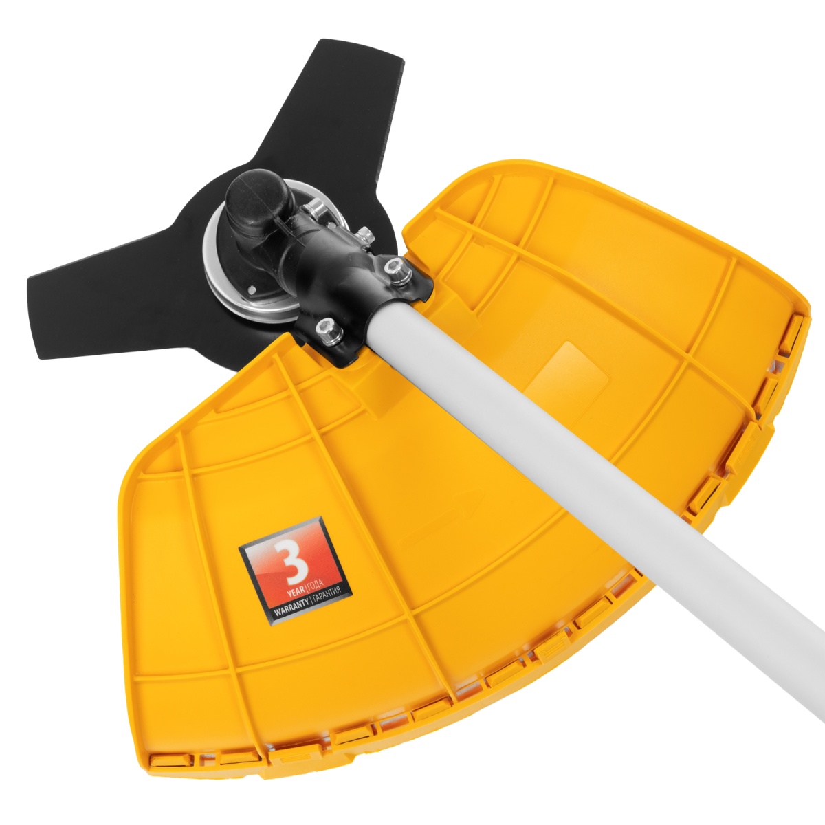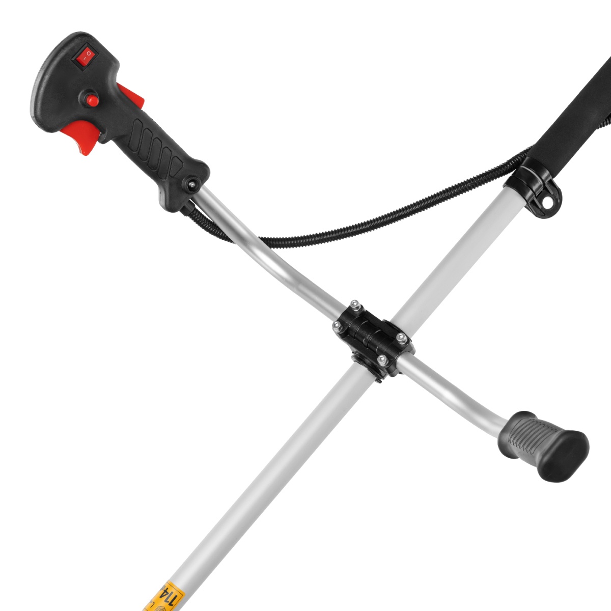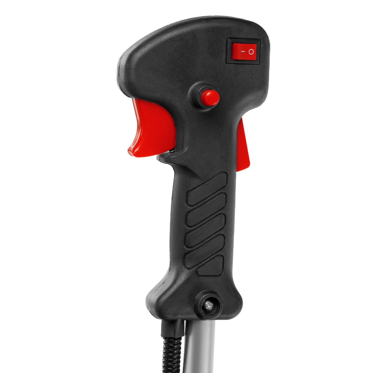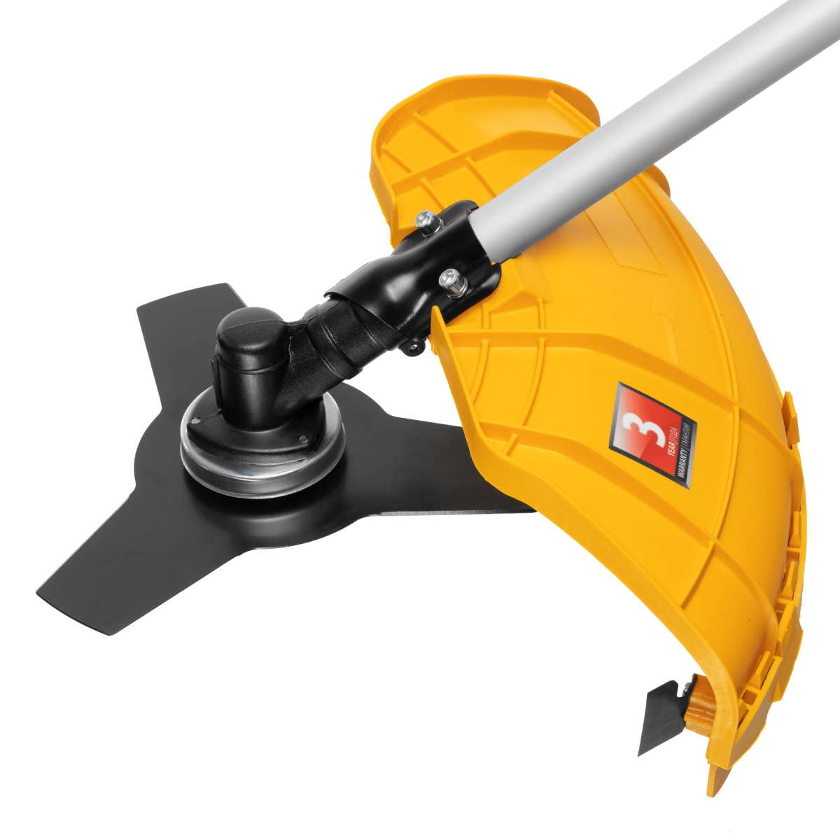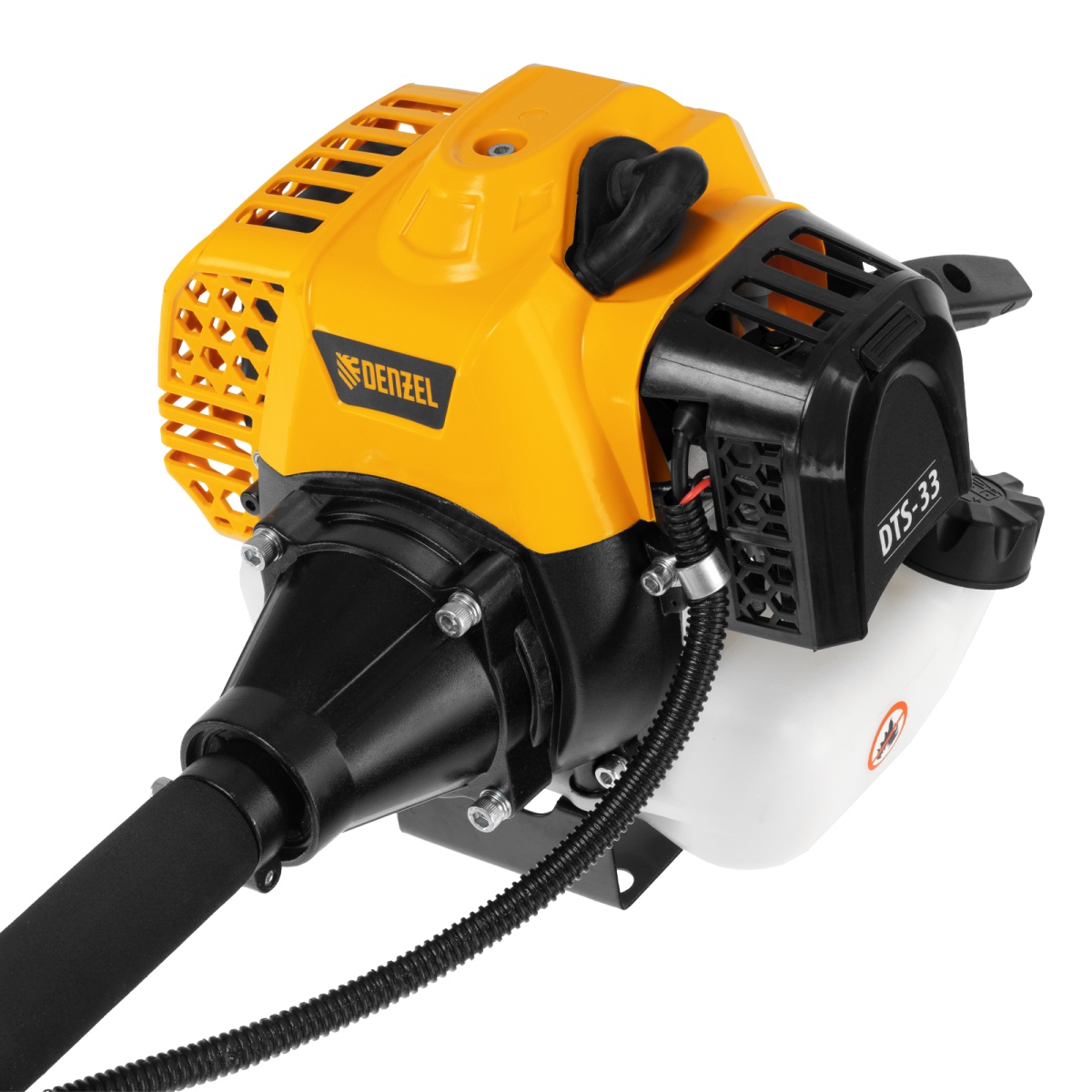 Триммер бензиновый Denzel DTS-33 962115 с двигателем объемом 33 куб. см и неразъемной штангой поставляется комплектом из 2 частей. Усиленная катушка с леской предназначена для скашивания мягкой травы, а трехлопастный нож &mdash, для борьбы с густыми зарослями, многолетними сорняками, молодым кустарником и растительностью с толстыми стеблями. Ширина прохода леской составляет 42 см, ножом &mdash, 25,5 см, что позволяет выполнять большие объемы работ.Двухтактный бензиновый двигатель мощностью 1,8 л. с. обеспечивает эффективное решение поставленных задач и полную автономность. Работать можно даже в самых отдаленных участках сада, не заботясь о наличии сети электропитания.ПреимуществаВысококачественное исполнение &mdash, надежный редуктор, двигатель с хромированным цилиндром и прочное сцепление обеспечивают стабильную работу триммера.Система легкого запуска Easy Start &mdash, трос стартера вытягивается легко и без рывков, что упрощает начало работы.Легкое включение &mdash, праймер для подкачки топлива упрощает запуск двигателя, поэтому включить триммер даже после долгого простоя будет несложно.Защита от случайного пуска &mdash, блокиратор курка газа предотвращает включение триммера по неосторожности, обеспечивая безопасность пользователя.Удобная работа без усталости &mdash, одноплечевая подвесная система перераспределяет вес бензотриммера, а мягкая защита бедра позволяет снизить уровень вибраций и избежать ударов.Безопасная эксплуатация &mdash, прочный кожух, закрывающий оснастку, защищает пользователя от летящей травы, грязи и мелких камней.Легкое обновление лески &mdash, достаточно слегка ударить полуавтоматической катушкой по земле, не снижая оборотов двигателя, что позволяет быстрее справиться с работой.Специальный нож на фартуке кожуха &mdash, концы лески подрезаются до нужной длины, это позволяет предотвратить перегрузку двигателя.Эргономичность &mdash, рукоятки велосипедного типа обеспечивают правильное положение рук, что делает работу с триммером комфортной.Быстрая подготовка к работе &mdash, бензотриммер поставляется с уже установленным на штангу редуктором и корпусом сцепления.Удобный дозатор в комплекте &mdash, емкость для приготовления топливной смеси не придется приобретать отдельно.Гарантия на заводской брак 3 года &mdash, качество и надежность инструмента подтверждены производителем.