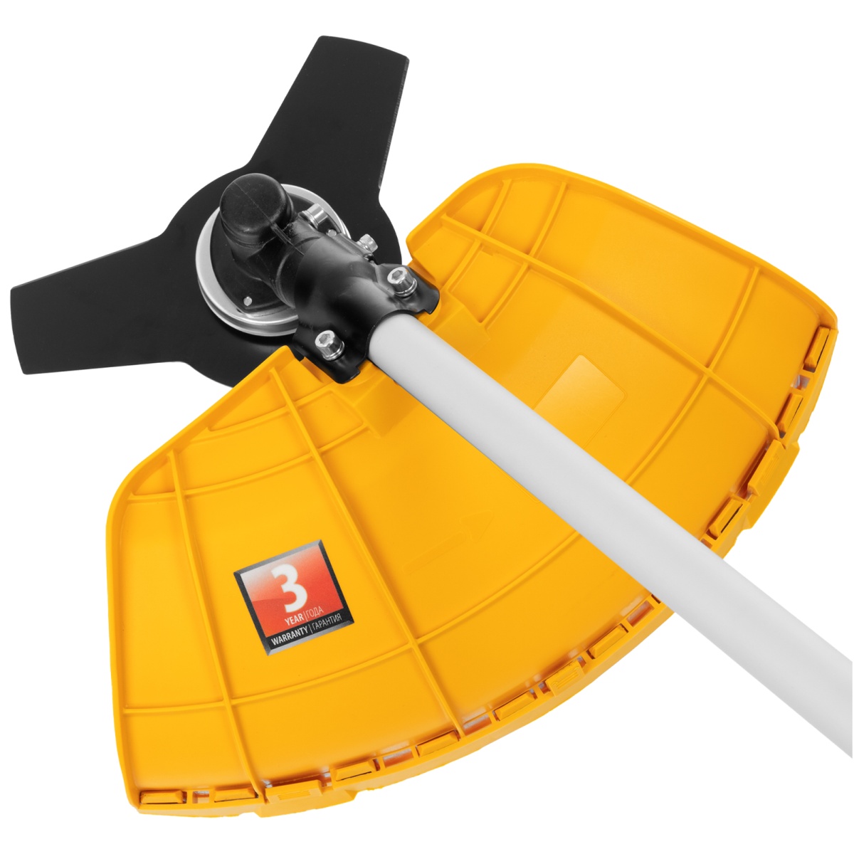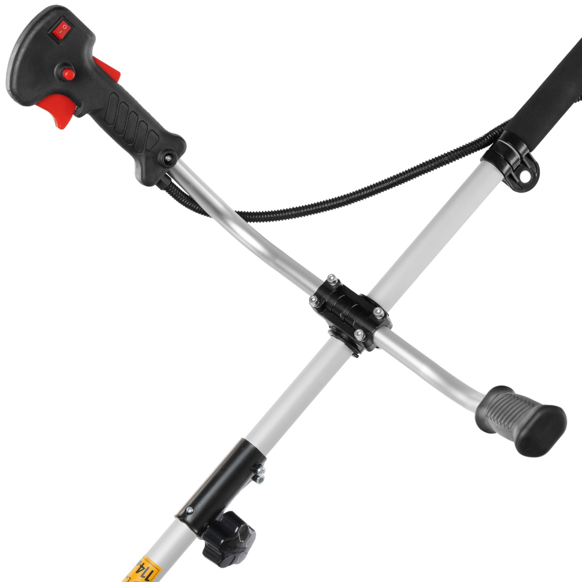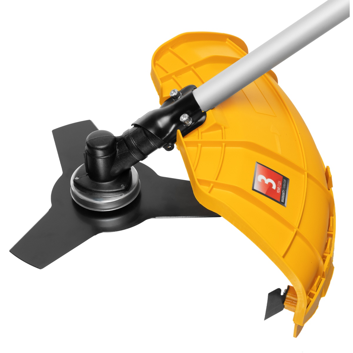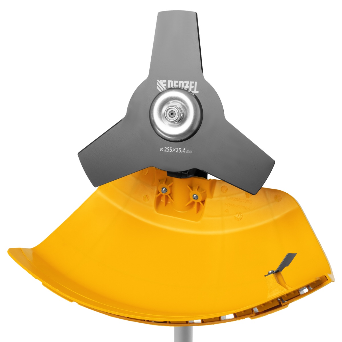 Триммер бензиновый Denzel DTS-33S 962125 с двигателем объемом 33 куб. см и разъемной штангой (состоит из 2 частей), используется для скашивания травы любой густоты, выравнивания кромок газонов, избавления от сорняков и растительности с толстыми стеблями. Комплектуется двумя режущими оснастками &mdash, усиленной катушкой с леской и трехлопастным стальным ножом. Ширина скашивания леской составляет 42 см, а ножом &mdash, 25,5 см, поэтому триммер характеризуется высокой производительностью.Двухтактный бензиновый двигатель мощностью 1,8 л. с. обеспечивает эффективное решение поставленных задач и полную автономность. Работать можно даже в самых отдаленных участках сада, не заботясь о наличии сети электропитания.ПреимуществаВысококачественное исполнение &mdash, надежный редуктор, двигатель с хромированным цилиндром и прочное сцепление обеспечивают стабильную работу триммера.Система легкого запуска Easy Start &mdash, трос стартера вытягивается легко и без рывков, что упрощает начало работы.Легкое включение &mdash, праймер для подкачки топлива упрощает запуск двигателя, поэтому включить триммер даже после долгого простоя будет несложно.Защита от случайного пуска &mdash, блокиратор курка газа предотвращает включение триммера по неосторожности, обеспечивая безопасность пользователя.Удобная работа без усталости &mdash, одноплечевая подвесная система перераспределяет вес бензотриммера, а мягкая защита бедра позволяет снизить уровень вибраций и избежать ударов.Безопасная эксплуатация &mdash, прочный кожух, закрывающий оснастку, защищает пользователя от летящей травы, грязи и мелких камней.Легкое обновление лески &mdash, достаточно слегка ударить полуавтоматической катушкой по земле, не снижая оборотов двигателя, что позволяет быстрее справиться с работой.Специальный нож на фартуке кожуха &mdash, концы лески подрезаются до нужной длины, это позволяет предотвратить перегрузку двигателя.Эргономичность &mdash, рукоятки велосипедного типа обеспечивают правильное положение рук, что делает работу с триммером комфортной.Быстрая подготовка к работе &mdash, бензотриммер поставляется с уже установленным на штангу редуктором и корпусом сцепления.Разборная штанга &mdash, триммер удобен в хранении и транспортировке.Удобный дозатор в комплекте &mdash, емкость для приготовления топливной смеси не придется приобретать отдельно.Гарантия на заводской брак 3 года &mdash, качество и надежность инструмента подтверждены производителем.