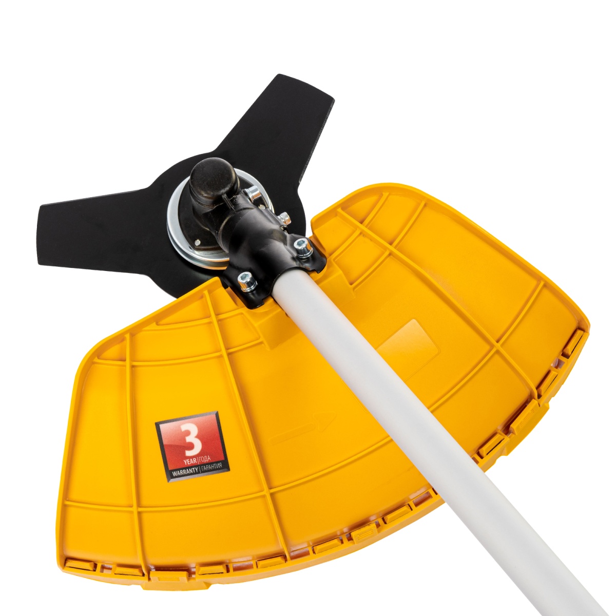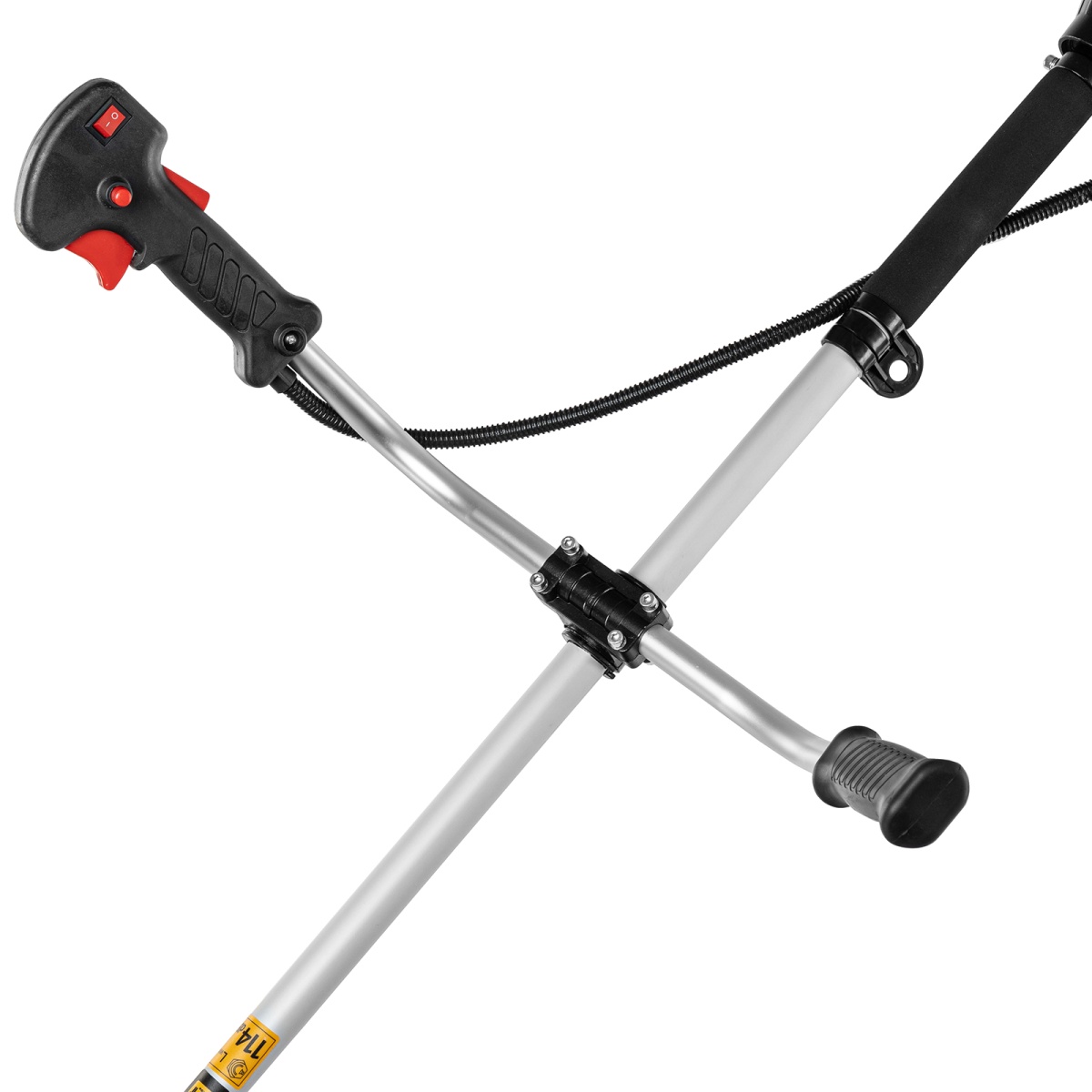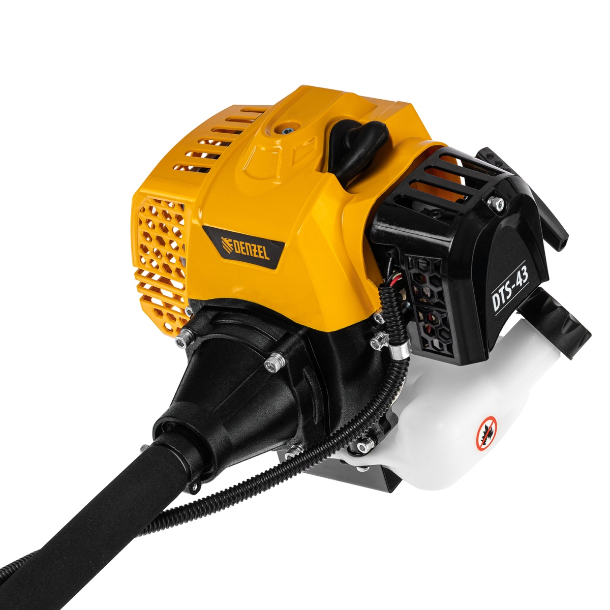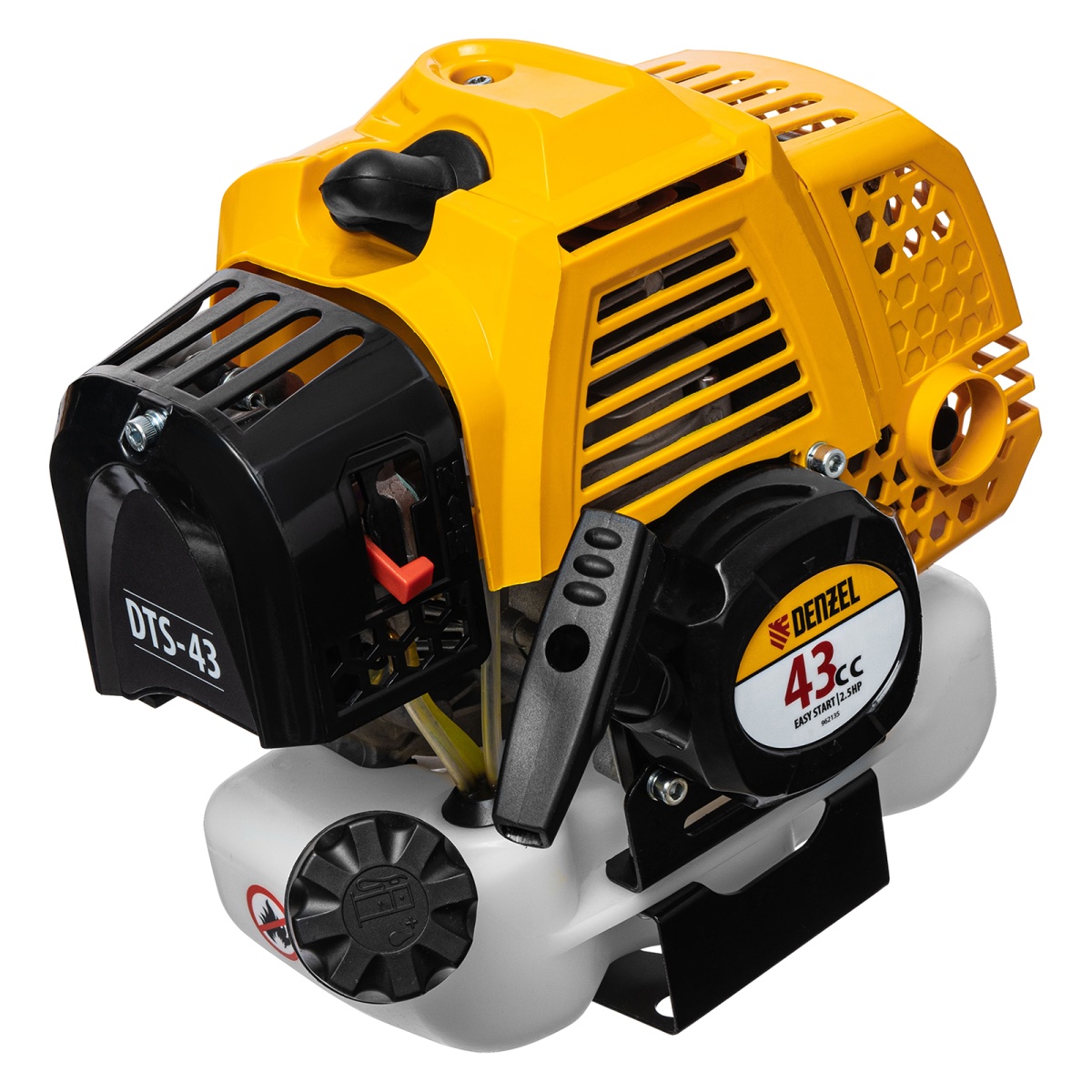 Триммер бензиновый Denzel DTS-43 962135 с двигателем объемом 43 куб. см и неразъемной штангой поставляется комплектом из 2 частей. Усиленная катушка с леской предназначена для скашивания мягкой травы, а трехлопастный нож &mdash, для борьбы с густыми зарослями, многолетними сорняками, молодым кустарником и растительностью с толстыми стеблями. Ширина прохода леской составляет 42 см, ножом &mdash, 25,5 см, что позволяет выполнять большие объемы работ.Двухтактный бензиновый двигатель мощностью 2,5 л. с. обеспечивает эффективное решение поставленных задач и полную автономность. Работать можно даже в самых отдаленных участках сада, не заботясь о наличии сети электропитания.ПреимуществаВысококачественное исполнение &mdash, надежный редуктор, двигатель с хромированным цилиндром и прочное сцепление обеспечивают стабильную работу триммера.Система легкого запуска Easy Start &mdash, трос стартера вытягивается легко и без рывков, что упрощает начало работы.Легкое включение &mdash, праймер для подкачки топлива упрощает запуск двигателя, поэтому включить триммер даже после долгого простоя будет несложно.Защита от случайного пуска &mdash, блокиратор курка газа предотвращает включение триммера по неосторожности, обеспечивая безопасность пользователя.Удобная работа без усталости &mdash, одноплечевая подвесная система перераспределяет вес бензотриммера, а мягкая защита бедра позволяет снизить уровень вибраций и избежать ударов.Безопасная эксплуатация &mdash, прочный кожух, закрывающий оснастку, защищает пользователя от летящей травы, грязи и мелких камней.Легкое обновление лески &mdash, достаточно слегка ударить полуавтоматической катушкой по земле, не снижая оборотов двигателя, что позволяет быстрее справиться с работой.Специальный нож на фартуке кожуха &mdash, концы лески подрезаются до нужной длины, это позволяет предотвратить перегрузку двигателя.Эргономичность &mdash, рукоятки велосипедного типа обеспечивают правильное положение рук, что делает работу с триммером комфортной.Быстрая подготовка к работе &mdash, бензотриммер поставляется с уже установленным на штангу редуктором и корпусом сцепления.Удобный дозатор в комплекте &mdash, емкость для приготовления топливной смеси не придется приобретать отдельно.Гарантия на заводской брак 3 года &mdash, качество и надежность инструмента подтверждены производителем.