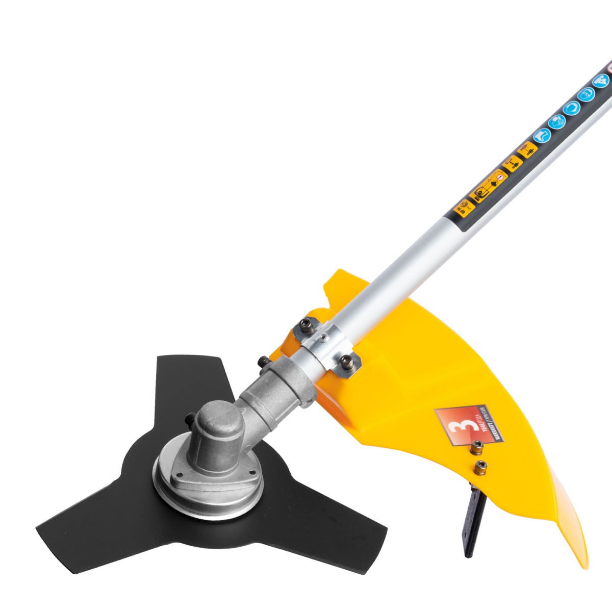 - Дополнительные возможности — можно приобрести и установить на триммер диск Denzel 96323 с шириной скашивания 230 мм для быстрого удаления растительности с жесткими стеблями (полыни, крапивы, лебеды), 96328 для скашивания молодых побегов кустарника диаметром до 3 мм, 96340 для срезания борщевика, кустарника и молодых побегов деревьев с диаметром стволов до 10 мм.