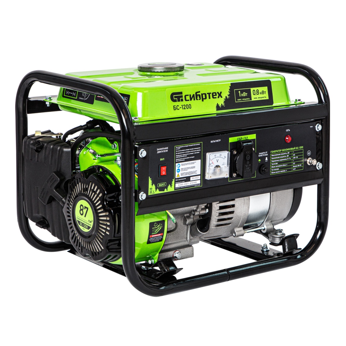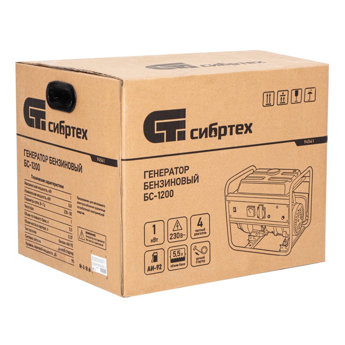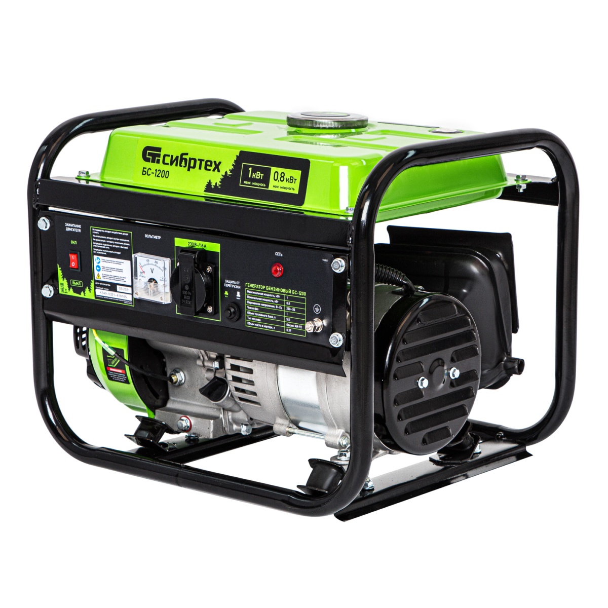 Бензиновый генератор Сибртех БС-1200 94541 на 230 В, максимальной мощностью 1000 Вт, с 4-тактным двигателем, с баком на 5,5 л и ручным стартером, может использоваться в качестве простой резервной системы электроснабжения на природе, в мастерской или на даче. Вырабатываемой мощности в 800 Вт хватит для одновременного обеспечения электричеством 4 ламп накаливания, компьютера и роутера. Также возможно подключение одного инструмента с высоким пусковым током (не превышающим 1000 Вт), такого как дрель, перфоратор, углошлифовальная машина.ПреимуществаРабота без скачков напряжения — благодаря блоку AVR к генератору можно подключать даже чувствительную технику.Простая эксплуатация — все элементы управления расположены на передней панели, индикатор подключения к сети сигнализирует о готовности к работе.Контроль рабочих параметров — встроенный вольтметр позволяет отслеживать напряжение в сети, а топливный индикатор — уровень бензина в баке.Защита поршневой группы — специальный датчик не допускает старт генератора с низким уровнем масла в картере.Низкий расход топлива — бака объемом 5,5 л хватает на 6 ч работы без дозаправки.Надежность — защита от перегрузки и короткого замыкания продлевает срок службы генератора.Стабильная работа двигателя — система воздушного охлаждения обеспечивает эффективный отвод тепла.Прочная конструкция — стальная рама защищает генератор от повреждений, а ее верхние элементы можно использовать как ручки для транспортировки.