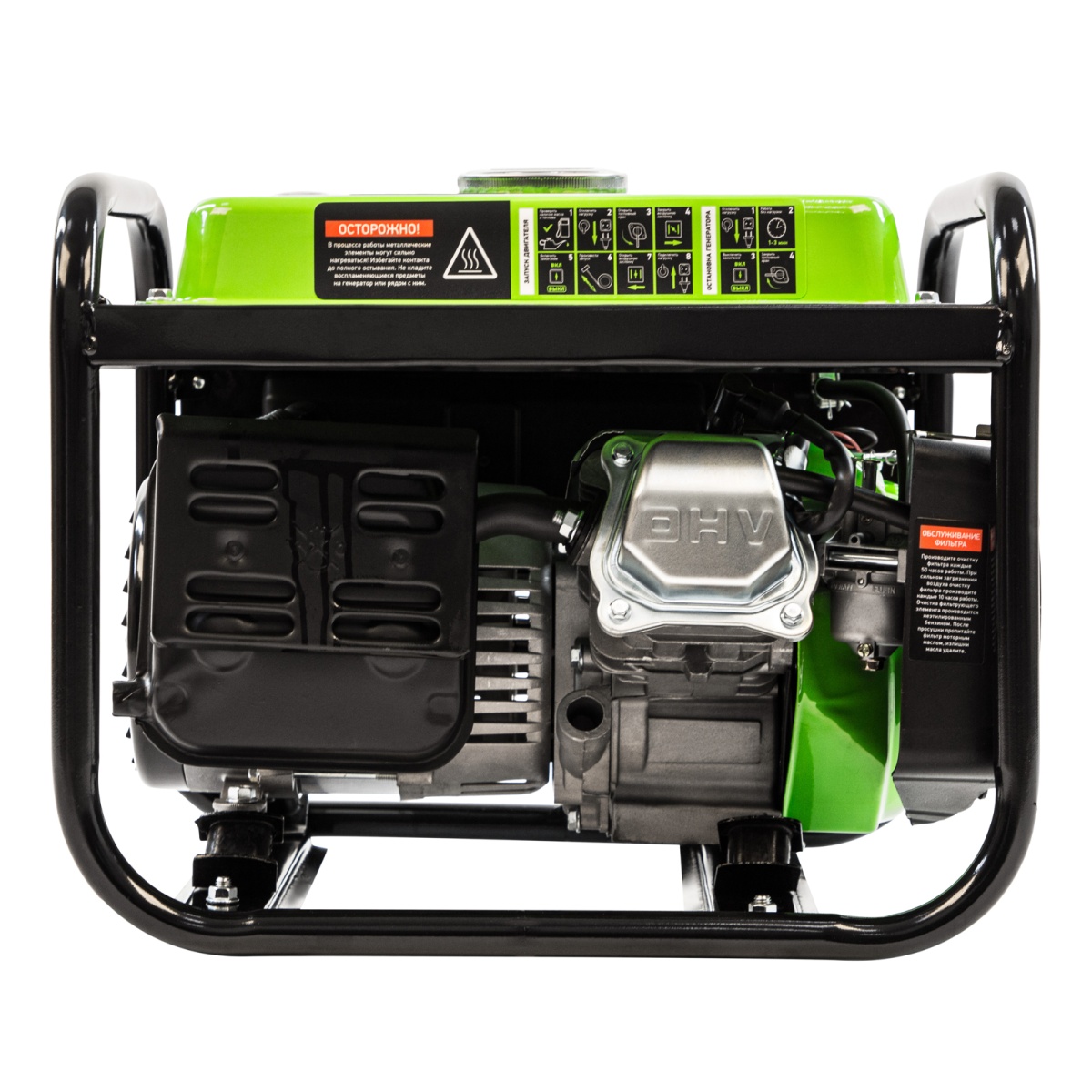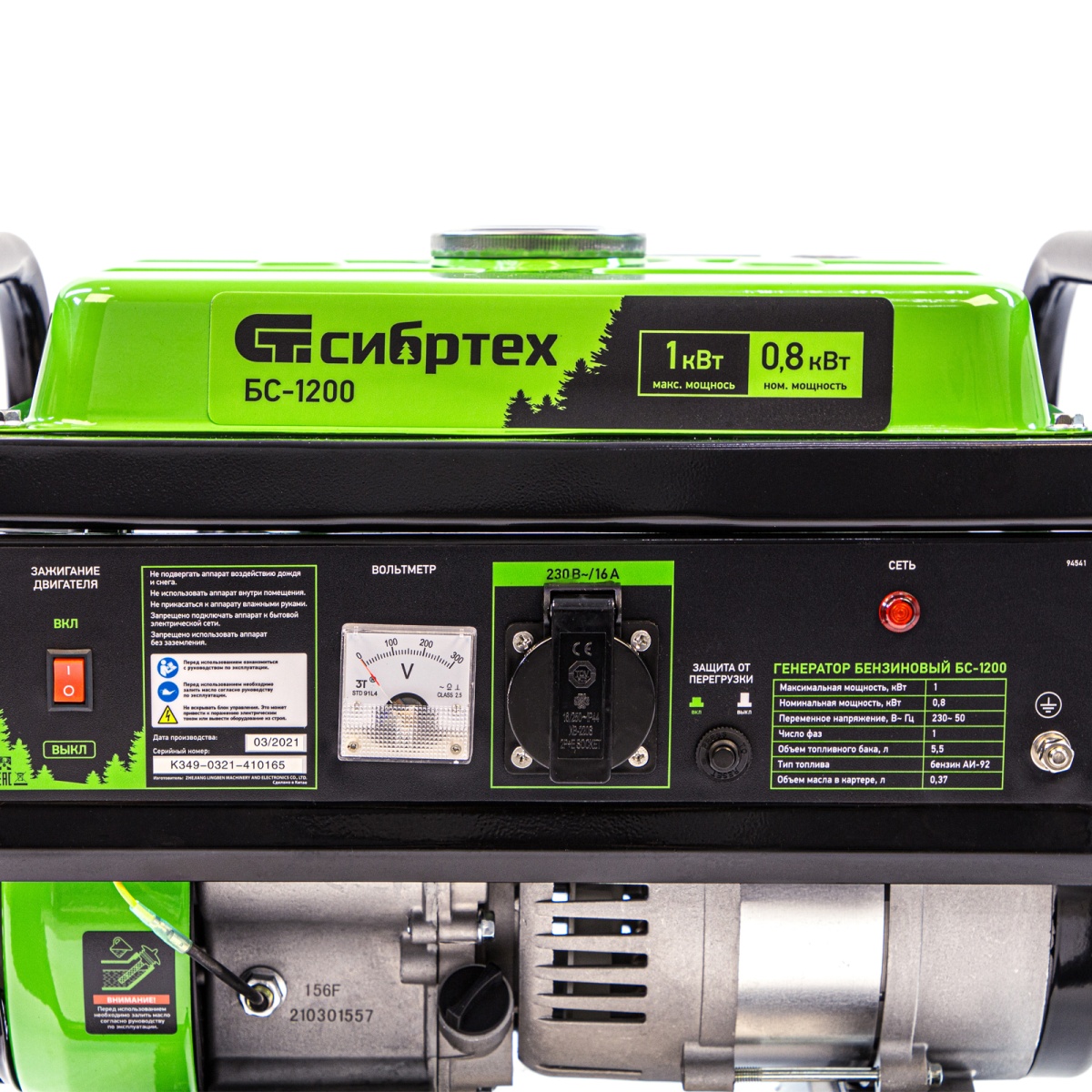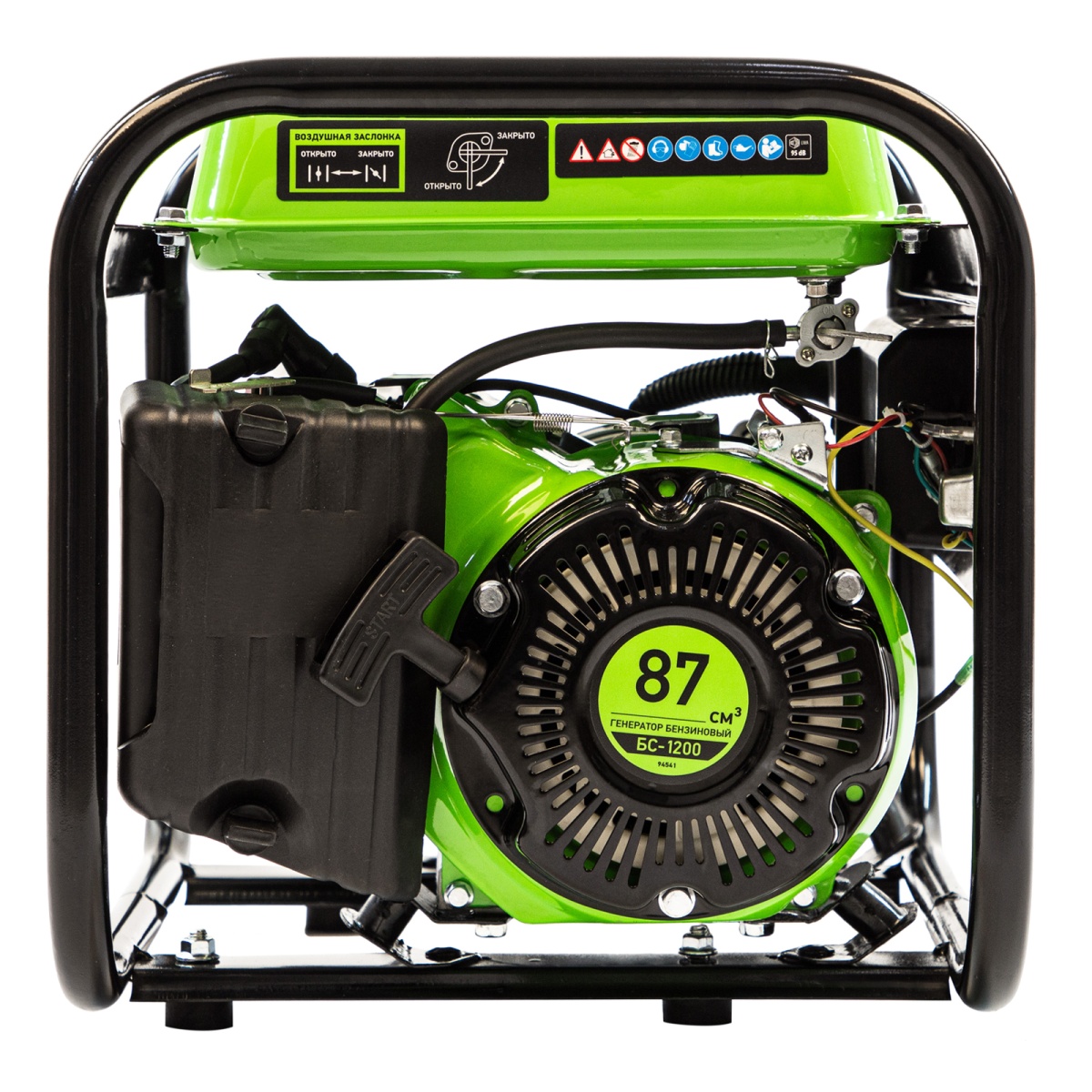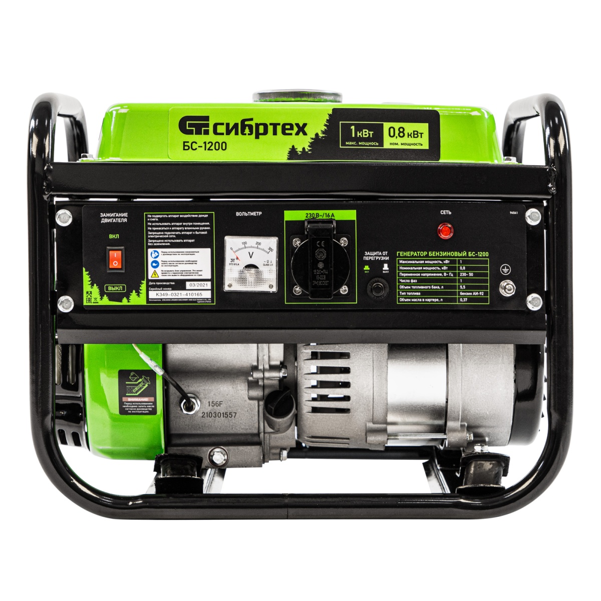 Бензиновый генератор Сибртех БС-1200 94541 на 230 В, максимальной мощностью 1000 Вт, с 4-тактным двигателем, с баком на 5,5 л и ручным стартером, может использоваться в качестве простой резервной системы электроснабжения на природе, в мастерской или на даче. Вырабатываемой мощности в 800 Вт хватит для одновременного обеспечения электричеством 4 ламп накаливания, компьютера и роутера. Также возможно подключение одного инструмента с высоким пусковым током (не превышающим 1000 Вт), такого как дрель, перфоратор, углошлифовальная машина.ПреимуществаРабота без скачков напряжения — благодаря блоку AVR к генератору можно подключать даже чувствительную технику.Простая эксплуатация — все элементы управления расположены на передней панели, индикатор подключения к сети сигнализирует о готовности к работе.Контроль рабочих параметров — встроенный вольтметр позволяет отслеживать напряжение в сети, а топливный индикатор — уровень бензина в баке.Защита поршневой группы — специальный датчик не допускает старт генератора с низким уровнем масла в картере.Низкий расход топлива — бака объемом 5,5 л хватает на 6 ч работы без дозаправки.Надежность — защита от перегрузки и короткого замыкания продлевает срок службы генератора.Стабильная работа двигателя — система воздушного охлаждения обеспечивает эффективный отвод тепла.Прочная конструкция — стальная рама защищает генератор от повреждений, а ее верхние элементы можно использовать как ручки для транспортировки.