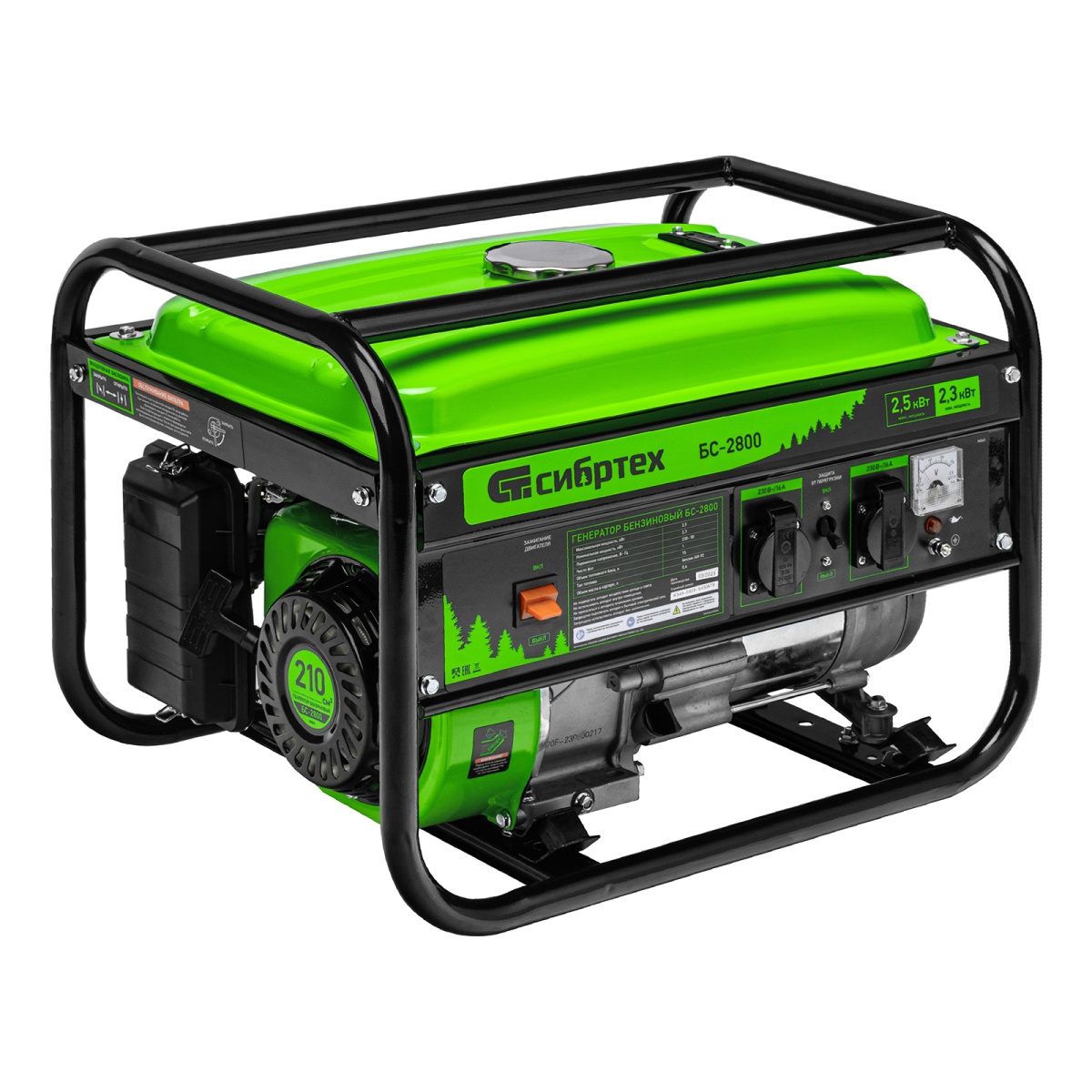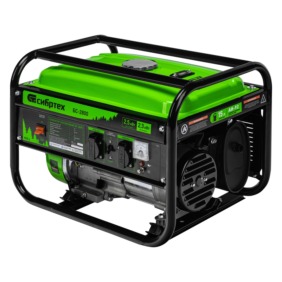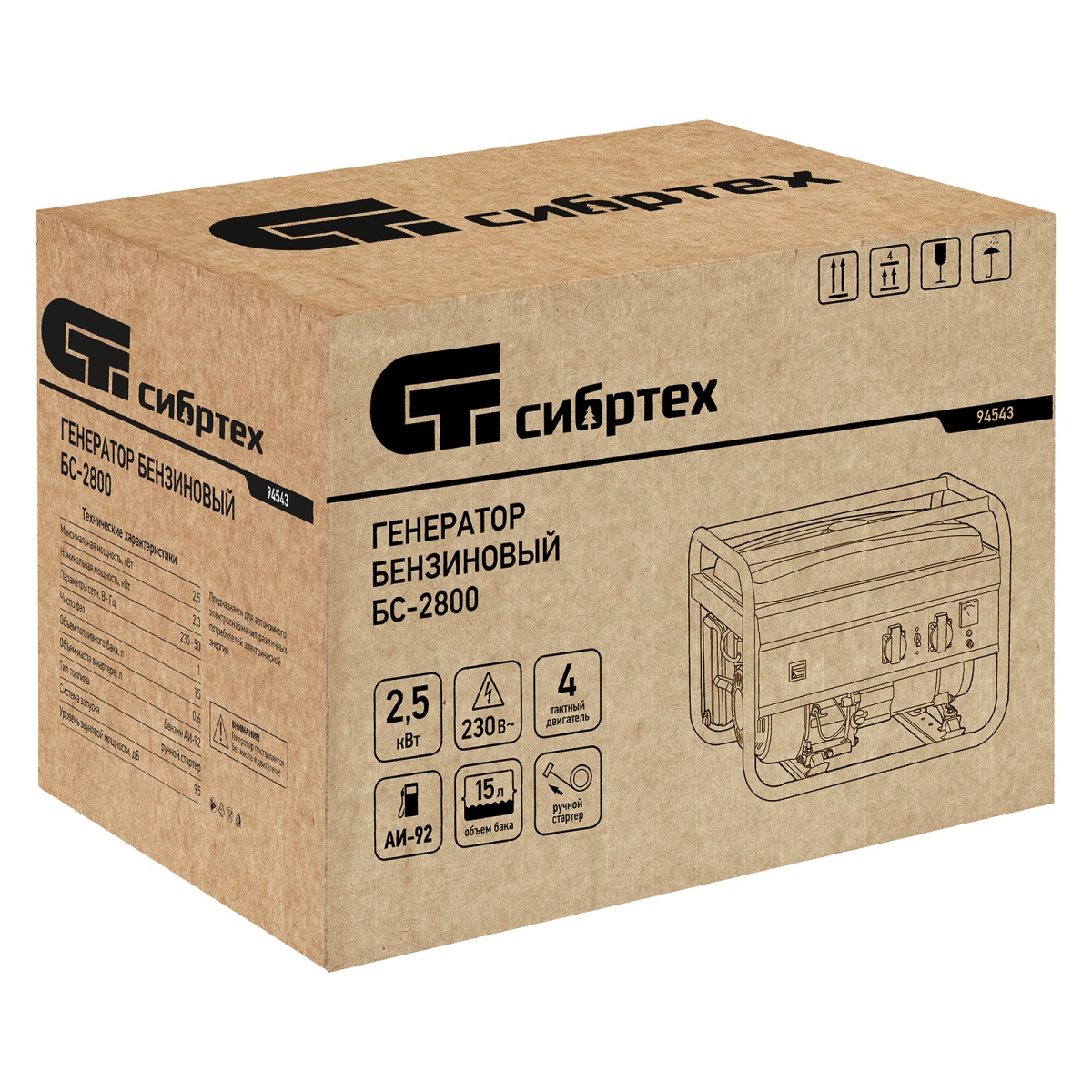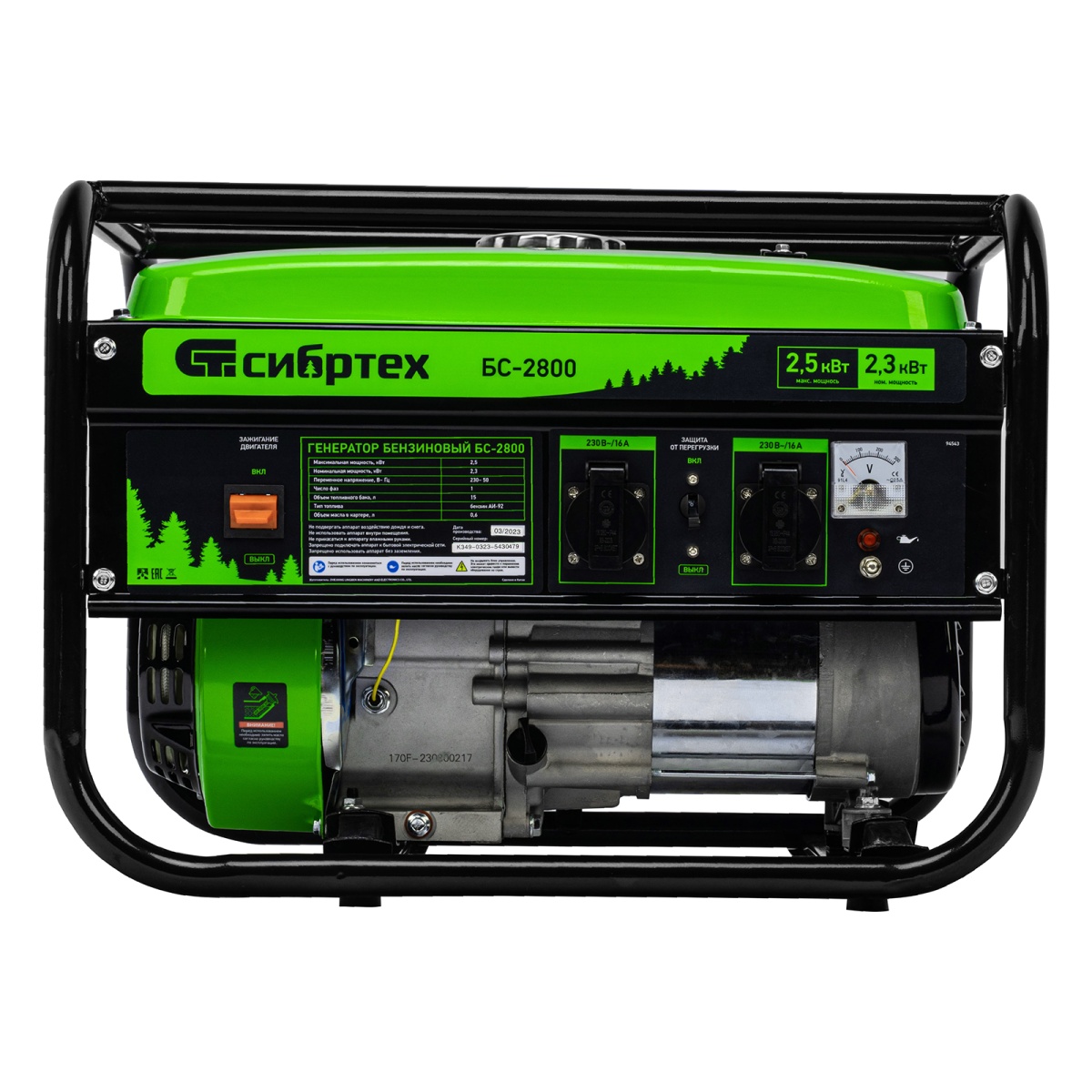 Бензиновый генератор Сибртех БС-2800 94543 на 230 В, максимальной мощностью 2,5 кВт, с 4-тактным двигателем и баком объемом 15 л, подходит для использования на даче, в гараже, мастерской или на стройке. Небольшой вес 37,6 кг позволяет брать генератор с собой на выездные работы или на природу. Мощности 2,5 кВт достаточно для одновременного питания 2 ламп накаливания, холодильника, СВЧ-печи и телевизора. 2 розетки упрощают одновременное подключение нескольких приборов.ПреимуществаРабота без скачков напряжения — благодаря блоку AVR к генератору можно подключать даже чувствительную технику.Простая эксплуатация — все элементы управления расположены на передней панели.Контроль рабочих параметров — встроенный вольтметр позволяет отслеживать напряжение в сети, а топливный индикатор — уровень бензина в баке.Защита поршневой группы — специальный датчик не допускает старт генератора с низким уровнем масла в картере.Низкий расход топлива — бака объемом 15 л хватает на 12 ч работы без дозаправки.Надежность — защита от перегрузки и короткого замыкания продлевает срок службы генератора.Стабильная работа двигателя — система воздушного охлаждения обеспечивает эффективный отвод тепла.Прочная конструкция — стальная рама надежно защищает генератор от повреждений.