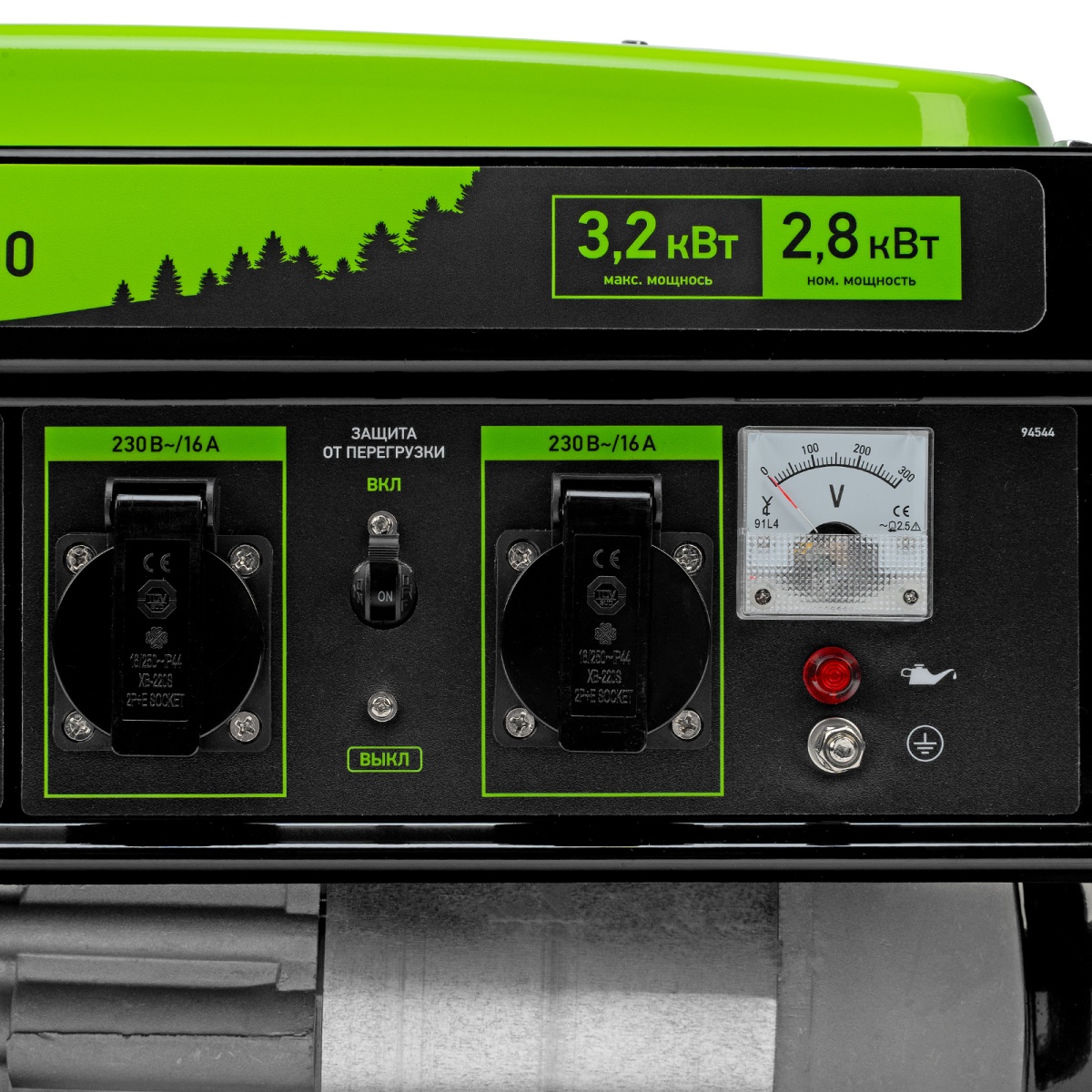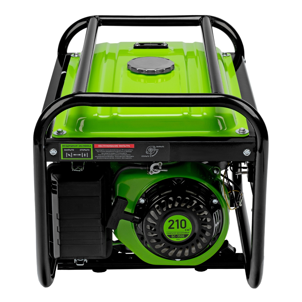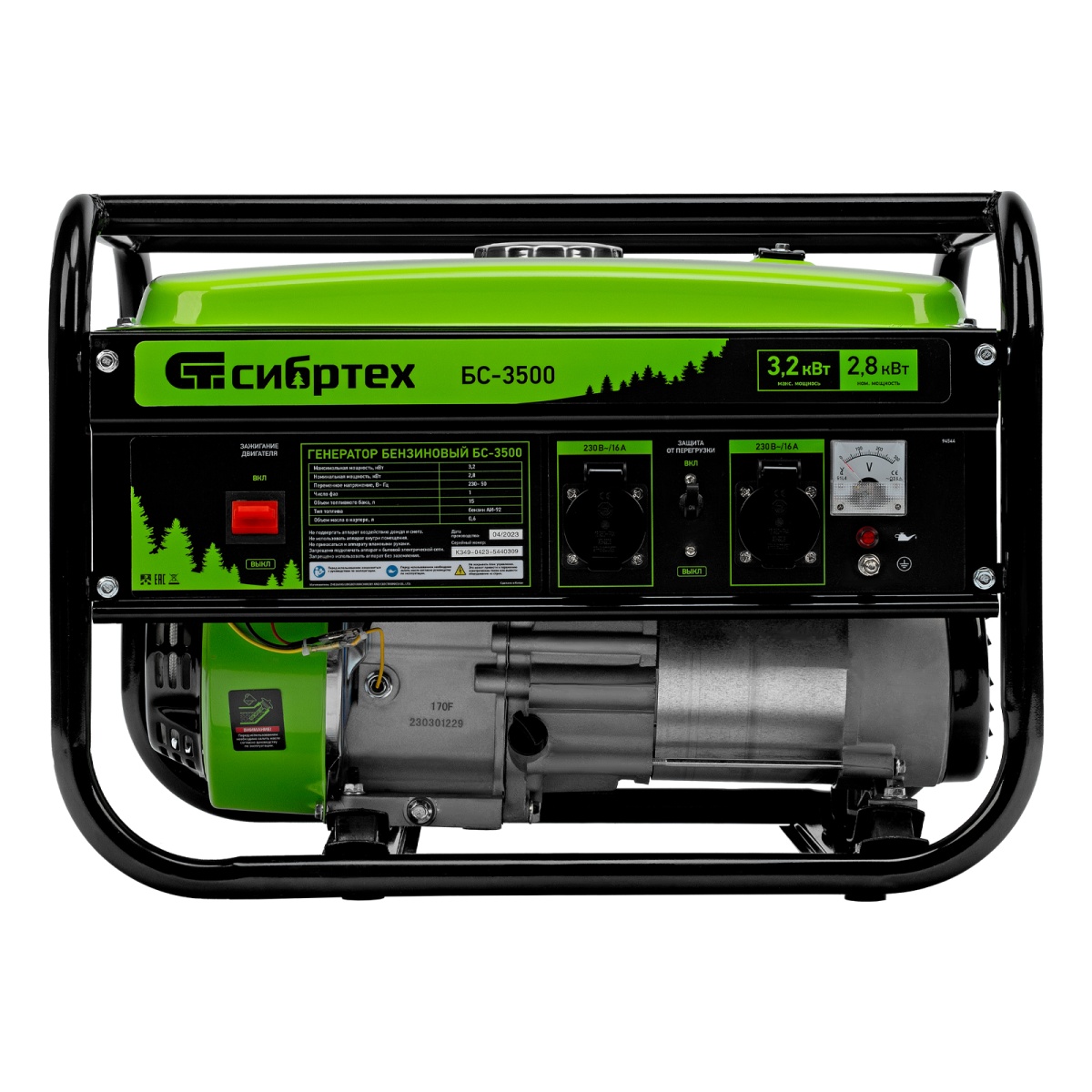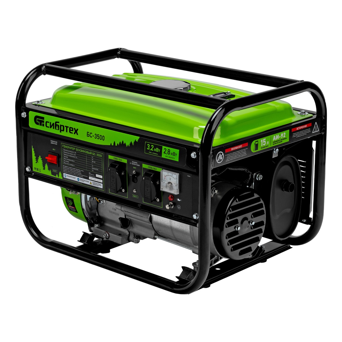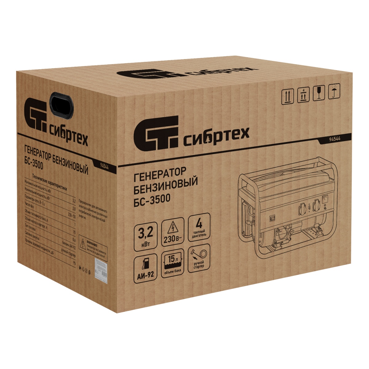 Бензиновый генератор Сибртех БС-3500 94544 на 230 В, максимальной мощностью 3,2 кВт, с 4-тактным двигателем, 15-литровым баком и ручным стартером, предназначен для электроснабжения дачи, кемпинга, небольшого магазина, гаража или строительной площадки. Весит всего 38,8 кг, что облегчает транспортировку, а значит, его можно брать на выездные работы или на природу. Выдаваемого напряжения 3,2 кВт хватает для одновременного подключения 4 ламп накаливания, холодильника, телевизора, электрочайника.ПреимуществаРабота без скачков напряжения — благодаря блоку AVR к генератору можно подключать даже чувствительную технику.Простая эксплуатация — все элементы управления расположены на передней панели.Контроль рабочих параметров — встроенный вольтметр позволяет отслеживать напряжение в сети, а топливный индикатор — уровень бензина в баке.Защита поршневой группы — специальный датчик не допускает старт генератора с низким уровнем масла в картере.Низкий расход топлива — бака объемом 15 л хватает на 11,5 ч работы без дозаправки.Надежность — защита от перегрузки и короткого замыкания продлевает срок службы генератора.Стабильная работа двигателя — система воздушного охлаждения обеспечивает эффективный отвод тепла.Прочная конструкция — стальная рама надежно защищает генератор от повреждений.