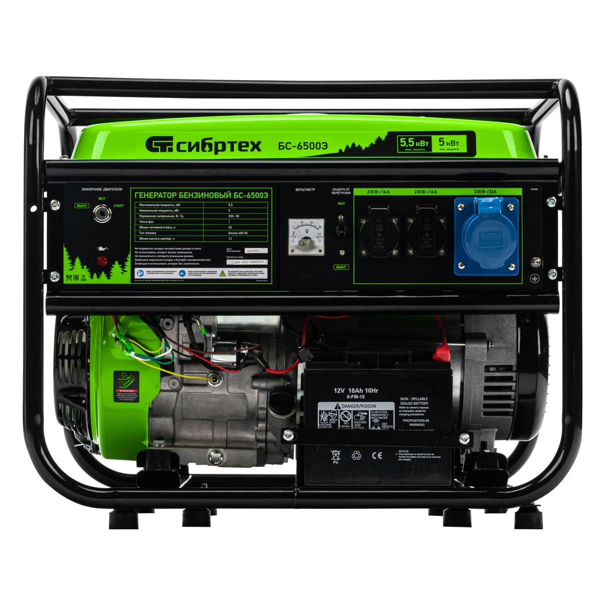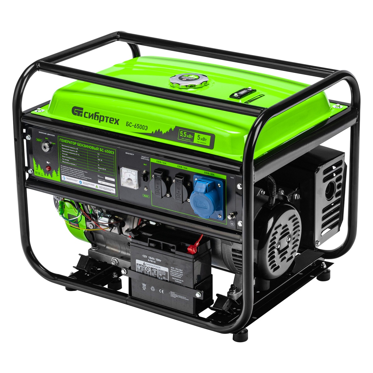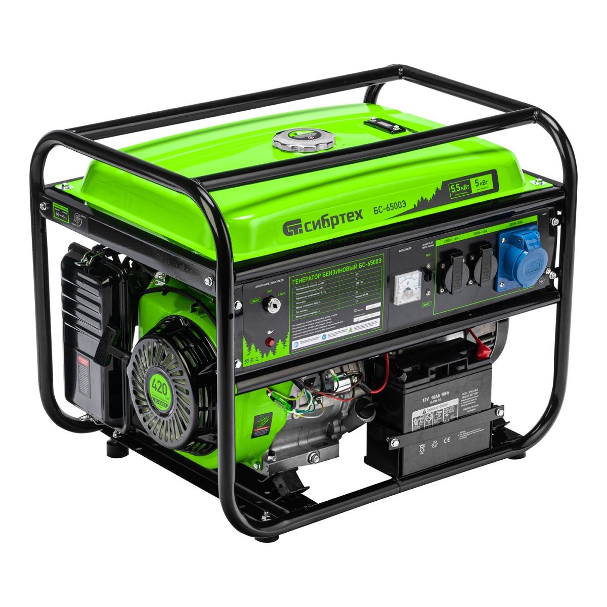 Бензиновый генератор Сибртех БС-6500Э 94548 максимальной мощностью 5,5 кВт, с 4-тактным двигателем, электростартером и баком объемом 25 л, выдает напряжение 230 В и используется для электроснабжения на даче, на строительной площадке, в магазине, в мастерской или гараже. Мощности хватает для обеспечения работы электроинструмента или одновременного подключения 4 ламп накаливания, телевизора, плиты и холодильника. Благодаря электростартеру запуск генератора осуществляется одним поворотом ключа.ПреимуществаНадежность — медная обмотка альтернатора и стальной распредвал выдерживают высокие нагрузки, прочная стальная рама защищает от повреждений.Возможность подключения чувствительной техники — блок AVR обеспечивает работу без скачков напряжения.Защита двигателя — специальный датчик не позволяет запустить генератор при низком уровне масла в картере.Стабильная работа — система защиты от перегрузки и короткого замыкания предотвращает поломку двигателя, а воздушное охлаждение способствует эффективному отводу тепла.Простое управление — все основные элементы контроля собраны на передней панели.Удобный контроль работы — вольтметр позволяет отслеживать напряжение в системе, а индикатор уровня топлива помогает своевременно производить заправку.Ручной старт — генератор легко запустится даже после долгого простоя и в случае разрядки аккумулятора.Низкий расход топлива — электростанция способна проработать до 9,6 ч без дозаправки.