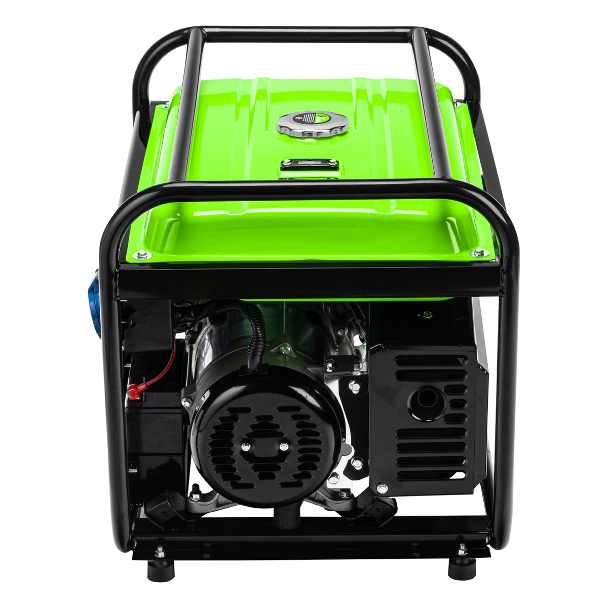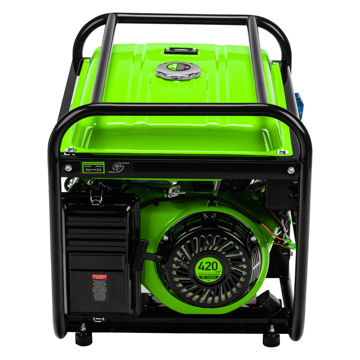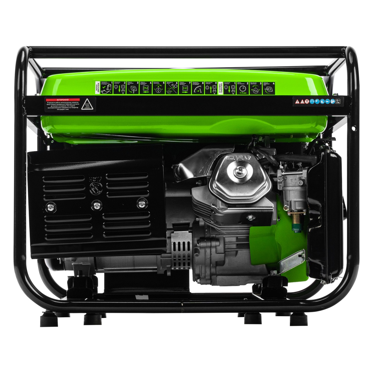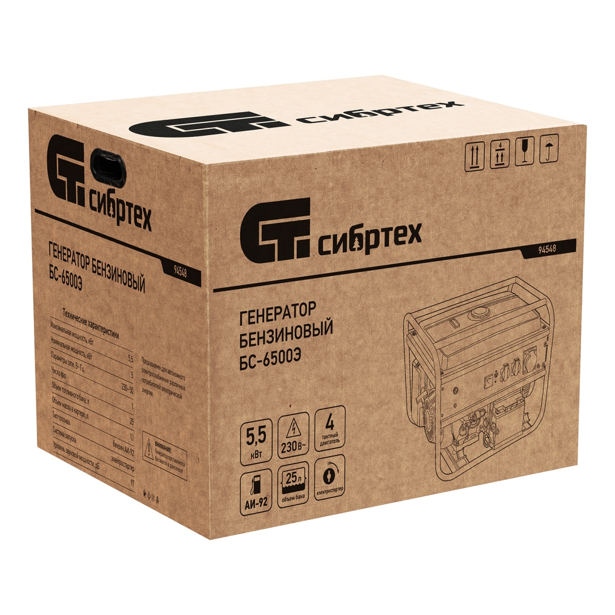 Бензиновый генератор Сибртех БС-6500Э 94548 максимальной мощностью 5,5 кВт, с 4-тактным двигателем, электростартером и баком объемом 25 л, выдает напряжение 230 В и используется для электроснабжения на даче, на строительной площадке, в магазине, в мастерской или гараже. Мощности хватает для обеспечения работы электроинструмента или одновременного подключения 4 ламп накаливания, телевизора, плиты и холодильника. Благодаря электростартеру запуск генератора осуществляется одним поворотом ключа.ПреимуществаНадежность — медная обмотка альтернатора и стальной распредвал выдерживают высокие нагрузки, прочная стальная рама защищает от повреждений.Возможность подключения чувствительной техники — блок AVR обеспечивает работу без скачков напряжения.Защита двигателя — специальный датчик не позволяет запустить генератор при низком уровне масла в картере.Стабильная работа — система защиты от перегрузки и короткого замыкания предотвращает поломку двигателя, а воздушное охлаждение способствует эффективному отводу тепла.Простое управление — все основные элементы контроля собраны на передней панели.Удобный контроль работы — вольтметр позволяет отслеживать напряжение в системе, а индикатор уровня топлива помогает своевременно производить заправку.Ручной старт — генератор легко запустится даже после долгого простоя и в случае разрядки аккумулятора.Низкий расход топлива — электростанция способна проработать до 9,6 ч без дозаправки.