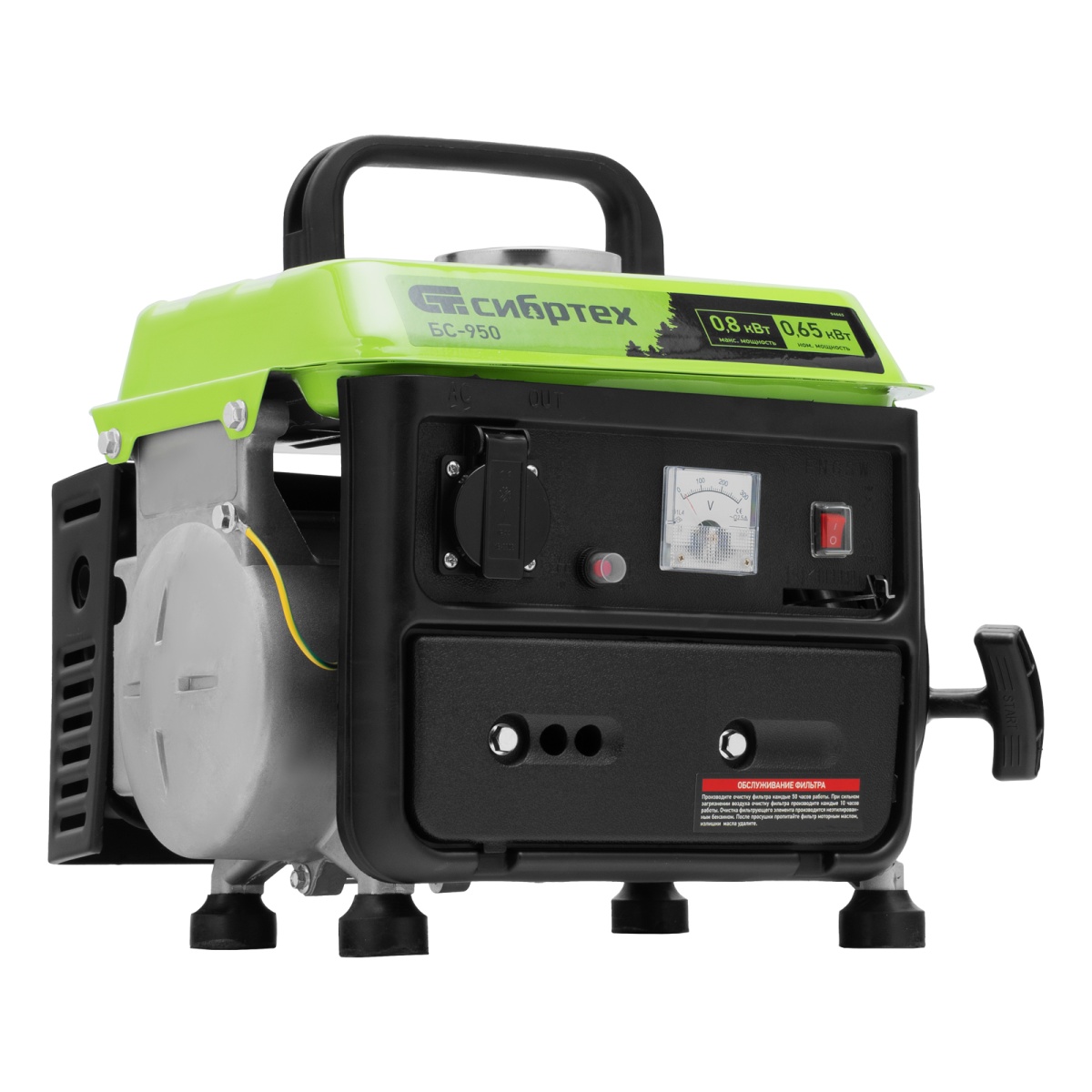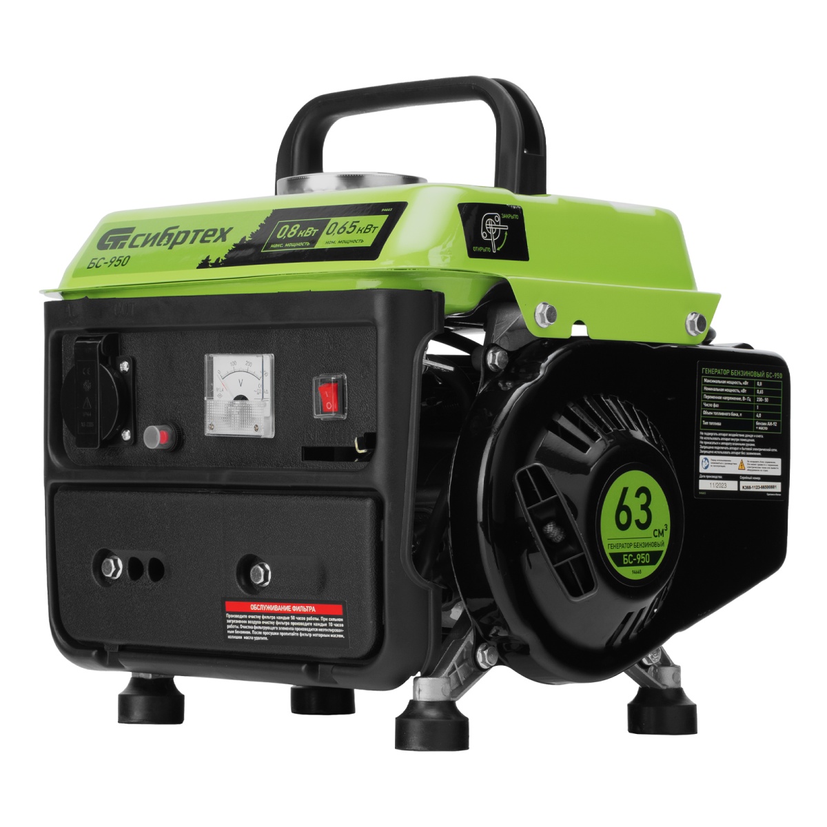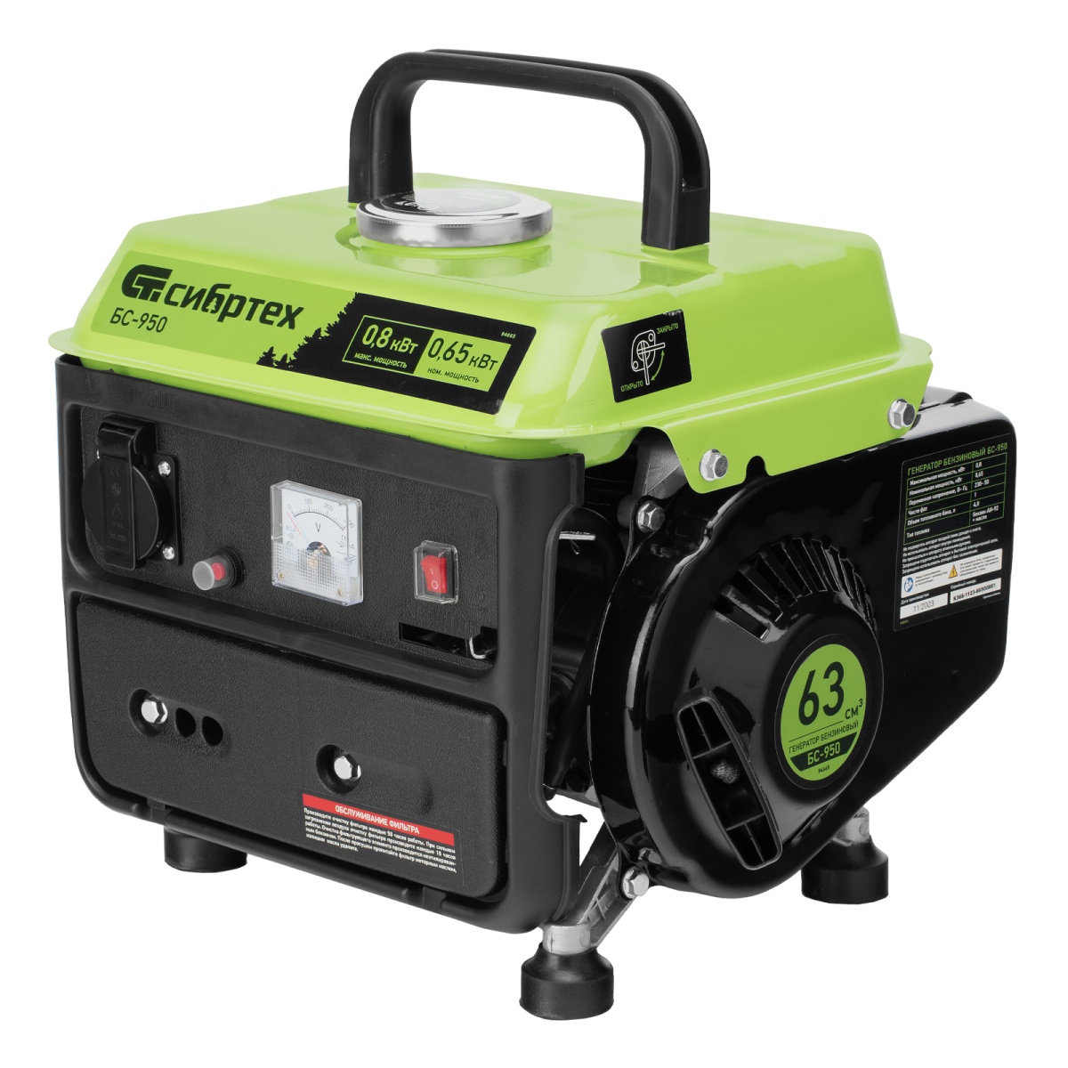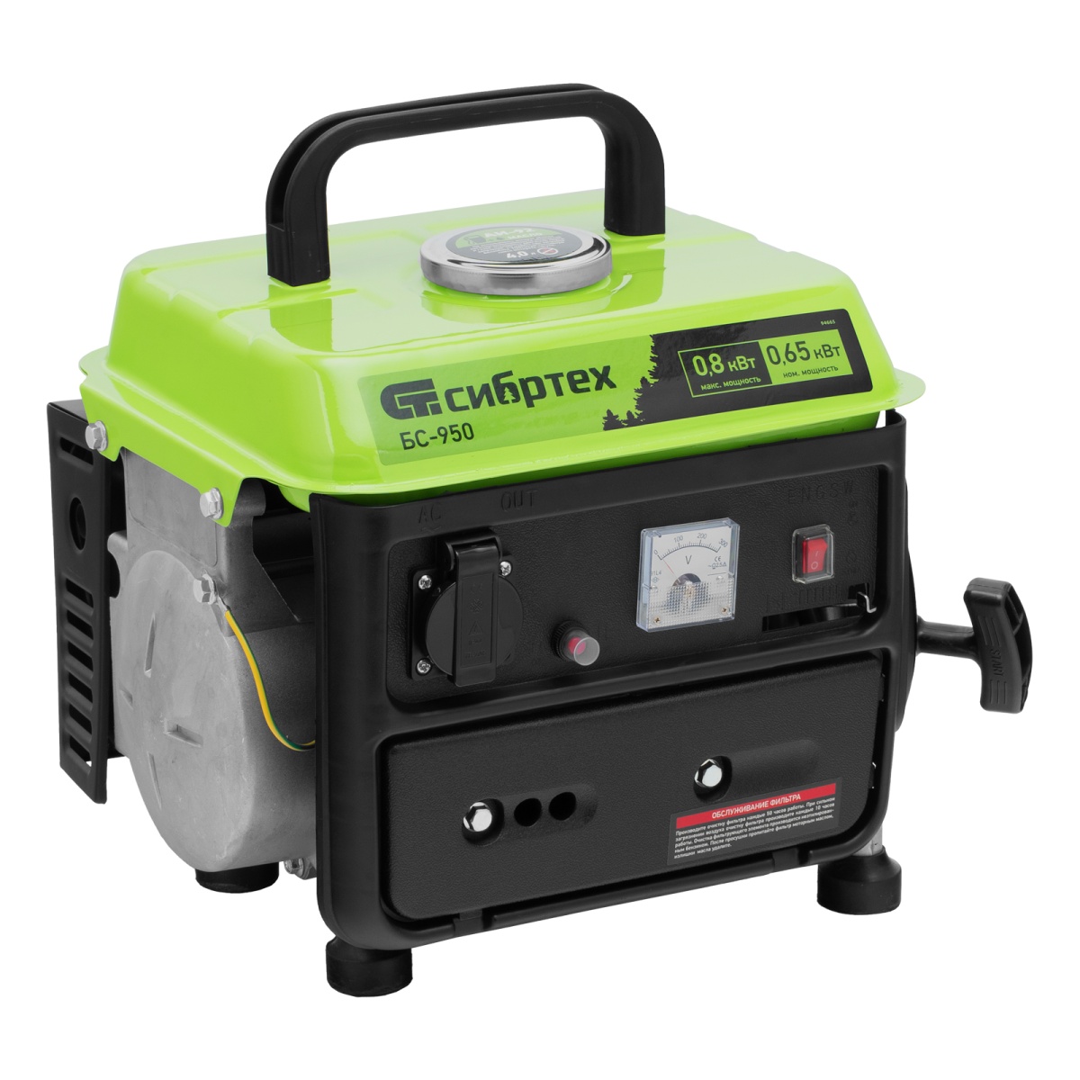 Бензиновый генератор Сибртех БС-950 94665 на 230 В, мощностью 0,8 кВТ, с 2-тактным двигателем и ручным стартером, с баком объемом 4 л, отличается небольшими габаритами, что делает его незаменимым на природе, на рыбалке, на даче или в гараже. Мощности 0,8 кВт достаточно для подключения электроинструмента или приборов с небольшим уровнем потребления энергии. На одной заправке генератор способен проработать до 4 часов.ПреимуществаНадежность — корпус из прочного пластика устойчив к механическим повреждениям.Контроль работы — вольтметр на панели управления позволяет отслеживать напряжение в системе.Безопасная работа — предохранитель отключает двигатель при перегрузке, что предотвращает поломку генератора.Простое обслуживание — в комплект входит свечной ключ и отвертка, их не нужно приобретать отдельно.Устойчивость — резиновые опоры обеспечивают надежное положение во время работы, а также уменьшают вибрации и снижают уровень шума.Удобная транспортировка — генератор весит 15,5 кг, на его корпусе имеется ручка.