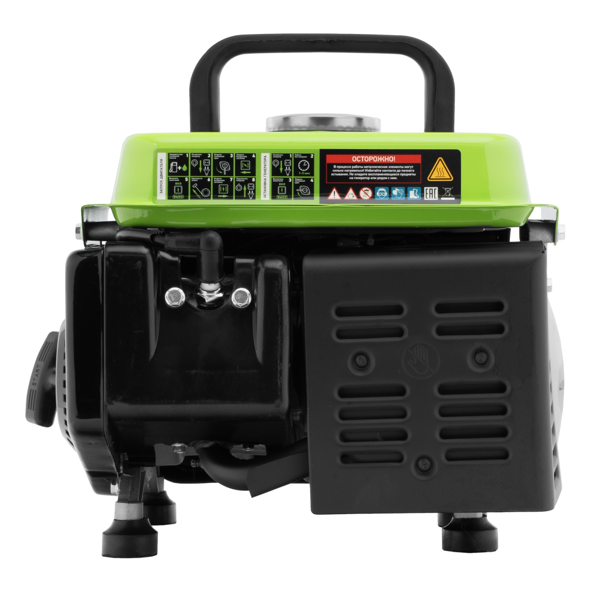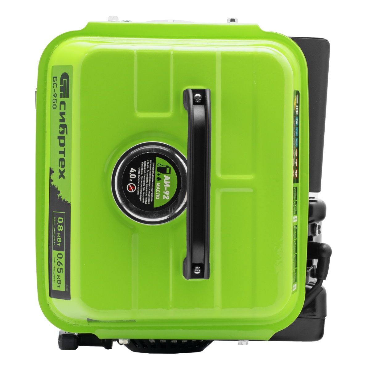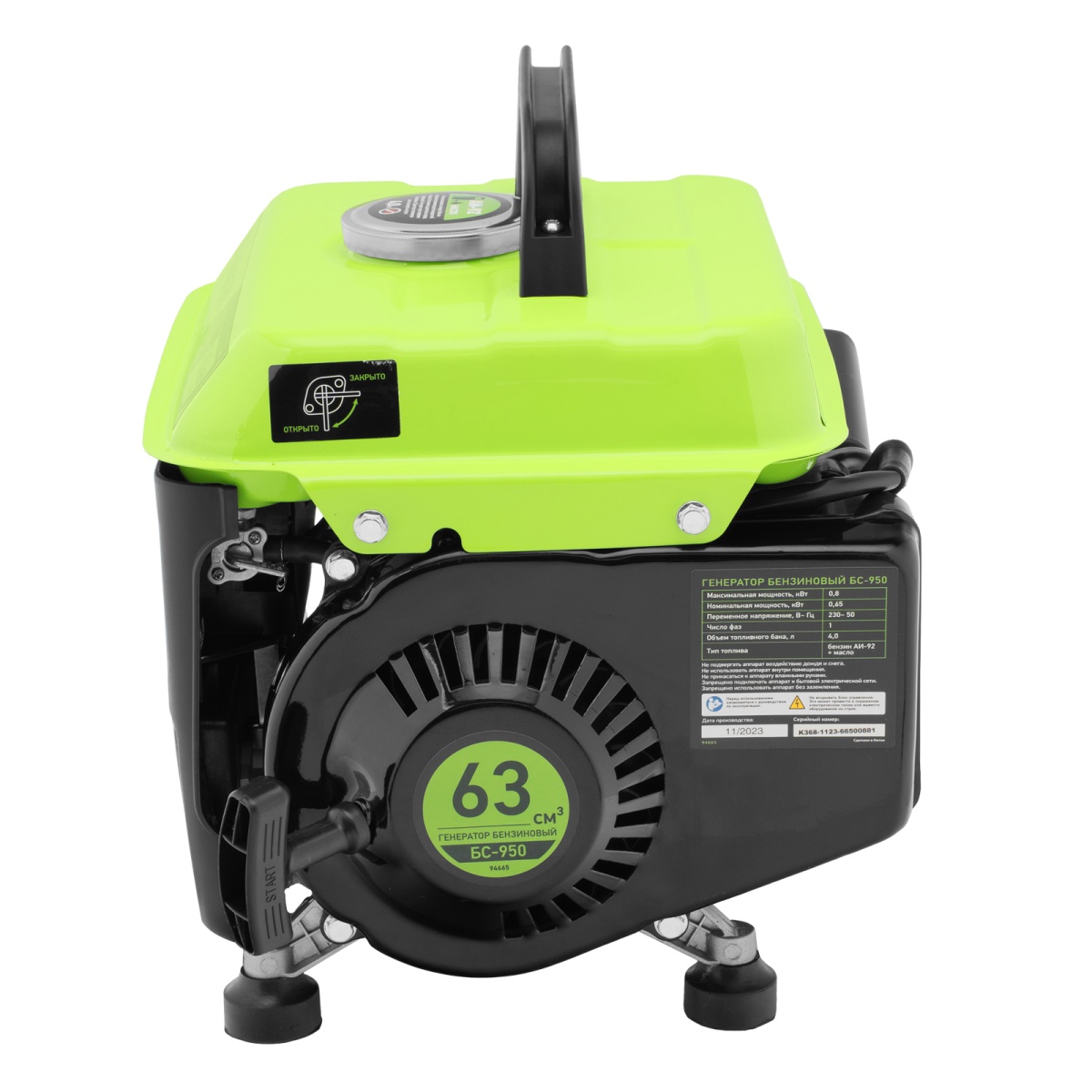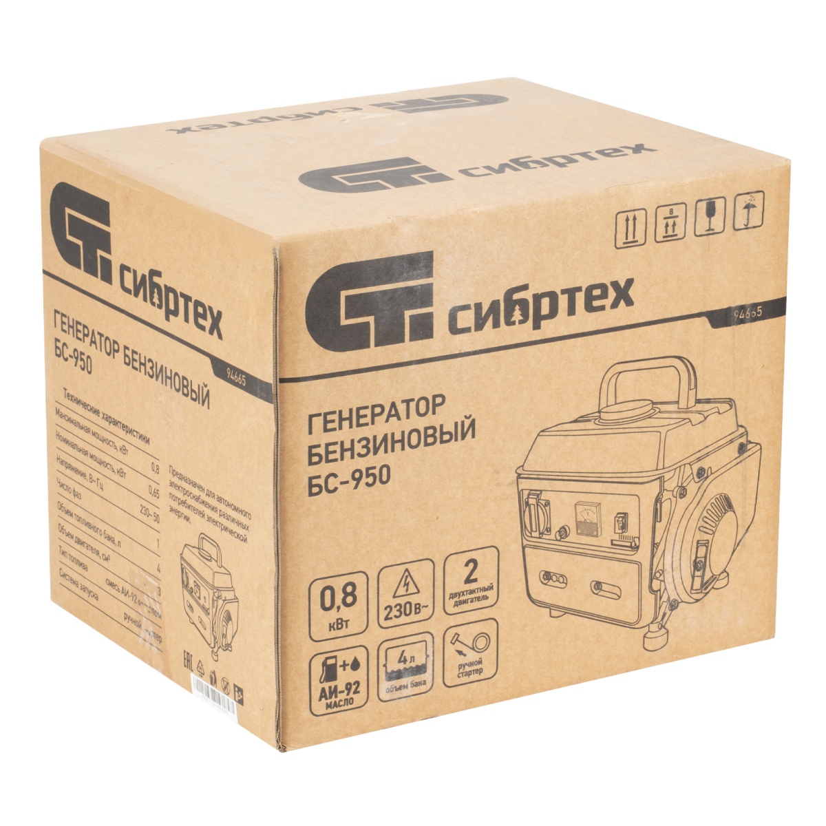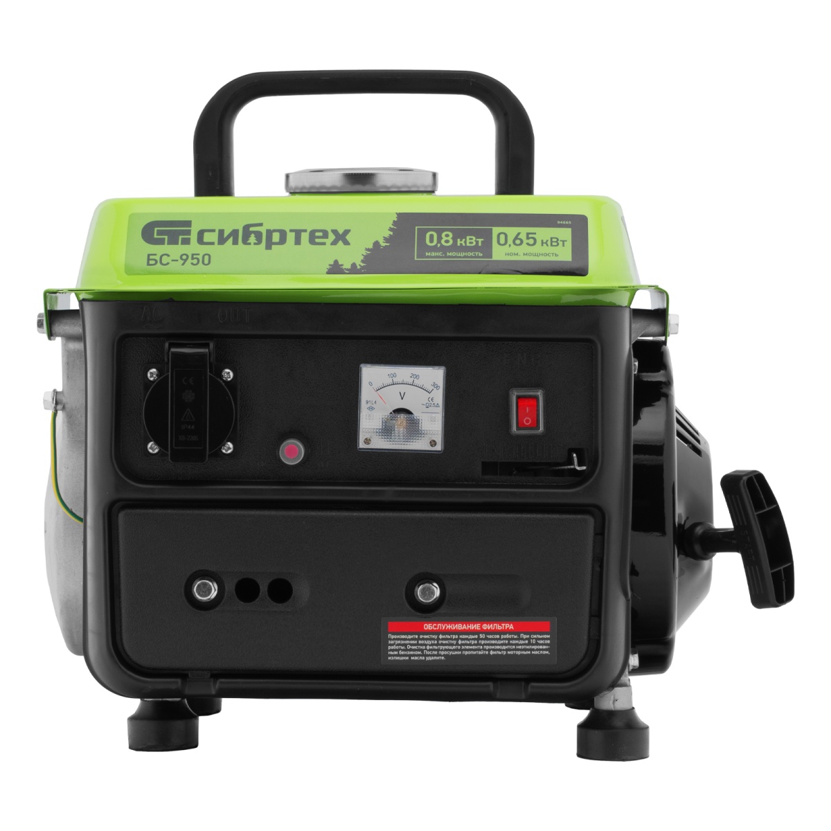 Бензиновый генератор Сибртех БС-950 94665 на 230 В, мощностью 0,8 кВТ, с 2-тактным двигателем и ручным стартером, с баком объемом 4 л, отличается небольшими габаритами, что делает его незаменимым на природе, на рыбалке, на даче или в гараже. Мощности 0,8 кВт достаточно для подключения электроинструмента или приборов с небольшим уровнем потребления энергии. На одной заправке генератор способен проработать до 4 часов.ПреимуществаНадежность — корпус из прочного пластика устойчив к механическим повреждениям.Контроль работы — вольтметр на панели управления позволяет отслеживать напряжение в системе.Безопасная работа — предохранитель отключает двигатель при перегрузке, что предотвращает поломку генератора.Простое обслуживание — в комплект входит свечной ключ и отвертка, их не нужно приобретать отдельно.Устойчивость — резиновые опоры обеспечивают надежное положение во время работы, а также уменьшают вибрации и снижают уровень шума.Удобная транспортировка — генератор весит 15,5 кг, на его корпусе имеется ручка.