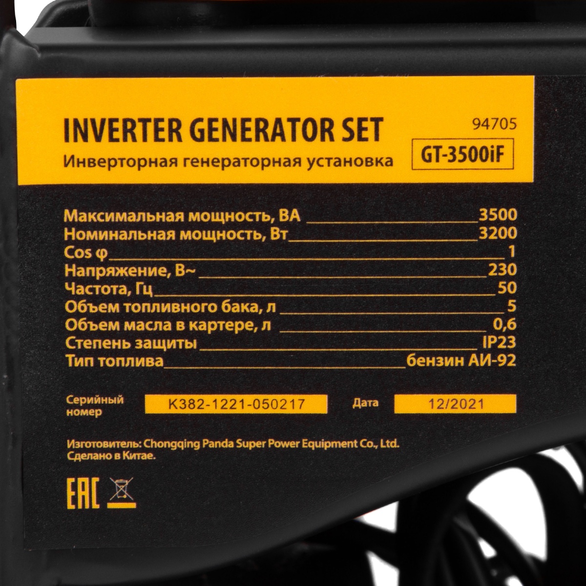 Инверторный генератор Denzel GT-3500iF 94705 мощностью 3,5 кВт, в открытом корпусе, с ручным стартом, — легкий и экономичный, но при этом достаточно мощный, с ним легко справится даже неопытный пользователь. Идеально подходит для использования на даче, в гараже, в мастерской и на природе. Четырехтактный двигатель Genzel Long Life мощностью 7 л.с. и объемом 212 куб. см работает стабильно и имеет относительно невысокий уровень шума (97 дБ) и вибраций. Прочная рама защищает рабочие элементы от повреждений в процессе работы и транспортировки.