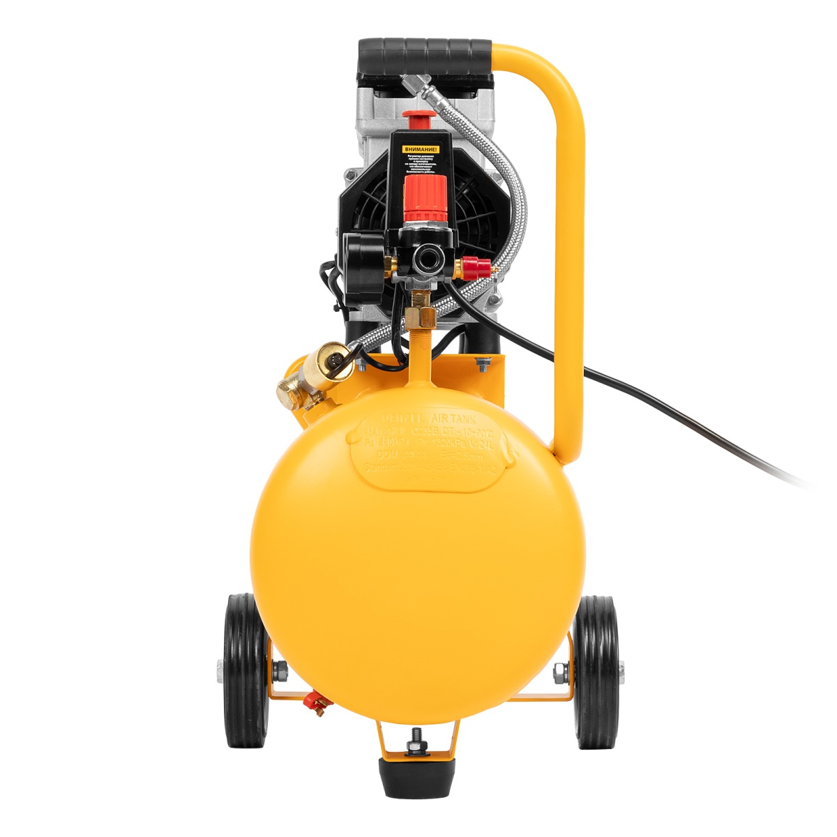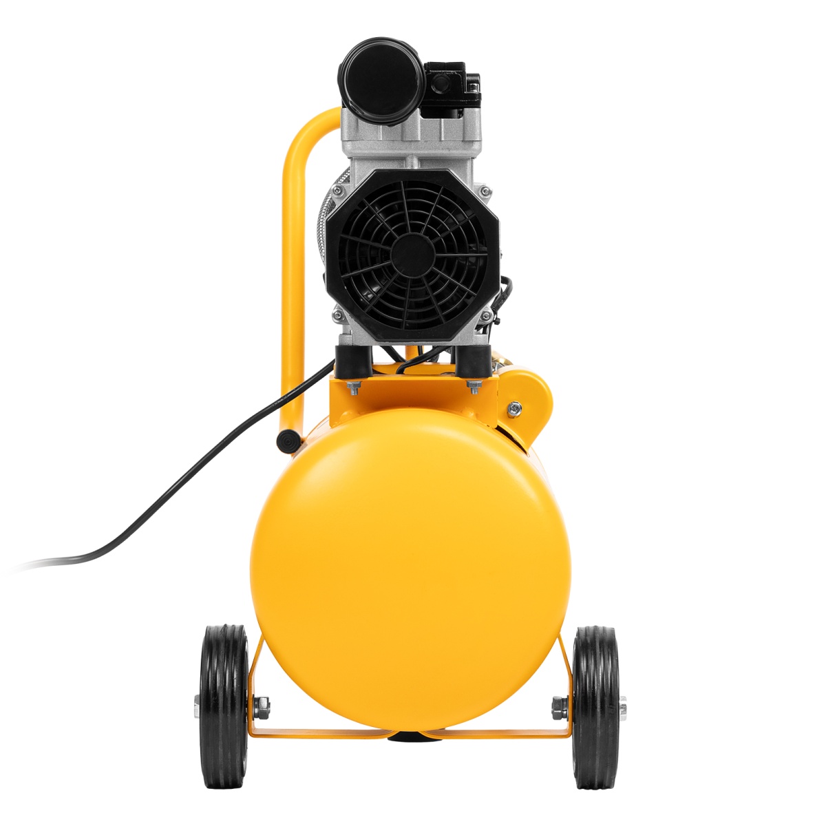 Компрессор Denzel DLS950/24 работает по безмасляной технологии RTFE. В сжатом воздухе не содержатся примеси масла, что делает возможной работу в условиях, требующих чистого воздуха. К устройству можно подключать обдувочные пистолеты, распылители лакокрасочных материалов и другие пневмоинструменты. Допускается использование не только в домашних условиях, но и на сельскохозяйственных предприятиях и коммунальном хозяйстве. Благодаря отсутствию масла модель отличается своей экологичностью и простым обслуживанием.Мощность 0.95 кВт и двухцилиндровая конструкция позволили добиться производительности в 165 л/мин. При этом отличительная особенность модели - это низкий уровень шума. Окружающие не ощутят дискомфорта от работающей установки благодаря наличию двух цилиндров и невысоким оборотам мотора (1400 об/мин).Преимущества:Прочные материалы - ресивер на 24 л изготовлен из высококачественной стали, прошел особый контроль сварочных соединений и покрыт антикоррозийной краской, поэтому прослужит долгие годы.Надежный воздушный фильтр минимизирует сопротивление потоку и не снижает производительность, а резиновый уплотнитель предотвращает попадание воздуха в ресивер в обход фильтра.Комфортно отслеживать параметры работы - 2 манометра позволяют контролировать давление в ресивере и пневмомагистрали, и при необходимости корректировать его.Защита от разрушения - предохранительный клапан отвечает за автоматический сброс лишнего давления, что исключает аварийные ситуации.Сниженная нагрузка на двигатель - благодаря ребристой поверхности цилиндров и использованию материалов с низким коэффициентом трения повышается износоустойчивость основных узлов и улучшается теплоотвод.Встроенная тепловая защита - работа устройства останавливается при нагреве двигателя выше допустимой температуры, что повышает долговечность компрессора и обеспечивает пожаробезопасность.Автоматический запуск - если давление упадет ниже 6 атмосфер, система самостоятельно возобновит работу, таким образом обеспечивается давление в диапазоне 6-8 бар.Наличие транспортировочных колес и ручки - перемещать изделие очень просто, не составит труда даже перевозка на большие расстояния.Безопасность и высокая устойчивость - резиновые ножки гасят вибрации и удерживают компрессор на месте в процессе работы.Повышенная ударопрочность - корпус полностью изготовлен из металла (в том числе корпус фильтра), поэтому его трудно повредить.Продуманная конструкция сливной пробки - подпальцевые упоры значительно упрощают откручивание, особенно в случае ее закисания.