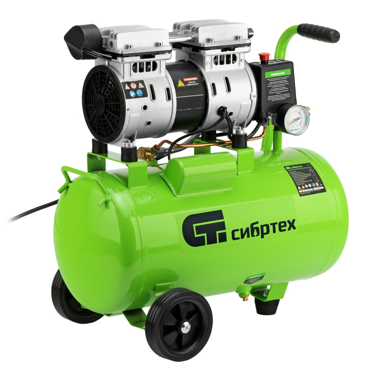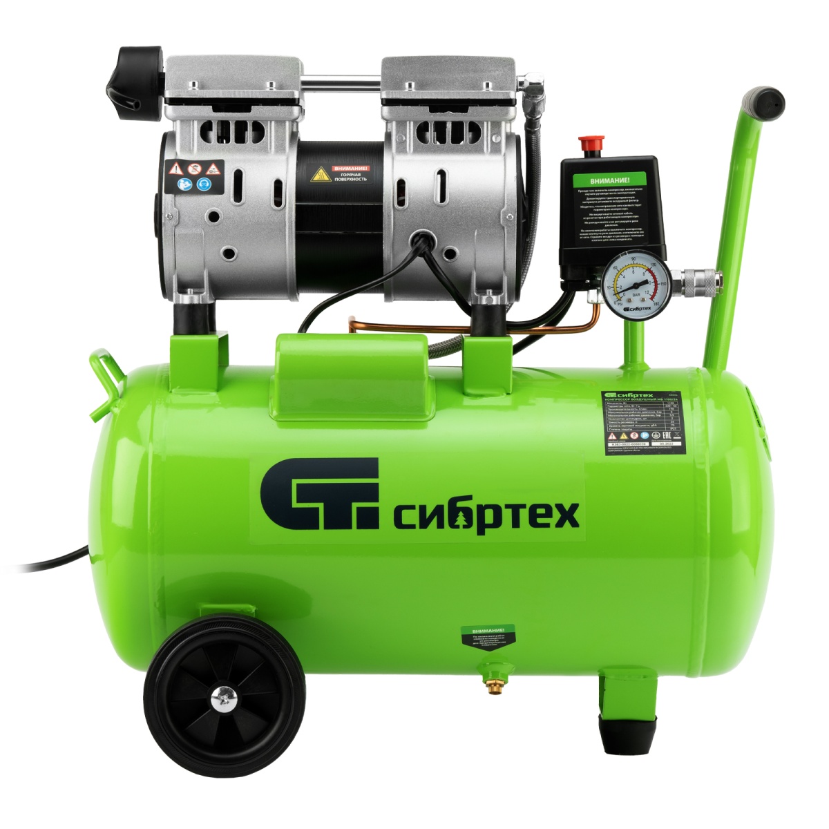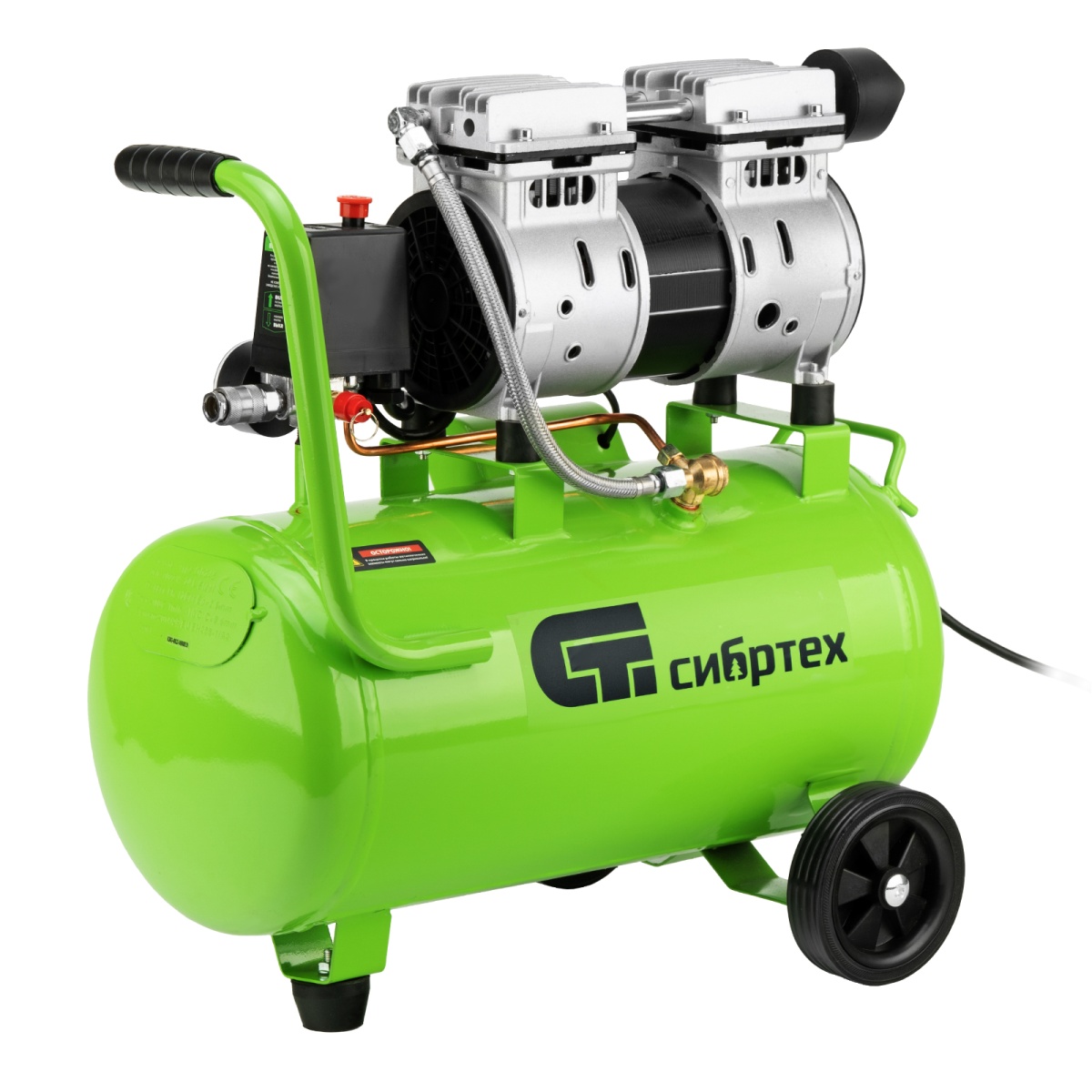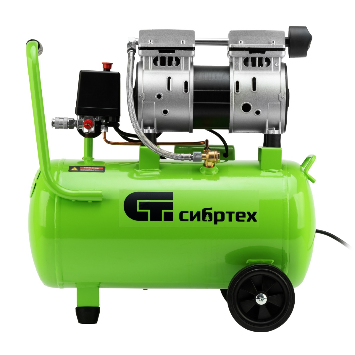 Безмасляный малошумный компрессор Сибртех МБ 1100/24 58006 мощностью 1100 Вт и объемом ресивера 24 л имеет производительность на входе 170 л/мин и сжимает воздух под давлением до 8 бар. Используется для обеспечения функционирования пневмоинструмента, например, краскораспылителя или пневматического шуруповерта. Для работы устройства не требуется масло, поэтому воздух на выходе не содержит его частиц. Компрессор оптимален для проведения покрасочных работ и продувки электронных компонентов.Одна из ключевых особенностей компрессора — низкий уровень шума (не превышает 70 дБ), позволяющий использовать устройство в жилом помещении без дискомфорта для людей.ПреимуществаТермозащита — при превышении допустимой температуры двигатель останавливается, что предотвращает его поломку.Простое подключение — выходной быстросъемный коннектор позволяет подсоединить пневмоинструмент одним движением.Контроль рабочих параметров — компрессор оборудован механическим манометром для отслеживания давления.Безопасная работа — предохранительный клапан защищает от превышения максимально допустимого давления.Автономная работа — реле давления останавливает двигатель по достижении максимального рабочего давления и запускает его, если давление опускается до минимального.Продуманная конструкция — виброопора обеспечивает устойчивость компрессора и гасит колебания, возникающие во время работы.Комфортная транспортировка — производителем предусмотрена ручка и 2 колеса для перемещения.