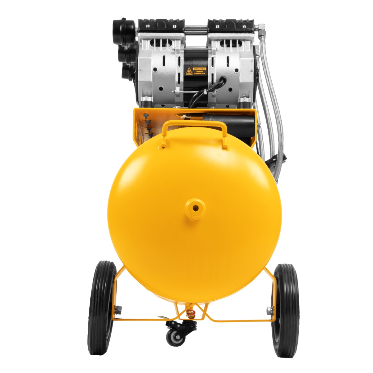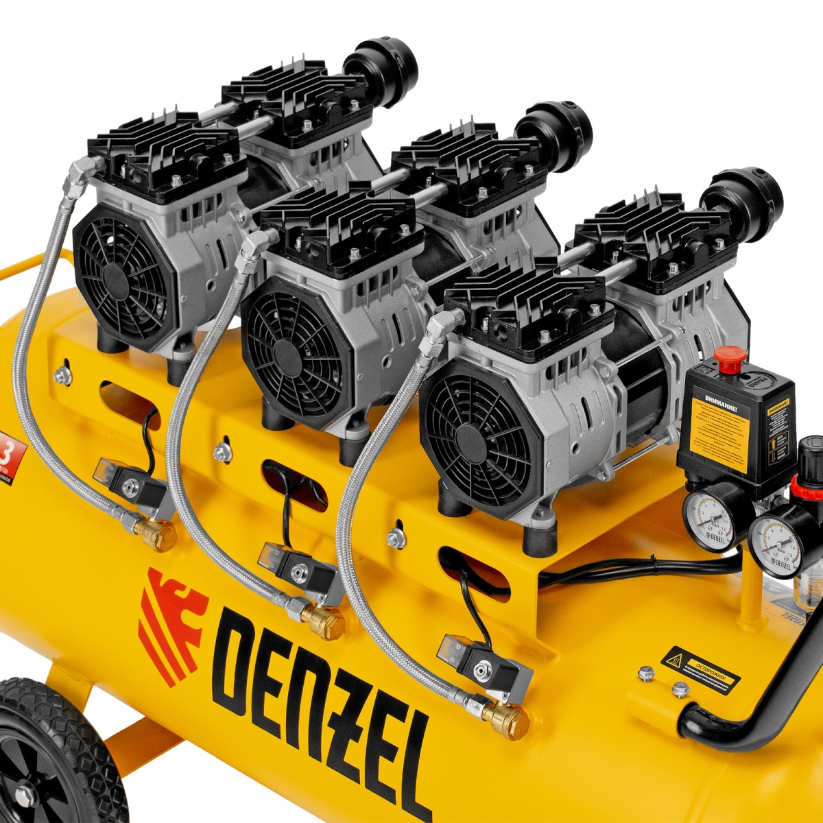Безмасляный малошумный компрессор Denzel DLS 1800/100 58028 мощностью 1800 (3 х 600) Вт, объемом ресивера 100 л и производительностью 345 л/мин предназначен для обеспечения пневмоинструмента сжатым воздухом, подаваемым под давлением до 8 бар. Позволяет подключить пневматический заклепочник, дрель, шлифмашину и т. д. Оптимален для работы с краскопультом и для продувки электронных компонентов, т. к. в сжатом воздухе отсутствуют частицы масла. Компрессор пригодится в мастерской, гараже, на строительной площадке.ПреимуществаНизкий уровень шума — работа компрессора не вызывает дискомфорт, его можно использовать в помещении или на дачном участке.Высокий ресурс — цилиндры с антифрикционным покрытием обладают повышенной устойчивостью к износу.Термозащита — в случае превышения максимально допустимой температуры двигатель останавливается для предотвращения выхода из строя.Автономность — реле давления обеспечивает автоматическое отключение двигателя по достижении максимального рабочего давления и его запуск после снижения давления до минимального.Регулятор давления на выходе — можно выбрать оптимальный режим подачи воздуха в соответствии с характеристиками пневмоинструмента.Безопасная работа — клапан сброса избыточного давления предотвращает возникновение аварийных ситуаций.Высокое качество очистки воздуха — фильтры надежно задерживают посторонние частицы, а влагоотделитель препятствует попаданию конденсата в пневмомагистраль.Контроль давления в ресивере и на выходной магистрали — компрессор оборудован двумя манометрами.Простая подготовка к работе — благодаря быстросъемному выходному коннектору подключение пневмоинструмента занимает несколько секунд.Быстрое удаление конденсата — сливной клапан легко откручивается без использования инструмента.Снижение уровня вибраций — резиновые опоры гасят колебания, возникающие во время работы.Мобильность — компрессор оборудован ручкой и 3 колесами (из них 1 поворотное) для удобного разворота и перемещения.Гарантия 3 года — надежность компрессора подтверждена производителем.