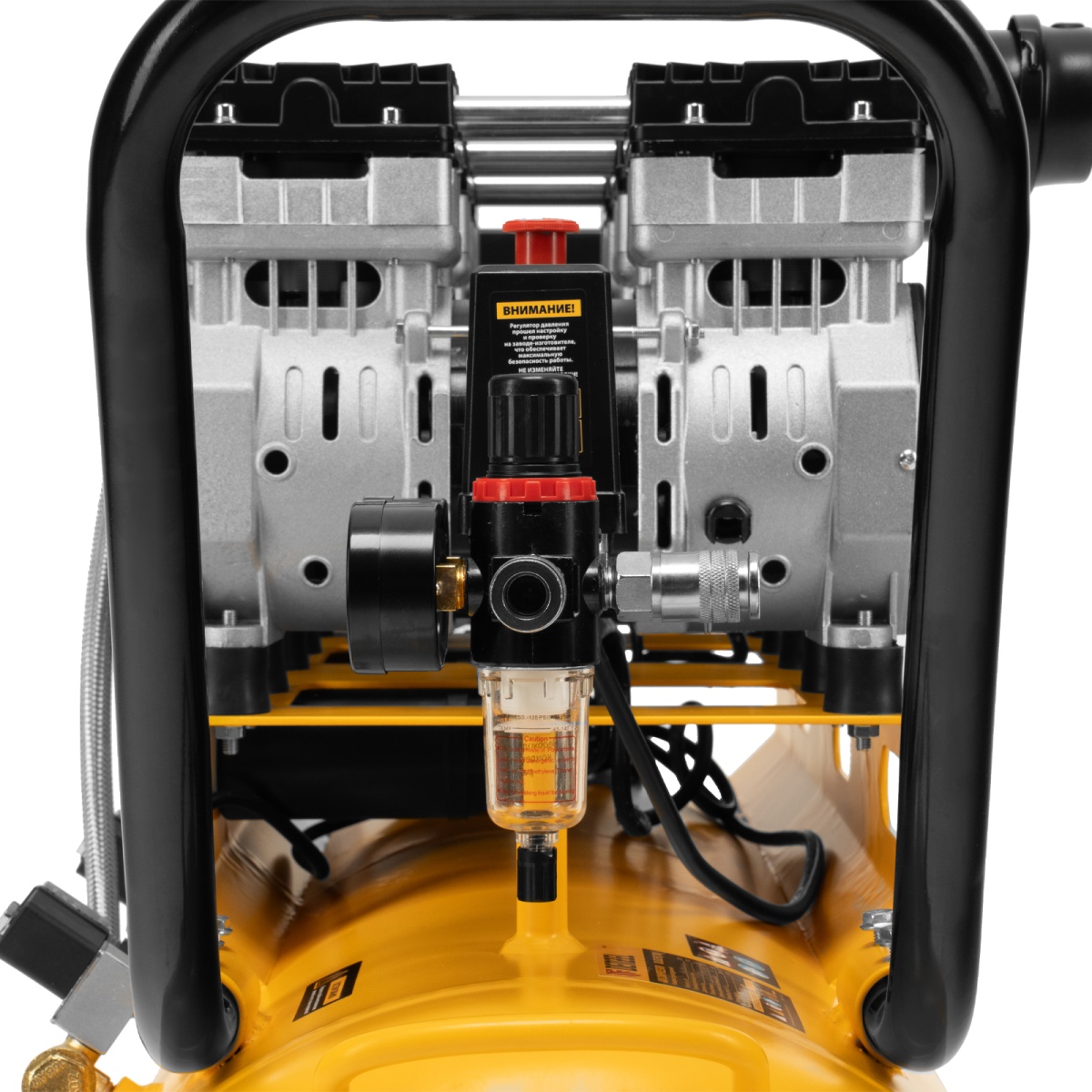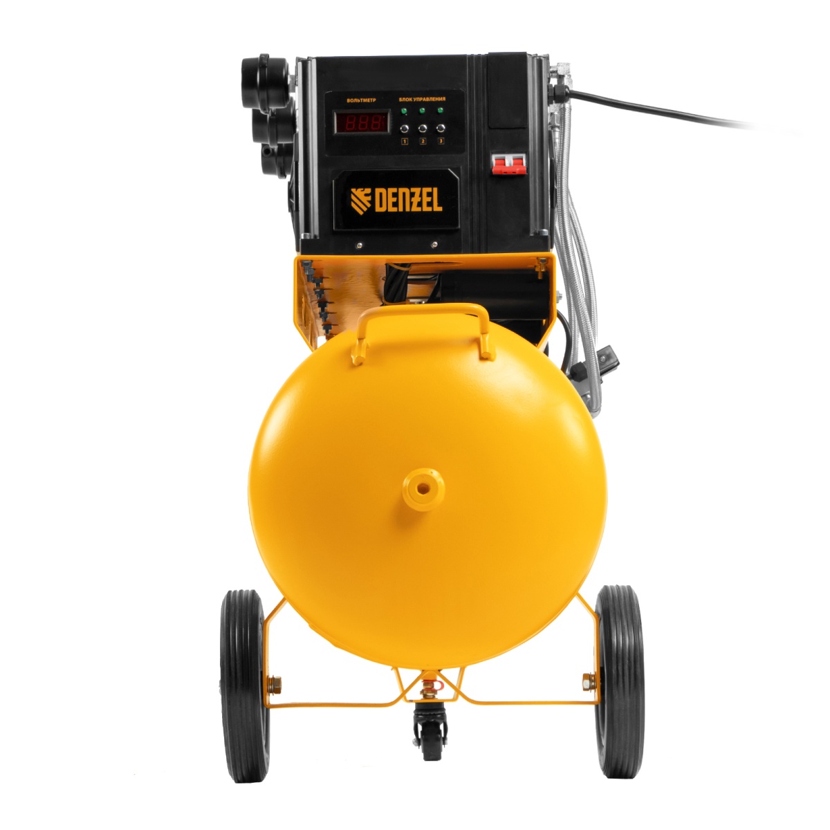 Безмасляный малошумный компрессор Denzel DLS 2550/100 58029 с блоком управления, мощностью 2250 (3 х 750) Вт, объемом ресивера 100 л и производительностью 410 л/мин предназначен для обеспечения пневмоинструмента сжатым воздухом, подаваемым под давлением до 8 бар. Позволяет подключить пневматический заклепочник, дрель, шлифмашину и т. д. Оптимален для работы с краскопультом и для продувки электронных компонентов, т. к. в сжатом воздухе отсутствуют частицы масла. Компрессор пригодится в мастерской, гараже, на строительной площадке.ПреимуществаУдобный блок управления — в зависимости от поставленных задач можно включать каждый из 3 компрессорных блоков по отдельности или все сразу, что позволяет экономить электроэнергию и снижать уровень шума, а также повышает ресурс компрессора.Низкий уровень шума — работа компрессора не вызывает дискомфорт, его можно использовать в помещении или на дачном участке.Высокий ресурс — цилиндры с антифрикционным покрытием обладают повышенной устойчивостью к износу.Термозащита — в случае превышения максимально допустимой температуры двигатель останавливается для предотвращения выхода из строя.Автономность — реле давления обеспечивает автоматическое отключение двигателя по достижении максимального рабочего давления и его запуск после снижения давления до минимального.Регулятор давления на выходе — можно выбрать оптимальный режим подачи воздуха в соответствии с характеристиками пневмоинструмента.Безопасная работа — клапан сброса избыточного давления предотвращает возникновение аварийных ситуаций.Высокое качество очистки воздуха — фильтры надежно задерживают посторонние частицы, а влагоотделитель препятствует попаданию конденсата в пневмомагистраль.Контроль давления в ресивере и на выходной магистрали — компрессор оборудован двумя манометрами.Простая подготовка к работе — благодаря быстросъемному выходному коннектору подключение пневмоинструмента занимает несколько секунд.Быстрое удаление конденсата — сливной клапан легко откручивается без использования инструмента.Снижение уровня вибраций — резиновые опоры гасят колебания, возникающие во время работы.Мобильность — компрессор оборудован ручкой и 3 колесами (из них 1 поворотное) для удобного разворота и перемещения.Гарантия 3 года — надежность компрессора подтверждена производителем.