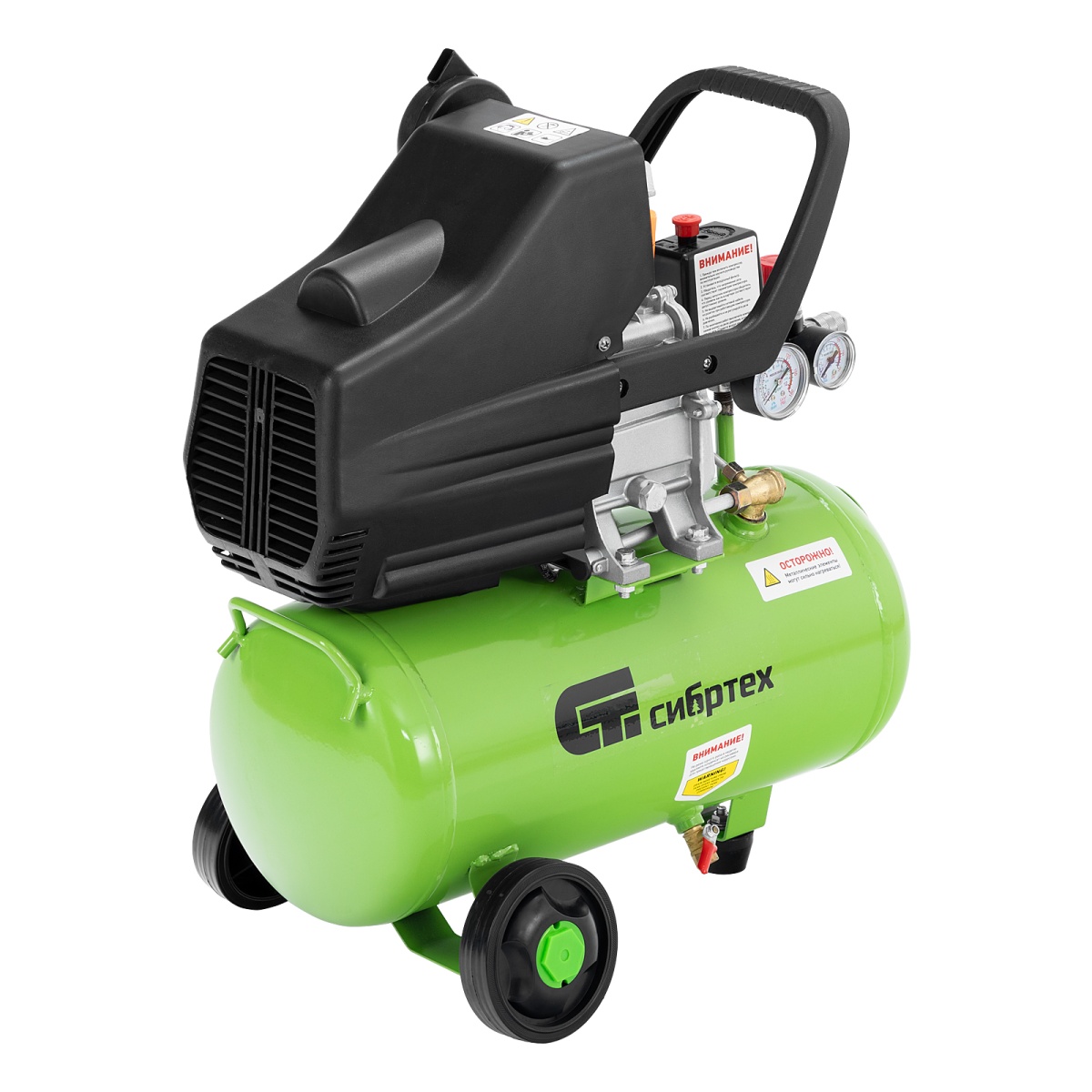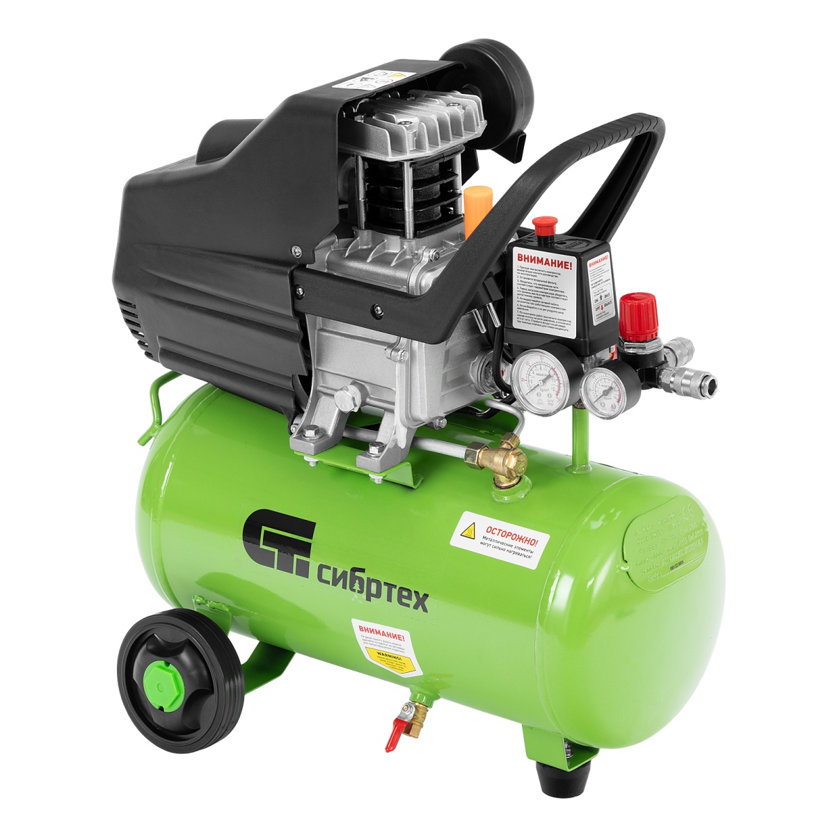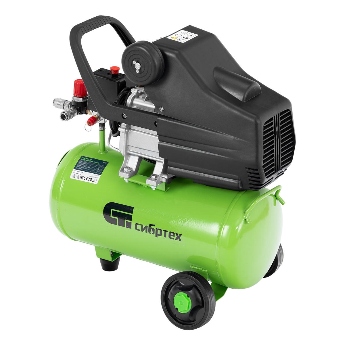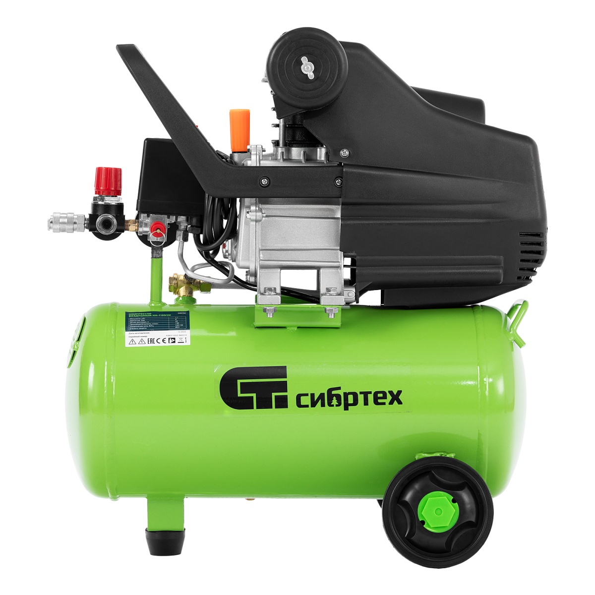 Компактный и бюджетный компрессор Сибртех КК-1100/22 применяется для небольших ремонтных операций, подкачки шин, обслуживания насосов, продувки деталей. Его удобно использовать с дрелями, гайковертами, степлерами, распылителями строительных смесей - масляные пары попадают в пневмоинструмент и смазывают трущиеся детали, защищая их от износа.Пневматическое оборудование обеспечивается сжатым воздухом со скоростью 135 л/мин. Ресивер объемом 22 литра заполняется менее чем за 2 минуты.Преимущества:Безопасная работа - двигатель имеет защиту по току и в случае перегрузки оперативно выключается, что оберегает обмотку от оплавления. А пластиковый кожух предотвращает внешнее повреждение основного узла.Термозащита - двигатель надежно предохраняется от перегрева, это позволяет избежать повреждений и сбоев в его работе.Очистка воздуха - в двигатель не попадают твердые частички, потому что воздушный поток перед подачей проходит через поролоновый фильтр.2 манометра - оператор может контролировать давление сжатого воздуха в ресивере и на выходе, и корректировать работу компрессора в зависимости от показаний.Наличие масла в новом изделии - каждый компрессор поставляется с маслом, что экономит время перед первым запуском.Качественный сапун - конструкция сапуна позволяет сбрасывать излишнее давление из картера, появляющееся из-за высокой температуры масла во время работы компрессора. Это сберегает прокладки и увеличивает срок службы компрессора.Качество исполнение ресивера - толщина стенок 2.11 мм, обеспечивает прочное соединение в месте сварки и защищает ресивер от внутренних повреждений и коррозии.Уникальный цилиндр - увеличенная площадь поверхности ребер цилиндра способствует лучшему отводу тепла и защите компрессорной части от разрушения.Идеальные стыковочные поверхности - картер дополнительно обработан от неровностей, поэтому даже через несколько лет Вы не столкнетесь с протеканием масла.Слив конденсата - внизу предусмотрен шаровой кран для быстрого избавления от скопившейся влаги.Продуманные пневмоконнекторы - разъемы европейского типа облегчают подключение пневматического инструмента к компрессору.Компактные размеры - компрессор не занимает много места, поэтому впишется даже в небольшой гараж или мастерскую.Высокая устойчивость - за счет широко расставленных колес оборудование надежно держится даже на одной опоре.Легкая транспортировка - удобные колеса помогают перемещать компрессор по рабочей площадке, не поднимая его.