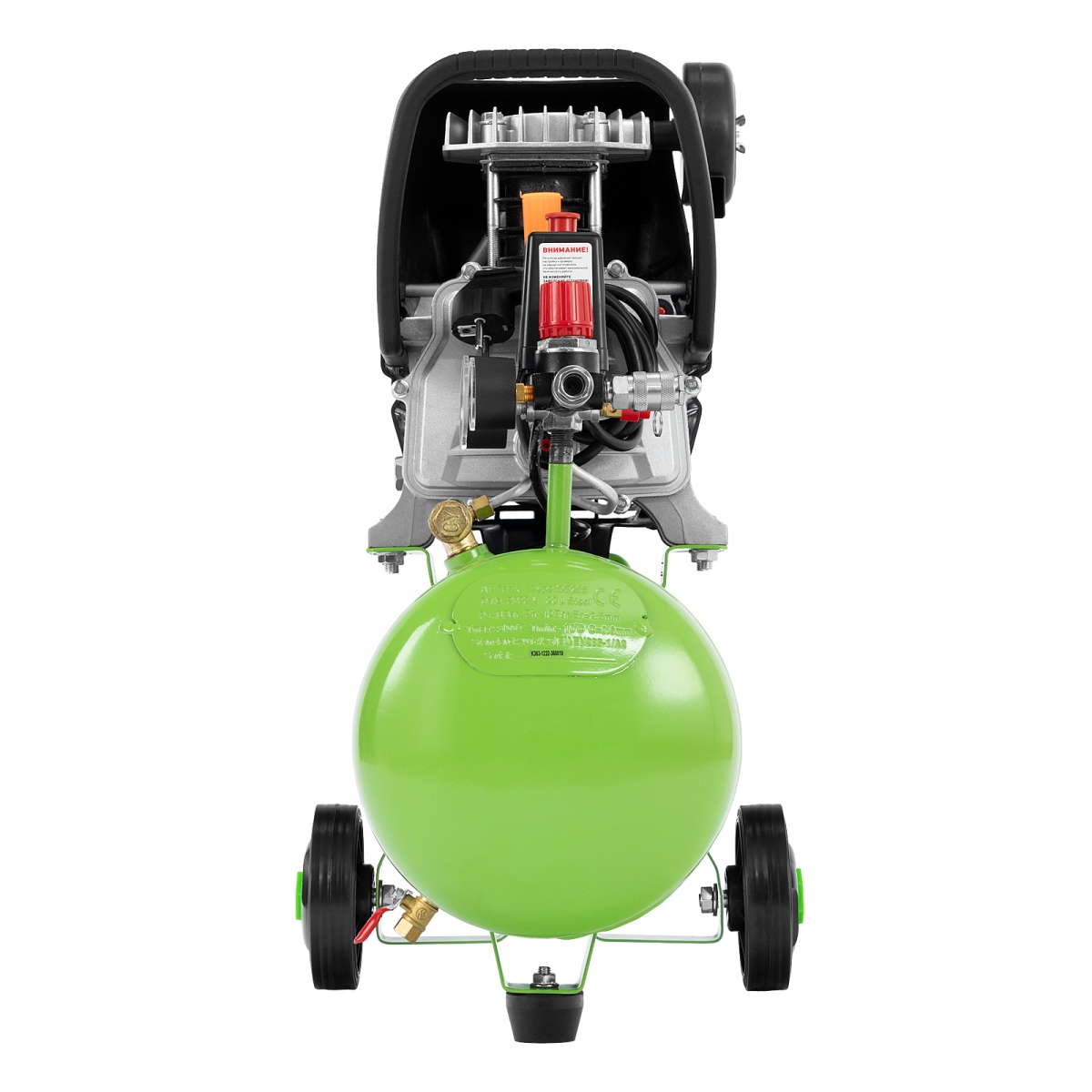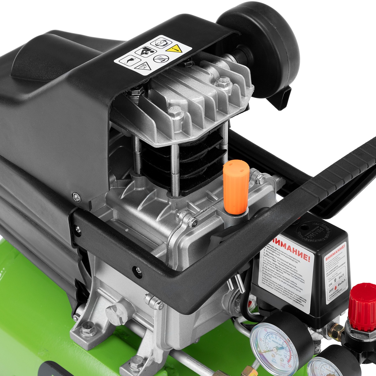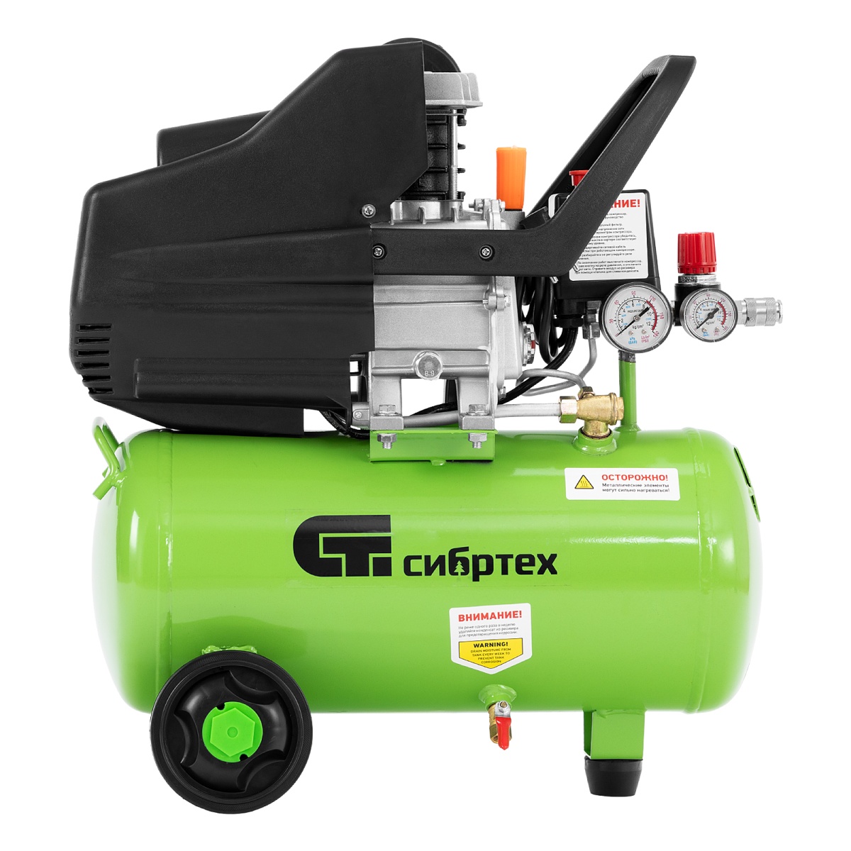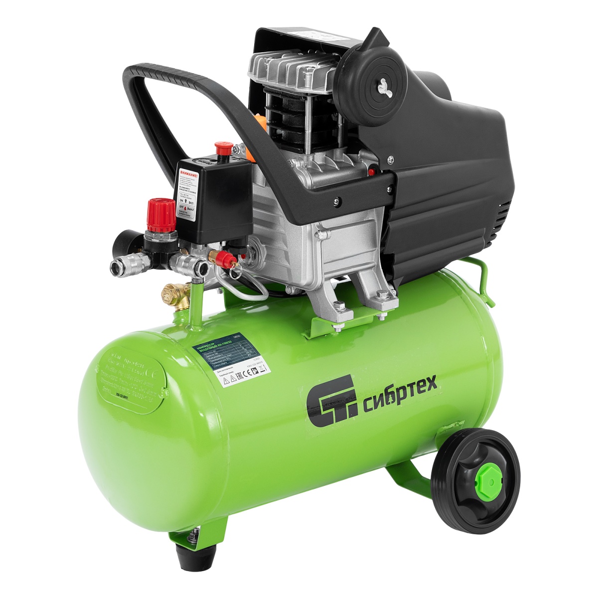 Компактный и бюджетный компрессор Сибртех КК-1100/22 применяется для небольших ремонтных операций, подкачки шин, обслуживания насосов, продувки деталей. Его удобно использовать с дрелями, гайковертами, степлерами, распылителями строительных смесей - масляные пары попадают в пневмоинструмент и смазывают трущиеся детали, защищая их от износа.Пневматическое оборудование обеспечивается сжатым воздухом со скоростью 135 л/мин. Ресивер объемом 22 литра заполняется менее чем за 2 минуты.Преимущества:Безопасная работа - двигатель имеет защиту по току и в случае перегрузки оперативно выключается, что оберегает обмотку от оплавления. А пластиковый кожух предотвращает внешнее повреждение основного узла.Термозащита - двигатель надежно предохраняется от перегрева, это позволяет избежать повреждений и сбоев в его работе.Очистка воздуха - в двигатель не попадают твердые частички, потому что воздушный поток перед подачей проходит через поролоновый фильтр.2 манометра - оператор может контролировать давление сжатого воздуха в ресивере и на выходе, и корректировать работу компрессора в зависимости от показаний.Наличие масла в новом изделии - каждый компрессор поставляется с маслом, что экономит время перед первым запуском.Качественный сапун - конструкция сапуна позволяет сбрасывать излишнее давление из картера, появляющееся из-за высокой температуры масла во время работы компрессора. Это сберегает прокладки и увеличивает срок службы компрессора.Качество исполнение ресивера - толщина стенок 2.11 мм, обеспечивает прочное соединение в месте сварки и защищает ресивер от внутренних повреждений и коррозии.Уникальный цилиндр - увеличенная площадь поверхности ребер цилиндра способствует лучшему отводу тепла и защите компрессорной части от разрушения.Идеальные стыковочные поверхности - картер дополнительно обработан от неровностей, поэтому даже через несколько лет Вы не столкнетесь с протеканием масла.Слив конденсата - внизу предусмотрен шаровой кран для быстрого избавления от скопившейся влаги.Продуманные пневмоконнекторы - разъемы европейского типа облегчают подключение пневматического инструмента к компрессору.Компактные размеры - компрессор не занимает много места, поэтому впишется даже в небольшой гараж или мастерскую.Высокая устойчивость - за счет широко расставленных колес оборудование надежно держится даже на одной опоре.Легкая транспортировка - удобные колеса помогают перемещать компрессор по рабочей площадке, не поднимая его.