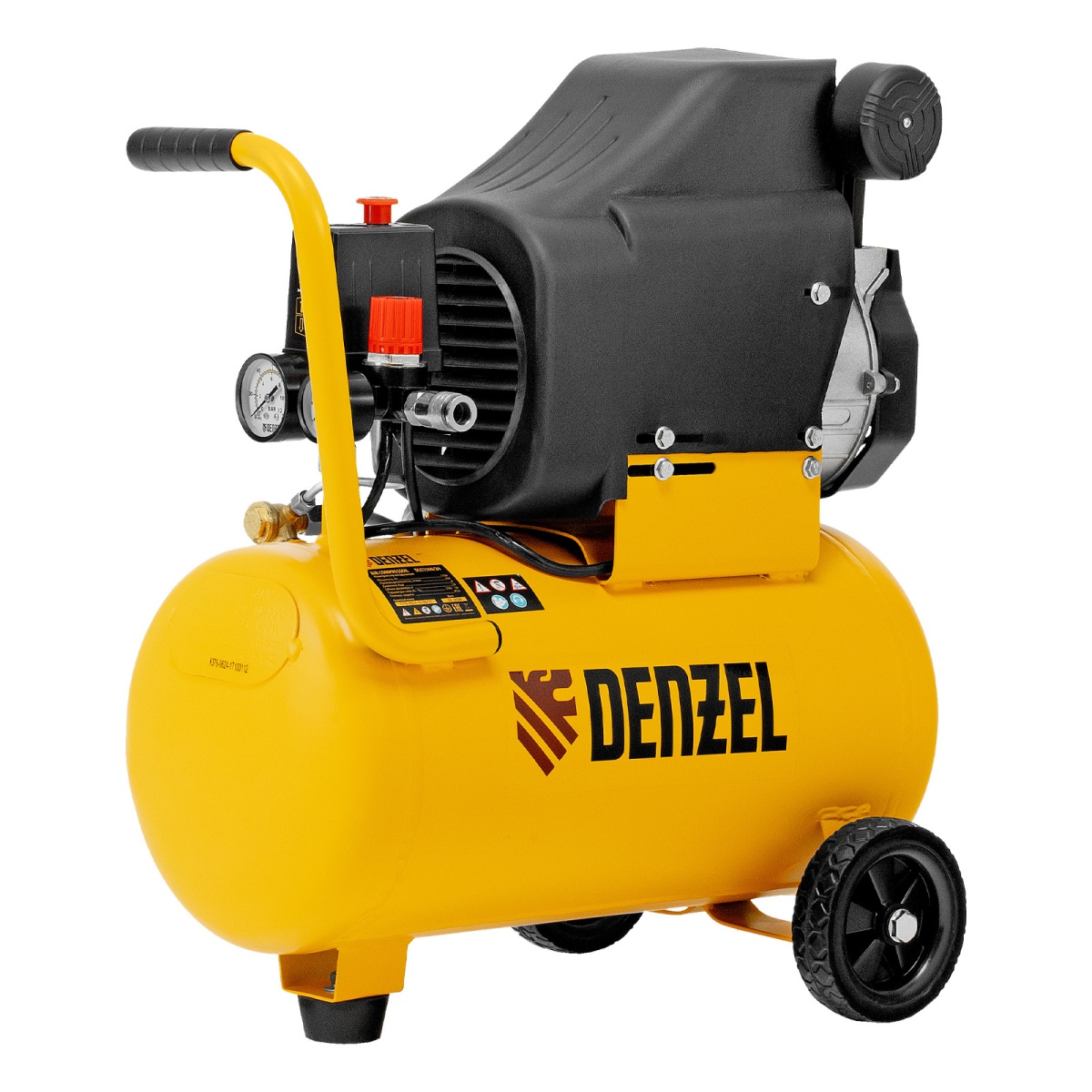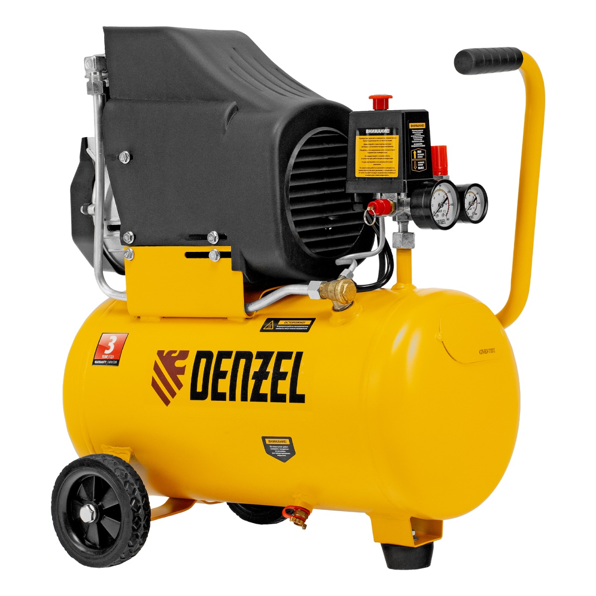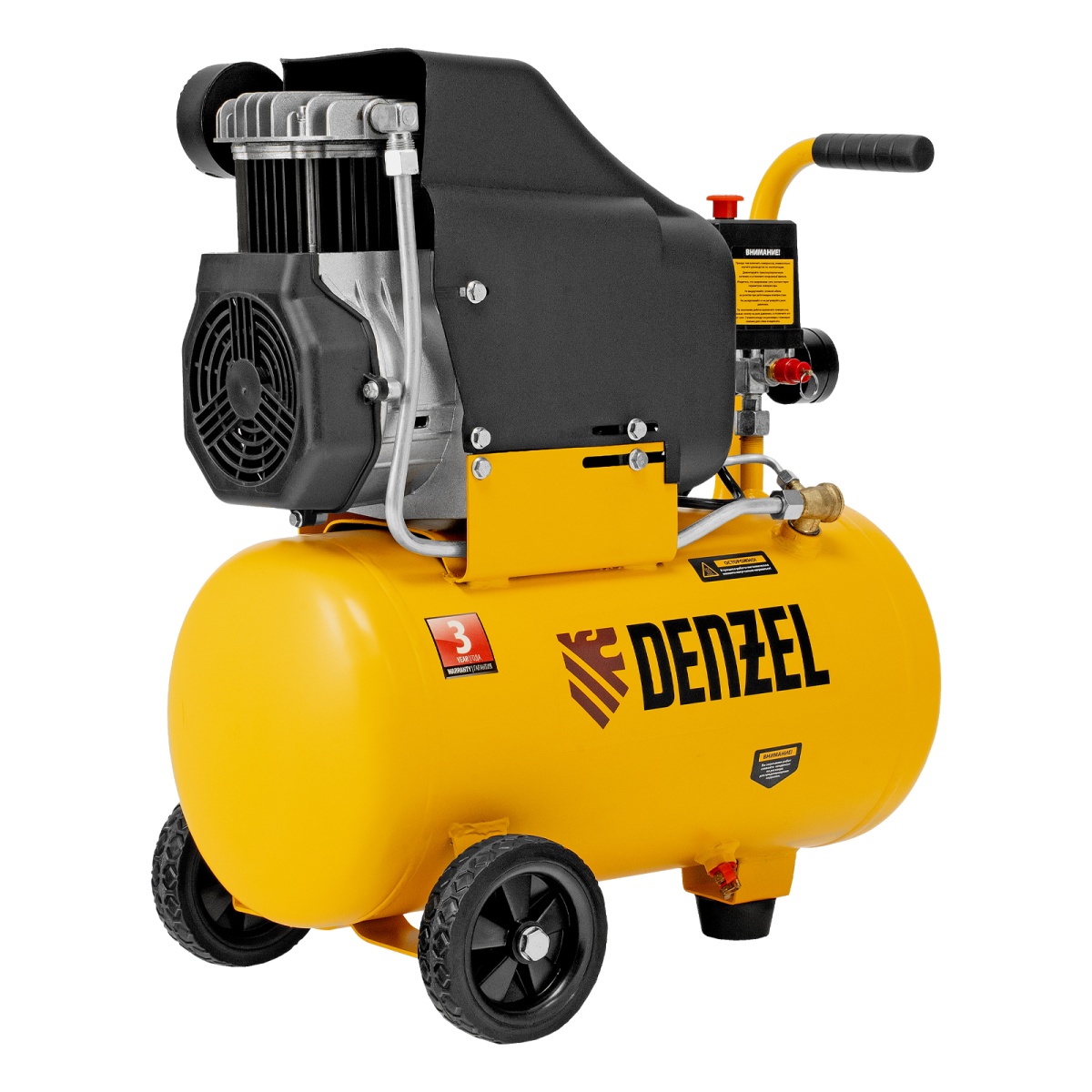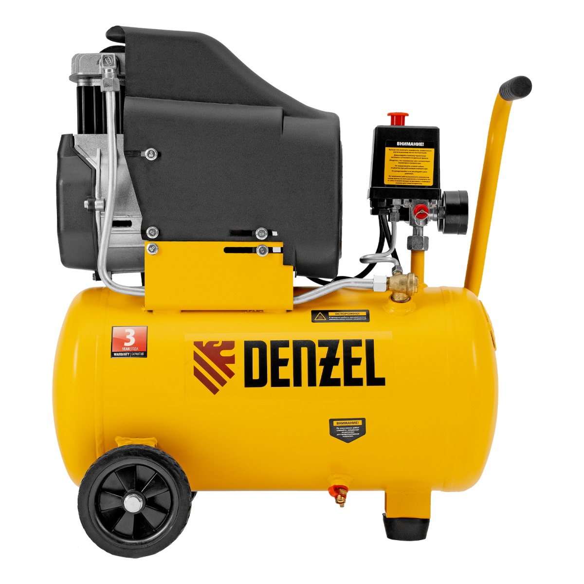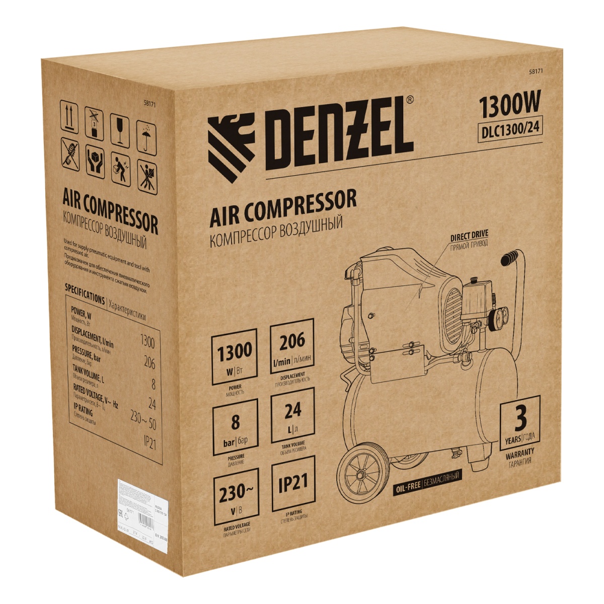 Безмасляный воздушный компрессор Denzel DLC1300/24 58171 мощностью 1,3 кВт, с объемом ресивера 24 л и производительностью на входе 206 л/мин, обеспечивает на выходе чистый сжатый воздух без примесей масла, что позволяет использовать его при окрашивании, креплении паркета и вагонки, продувке электронной техники, накачке шин. Подходит для обеспечения длительной работы пневмоаэрографа, пневмогравера, пневмошуруповерта, пневмодрели и пневмонейлера, а также другого пневмоинструмента. Быстроразъемный коннектор Euro (Rapid) упрощает подключение пневмомагистрали.ПреимуществаТермозащита — предохранитель останавливает работу двигателя при перегреве, что увеличивает срок службы компрессора.Защита по току — в случае перегрузки двигатель отключается для предотвращения поломки.Продуманная конструкция — антифрикционное покрытие цилиндра уменьшает трение, а его ребристая поверхность улучшает теплоотвод, что снижает нагрузку на двигатель.Стабильная работа без потери производительности — фильтр с бумажным картриджем обладает повышенной пропускной способностью.Чистый воздух — уплотнитель на фильтре препятствует попаданию в цилиндр посторонних примесей.Безопасность — предохранительный клапан своевременно сбрасывает избыточное давление, предотвращая аварийную ситуацию.Быстрый слив конденсата — пробка расположена снизу и имеет специальные упоры для откручивания без инструмента.Контроль рабочих параметров — компрессор оснащен двумя манометрами для отслеживания давления в пневмолинии и ресивере.Отсутствие масла — компрессор не нуждается в постоянном техническом обслуживании.Накладки на ножках — компрессор отличается устойчивостью и не испытывает повышенных вибраций во время работы.Мобильность — компрессор, оснащенный ручкой и колесами, весит 22,6 кг, что упрощает его транспортировку.Расширенная 3-летняя гарантия — надежность компрессора подтверждена производителем.