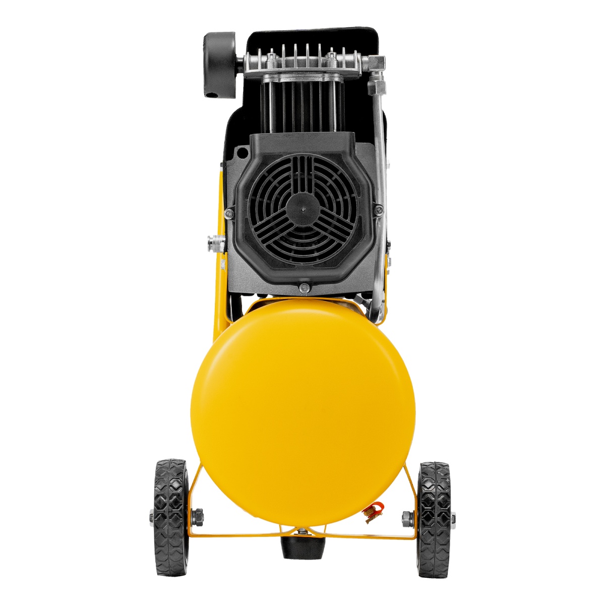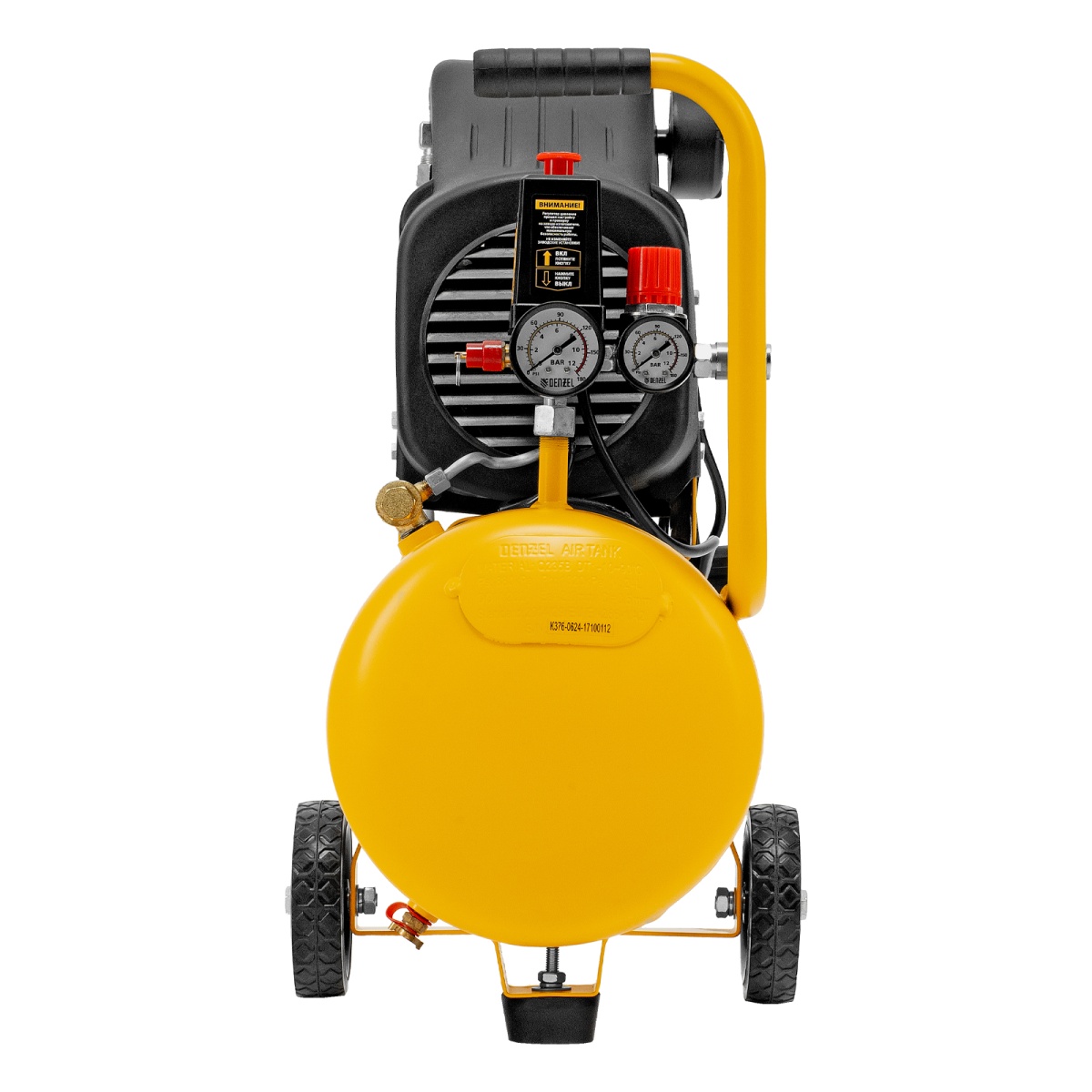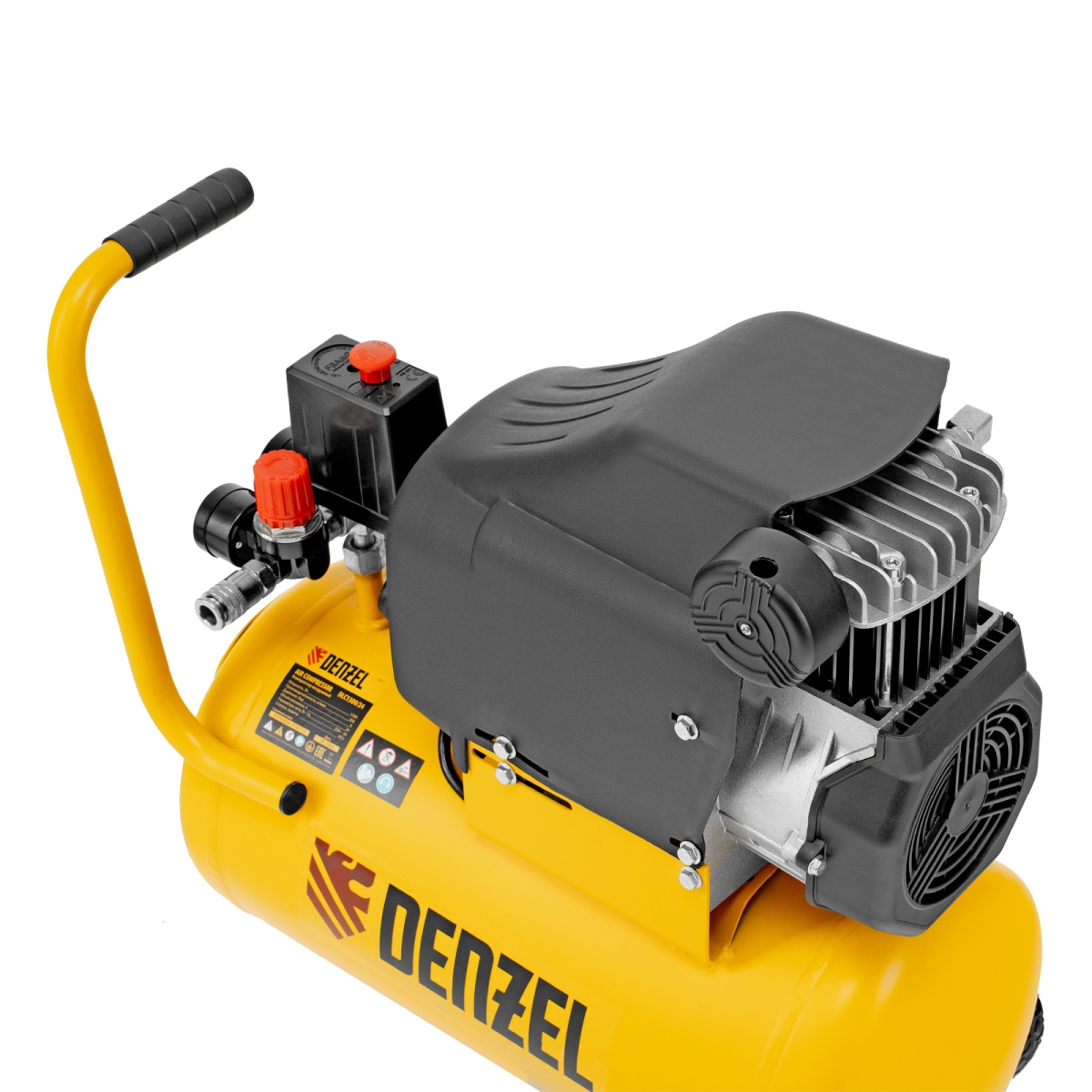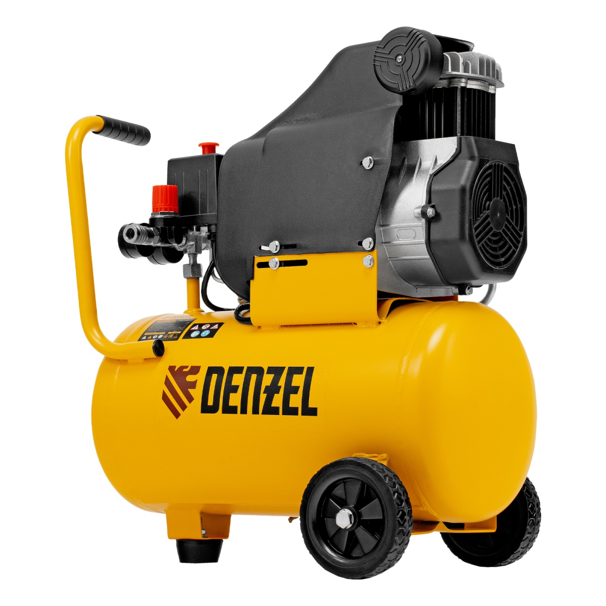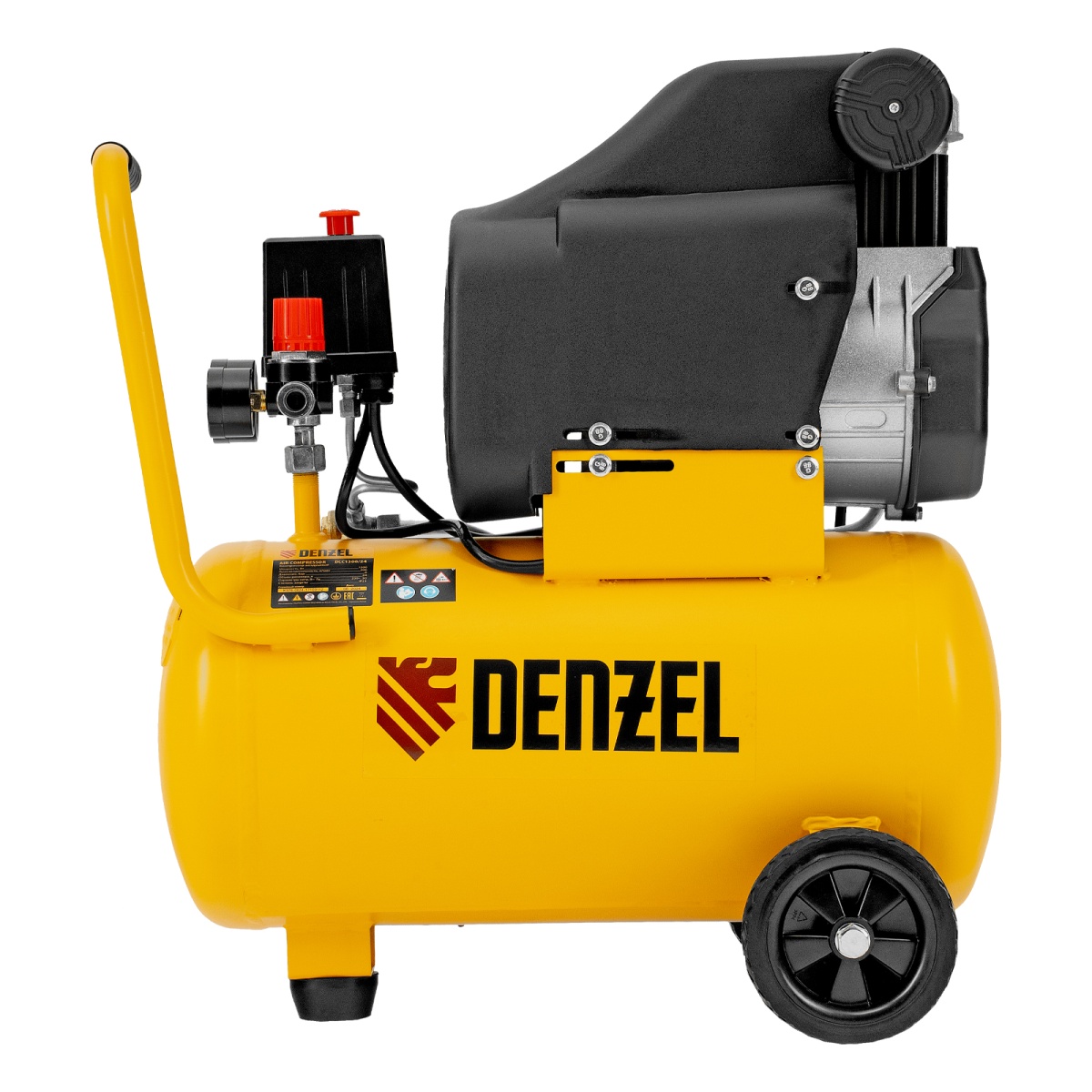 Безмасляный воздушный компрессор Denzel DLC1300/24 58171 мощностью 1,3 кВт, с объемом ресивера 24 л и производительностью на входе 206 л/мин, обеспечивает на выходе чистый сжатый воздух без примесей масла, что позволяет использовать его при окрашивании, креплении паркета и вагонки, продувке электронной техники, накачке шин. Подходит для обеспечения длительной работы пневмоаэрографа, пневмогравера, пневмошуруповерта, пневмодрели и пневмонейлера, а также другого пневмоинструмента. Быстроразъемный коннектор Euro (Rapid) упрощает подключение пневмомагистрали.ПреимуществаТермозащита — предохранитель останавливает работу двигателя при перегреве, что увеличивает срок службы компрессора.Защита по току — в случае перегрузки двигатель отключается для предотвращения поломки.Продуманная конструкция — антифрикционное покрытие цилиндра уменьшает трение, а его ребристая поверхность улучшает теплоотвод, что снижает нагрузку на двигатель.Стабильная работа без потери производительности — фильтр с бумажным картриджем обладает повышенной пропускной способностью.Чистый воздух — уплотнитель на фильтре препятствует попаданию в цилиндр посторонних примесей.Безопасность — предохранительный клапан своевременно сбрасывает избыточное давление, предотвращая аварийную ситуацию.Быстрый слив конденсата — пробка расположена снизу и имеет специальные упоры для откручивания без инструмента.Контроль рабочих параметров — компрессор оснащен двумя манометрами для отслеживания давления в пневмолинии и ресивере.Отсутствие масла — компрессор не нуждается в постоянном техническом обслуживании.Накладки на ножках — компрессор отличается устойчивостью и не испытывает повышенных вибраций во время работы.Мобильность — компрессор, оснащенный ручкой и колесами, весит 22,6 кг, что упрощает его транспортировку.Расширенная 3-летняя гарантия — надежность компрессора подтверждена производителем.