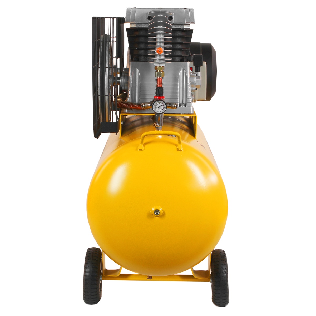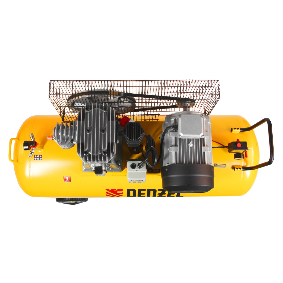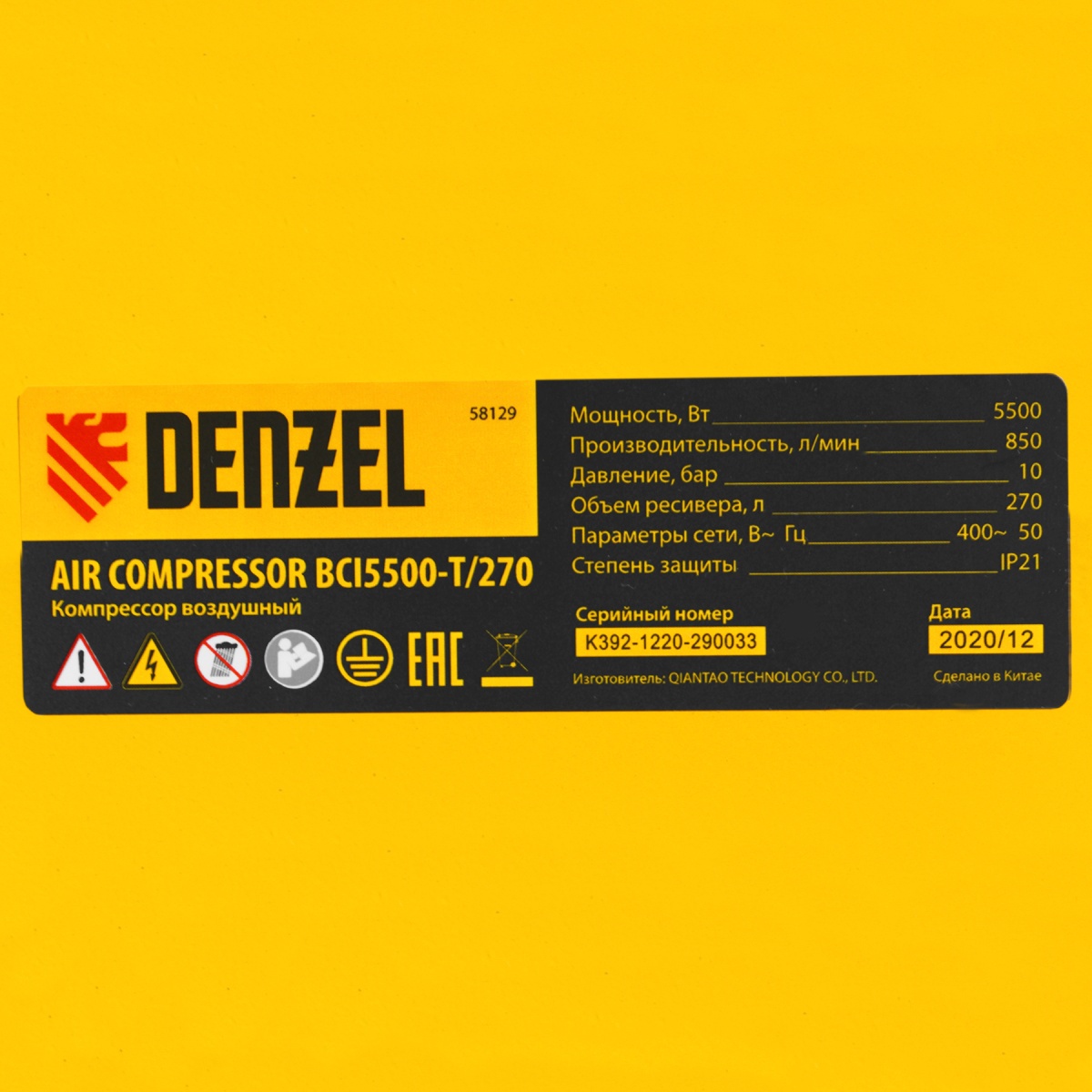 Воздушный компрессор Denzel BCI5500-T/270 58129 мощностью 5,5 кВт, с ресивером объемом 270 л, сжимает 850 литров воздуха в минуту и подает его к пневмоинструменту. К компрессору можно подключить пневмодрель, пневмогайковерт, пневмостеплер, пневмошуруповерт и другое оборудование. Благодаря ременному приводу он легко выдерживает интенсивные нагрузки, поэтому его можно использовать на строительной площадке или в автомастерской. Увеличенный ресивер обеспечивает большой запас сжатого воздуха, что позволяет уменьшить частоту включений мотора и снизить нагрузку на компрессор.ПреимуществаНадежная конструкция — цилиндры и коленвал выполнены из чугуна, корпус и штуцеры фильтров — из металла, ресивер — из стальных листов толщиной 3,7 мм.Высокий ресурс — двигатель с медной обмоткой выдерживает интенсивные нагрузки без риска поломки.Термозащита — аварийное отключение двигателя при перегреве увеличивает срок его службы.Безопасность — защита по току предотвращает выход двигателя из строя при перегрузке.Стабильная работа — картриджи воздушных фильтров из гофрированной бумаги минимизируют сопротивление потоку воздуха на входе.Эффективная фильтрация — резиновые уплотнители исключают подсос неочищенного воздуха, защищая поршневую группу от попадания посторонних частиц.Удобный контроль работы — 2 манометра позволяют отслеживать давление не только в ресивере, но и в выходной магистрали.Продуманная конструкция — оребренные трубки воздушной магистрали повышают эффективность охлаждения поступающего в ресивер воздуха.Фильтр-влагоотделитель — поступающий в пневмомагистраль сжатый воздух не содержит конденсат.Удобная транспортировка — П-образная ручка и 4 колеса, в том числе 2 поворотных, облегчают перемещение компрессора по рабочей площадке.Расширенная 3-летняя гарантия — надежность компрессора подтверждена производителем.
