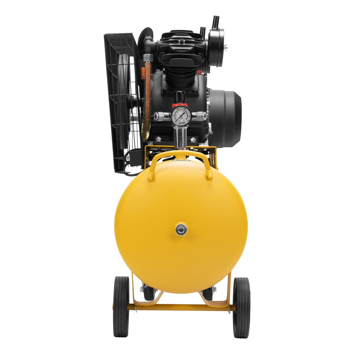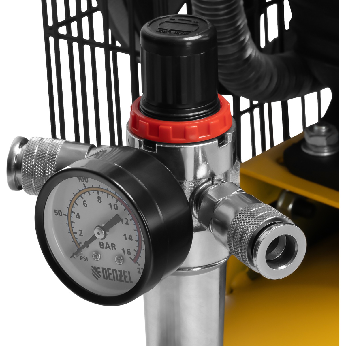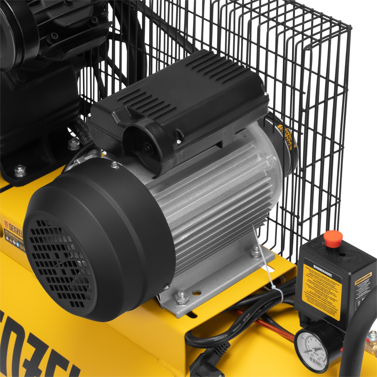 Компрессор Denzel BCV2300/100 58111 мощностью 2,3 кВт, с ресивером на 100 л, способен производить 440 литров сжатого воздуха в минуту. К нему могут подключаться сразу 2 пневмоинструмента, например, продувочный пистолет и плазморез. Высокие показатели производительности позволяют использовать данный компрессор в подсобных хозяйствах, гаражах, на станциях техобслуживания автомобилей, мебельных фабриках и т.д.Отличительная особенность компрессора по сравнению с аналогами мощностью 2,3 кВт — это фильтр-влагоотделитель, установленный на выходе. Он препятствует попаданию конденсата и частиц масла в пневмомагистраль, что особенно важно при малярных работах и продувке элементов с электрическим соединением.ПреимуществаВысокий ресурс — модель BCV2300/100 оснащена надежным чугунным цилиндром и износостойким поршневым блоком с эффективным охлаждением.Двигатель не перегреется — встроенная термозащита моментально срабатывает при температуре больше 130°С и не дает компрессору включиться, пока он не остынет. Такая система предохраняет поломку основных узлов и продлевает срок службы электромотора.Защита по току — сжатие воздуха прекратится при сверхнагрузках или коротком замыкании, чтобы избежать аварийной ситуации и обеспечить сохранность двигателя.Медная обмотка двигателя — медь позволяет повысить производительность, при этом более устойчива к перегреву по сравнению с алюминием, поэтому ресурс двигателя увеличивается.Гальванизированное покрытие — клапанная плита не подвержена коррозии и окислению, пластины клапанов из сверхпрочной японской стали AISI 420 удачно прошли испытания в соляной ванне, что доказывает их высокую прочность даже в условиях повышенной влажности и высокой температуры.2 манометра — пользователю доступен контроль за давлением в ресивере и на выходной магистрали, поэтому при необходимости можно оперативно отрегулировать работу компрессора.Автоматизация работы — реле отключает двигатель при достижении максимально допустимого давления и автоматически включает, когда оно ниже установленной нормы.Клапан сброса давления — если реле не сработает при давлении выше 10 бар, избыточный воздух автоматически сбросится, эта система служит дополнительной подстраховкой и гарантирует безопасность работы.Прочность и надежность — ресивер выполнен из стали толщиной более 2,75 мм и защищен от протечек надежным сварным соединением.Воздушный фильтр — металлический корпус с картриджем из гофрированной бумаги позволяет эффективно очищать входящий поток от загрязняющих частиц. Это обеспечивает сохранность и износоустойчивость поршневой системы двигателя.Простое удаление конденсата — кран оснащен удобными подпальцевыми упорами, поэтому легко открывается для слива накопившейся влаги.Быстрая транспортировка — колеса и П-образная ручка позволяют легко разворачивать и транспортировать компрессор в нужное место.Гарантия 3 года — высокое качество компрессора подтверждено производителем.