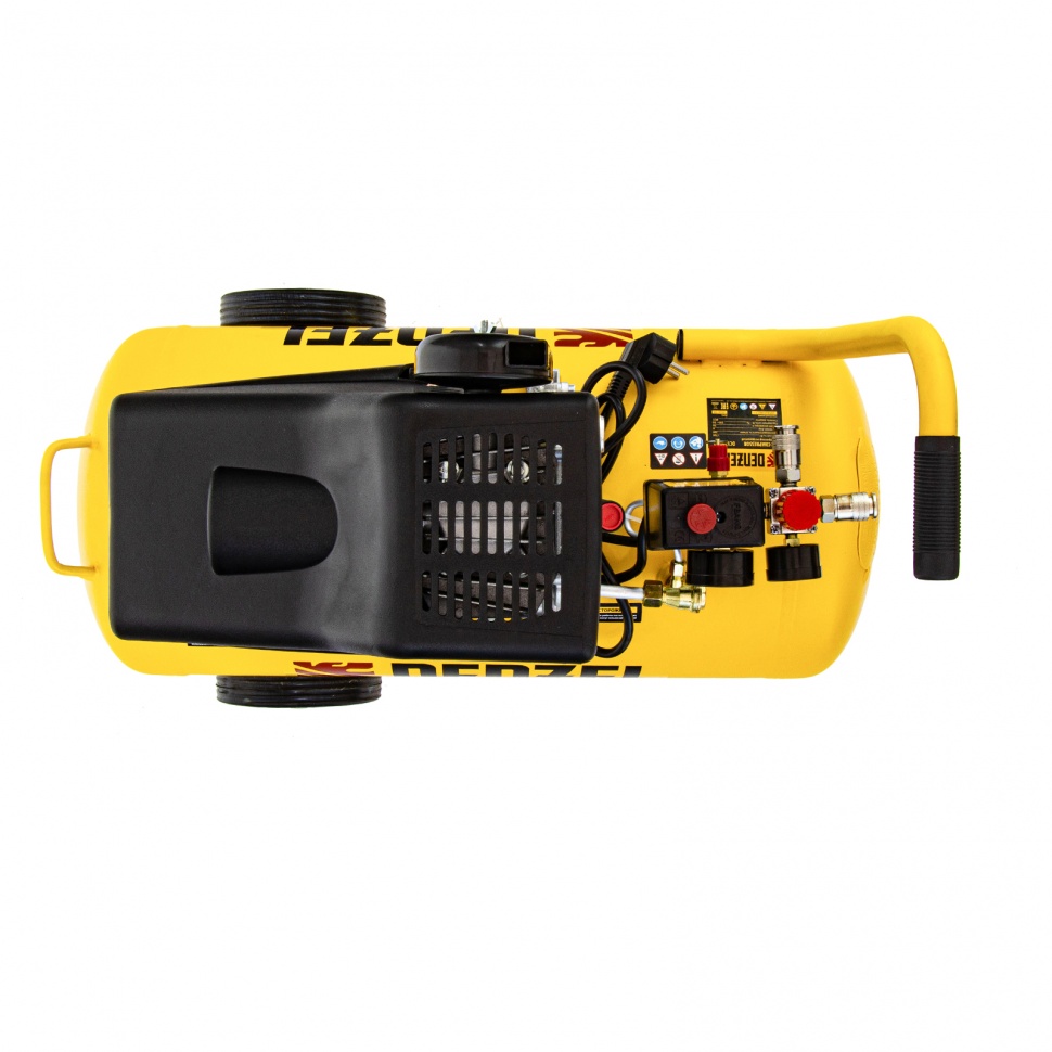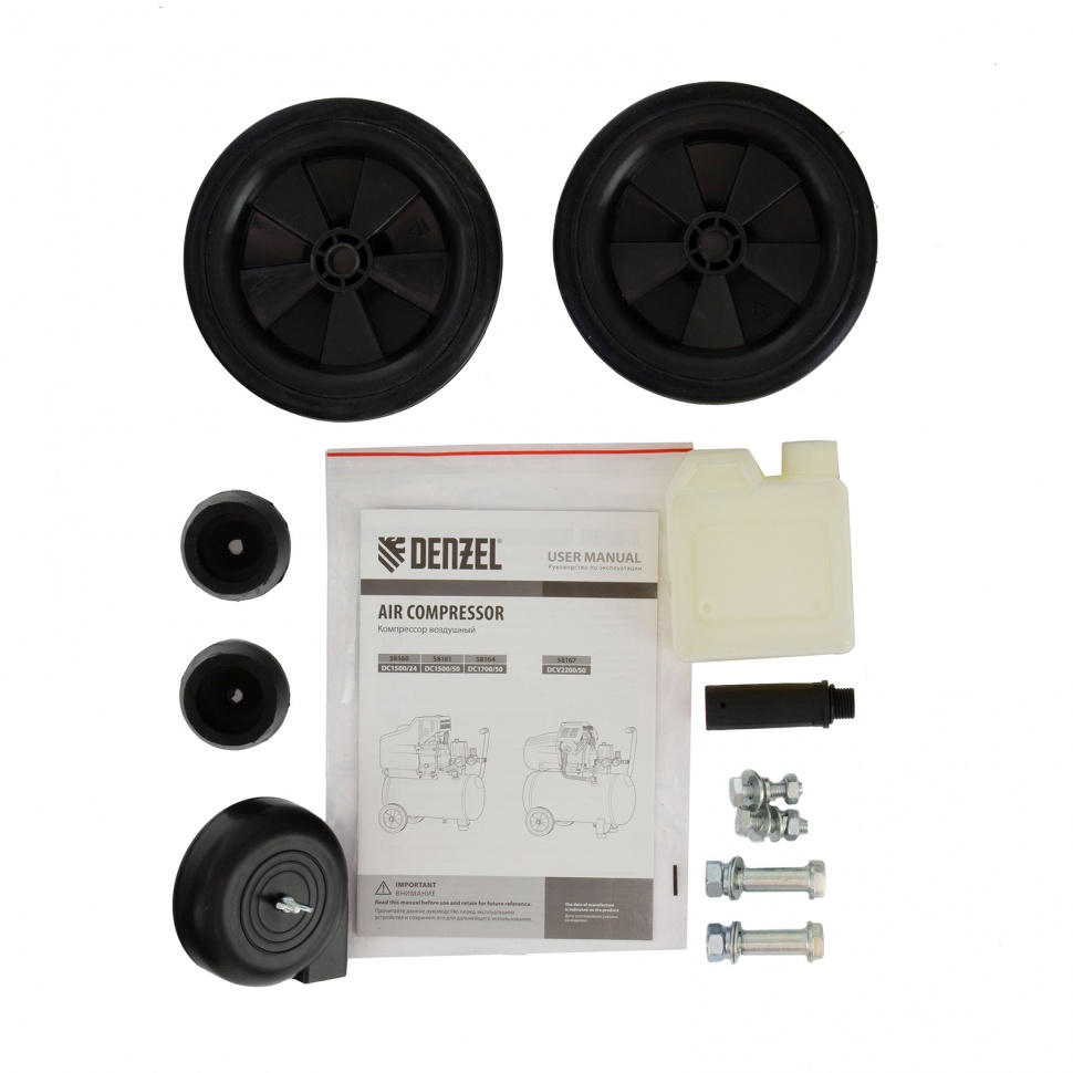 Воздушный компрессор с прямым приводом Denzel DC1700/50 58164 мощностью 1,5 кВт и производительностью 260 л/мин, с ресивером объемом 50 л, легко выдерживает интенсивные нагрузки, что позволяет использовать его как в быту, так и в профессиональной сфере. Объема ресивера 50 л и производительности на входе 260 л/мин достаточно для обеспечения работы пневмоинструмента, например, пневмошуруповерта, пневмонейлера, пневмостеплера. Быстроразъемные коннекторы Euro (Rapid) экономят время на подключение пневмомагистрали.ПреимуществаКачественные комплектующие — цилиндр и коленвал выполнены из чугуна, корпус и штуцер фильтра — из металла.Надежный ресивер — стенки толщиной 2,3 мм с прочными сварными швами выдерживают высокие нагрузки.Безопасная работа — двигатель автоматически отключается при перегрузке по току, что предотвращает оплавление обмотки и поломку оборудования.Термозащита — двигатель останавливается при перегреве, что продлевает срок его службы.Герметичность — прилегающие поверхности картера прошли дополнительную механическую обработку для максимальной плотности стыковки, поэтому протечка масла исключена.Эффективное охлаждение воздуха — оребренные трубки воздуховода хорошо отводят тепло.Надежный фильтр — резиновый уплотнитель не допускает подсосов неочищенного воздуха.Удобный контроль работы — 2 манометра позволяют отслеживать давление в ресивере и пневмомагистрали.Быстрое удаление конденсата — сливная пробка с упорами под пальцы откручивается без дополнительного инструмента.Маневренность — благодаря ручке и 2 колесам компрессор легко перемещать по рабочей зоне.Расширенная 3-летняя гарантия — высокое качество компрессора подтверждено производителем.
