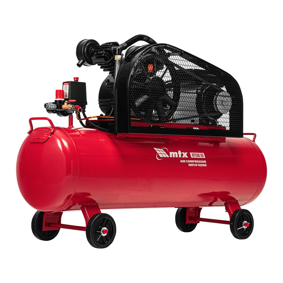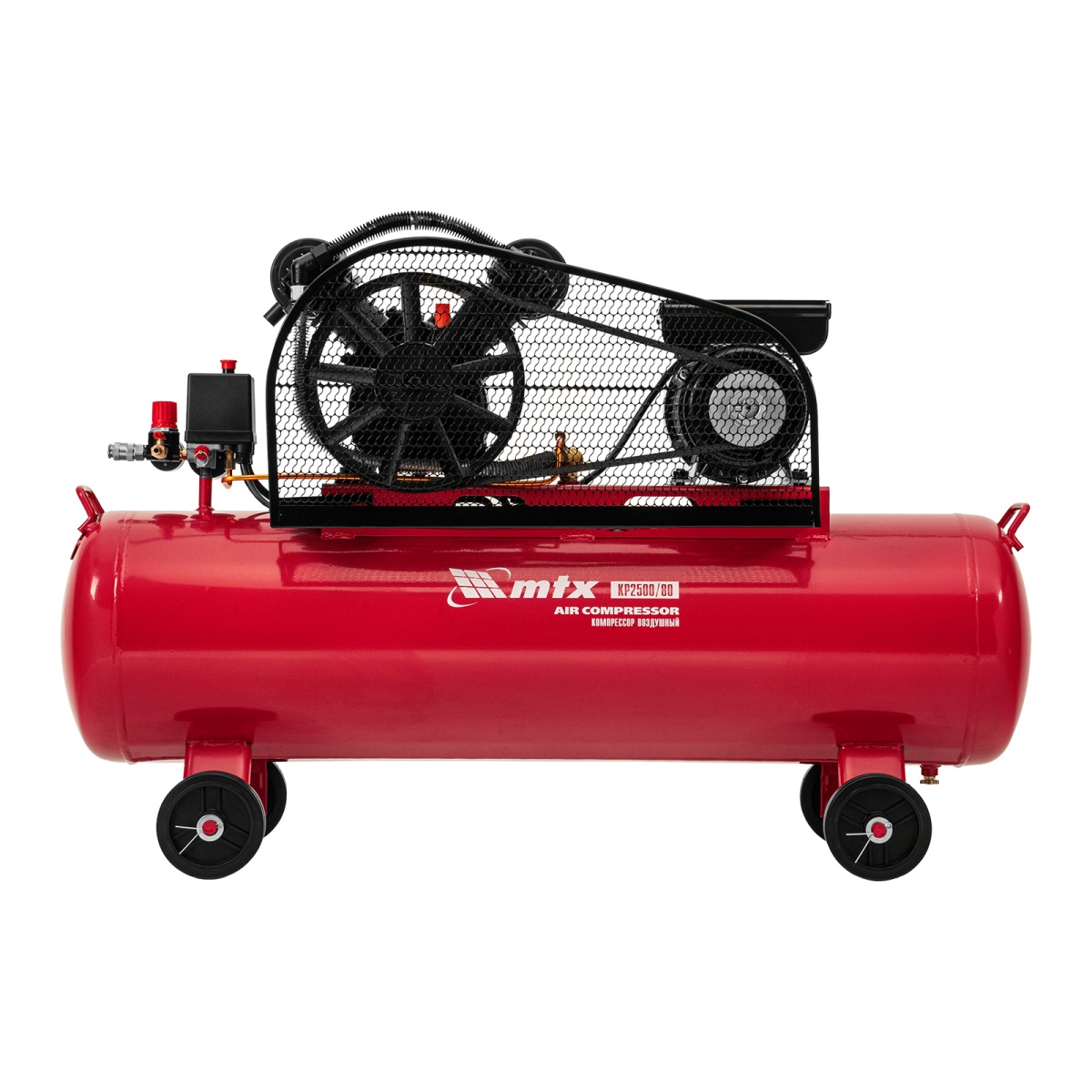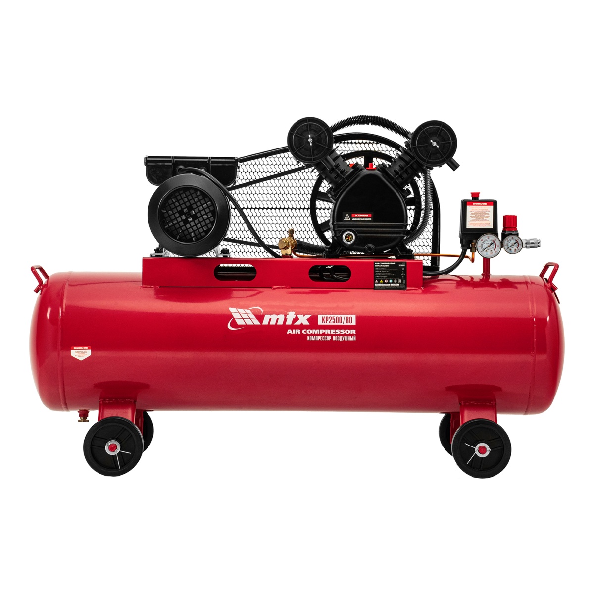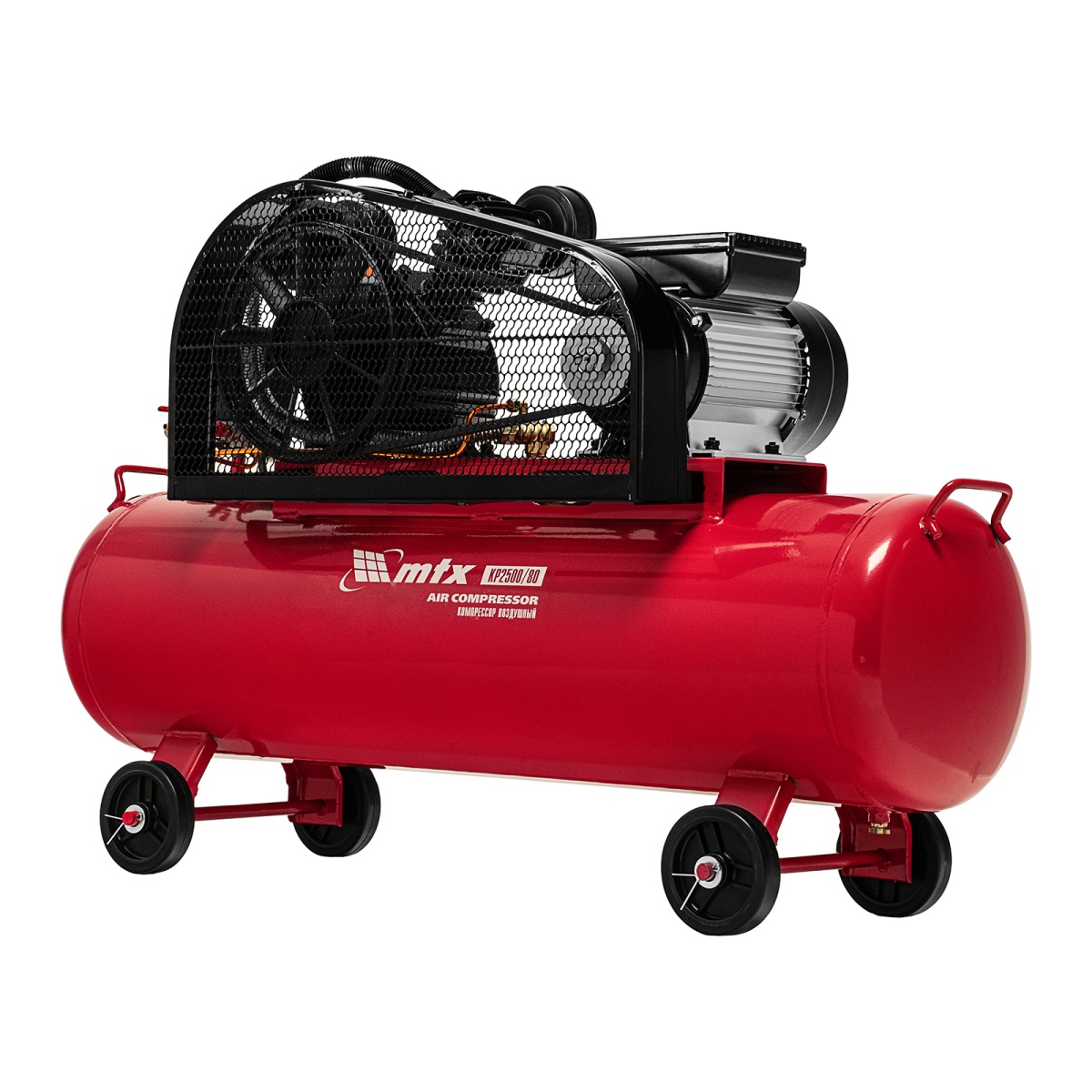 Компрессор воздушный МТХ КР2500/80 58047 с ременным приводом от электродвигателя, мощностью 2,5 кВт и производительностью 420 л/мин, с ресивером объемом 80 литров, применяется для подачи сжатого атмосферного воздуха в пневматические инструменты. К нему можно подключать гайковерт, дрель, степлер, краскопульт, продувочный пистолет и т.п.ПреимуществаБезопасность — защита от перегрузки позволяет избежать аварийные ситуации.Защитный клапан — превышение максимально допустимого давления в ресивере исключено.Реле давления — автоматическая регулировка работы с помощью периодических остановок/запуска двигателя позволяет поддерживать стабильную производительность.Повышенный ресурс — чугунный блок цилиндра увеличивает срок эксплуатации компрессора.Увеличенная емкость масляного картера — все детали воздушного компрессора обеспечены достаточной смазкой.Оснащение двумя манометрами — устройства позволяют контролировать давление сжатого воздуха в воздухосборнике и в пневмомагистрали.Простая подготовка к работе — с помощью быстросъемного коннектора пневмооборудование легко подключить.Мобильность — для удобного перемещения компрессор оснащен колесами и ручкой.Низкий уровень шума — значение звуковой мощности не превышает 95 дБ.Готовность к работе — комплект крепежа, колеса, сапун и компрессорное минеральное масло марки DAA100 (500 мл) входят в комплект поставки.