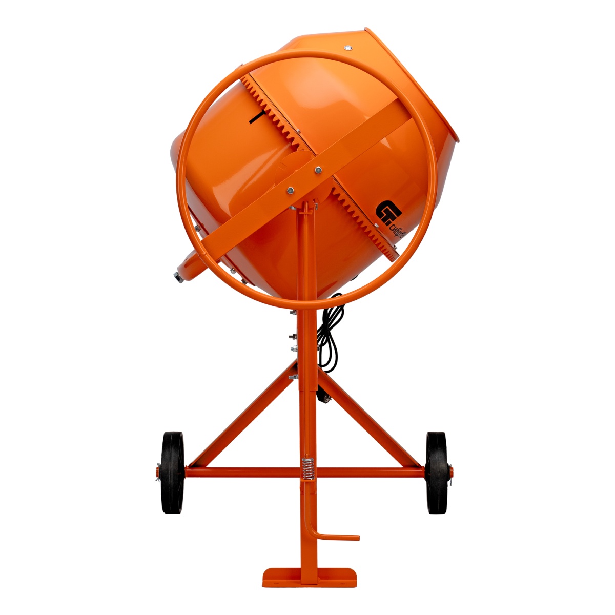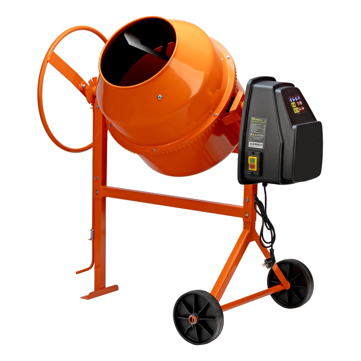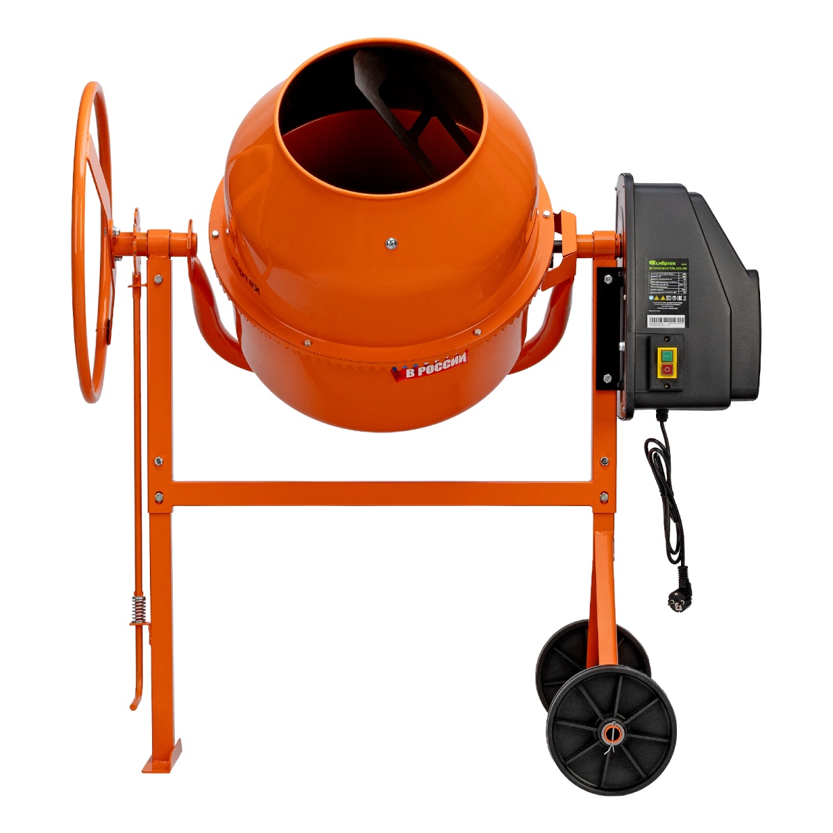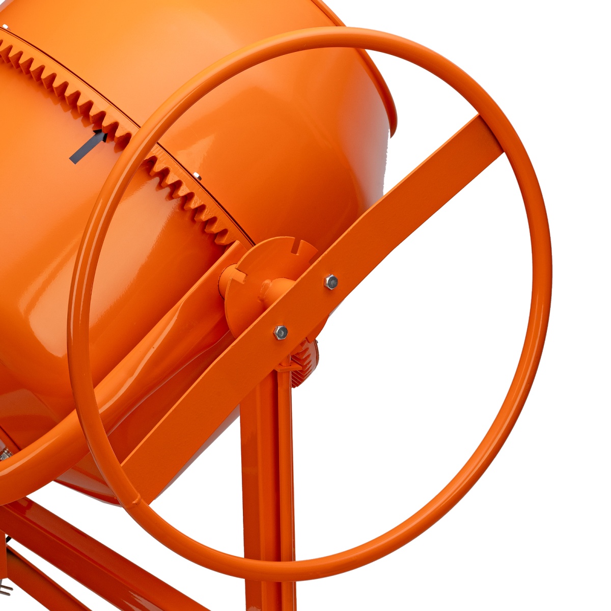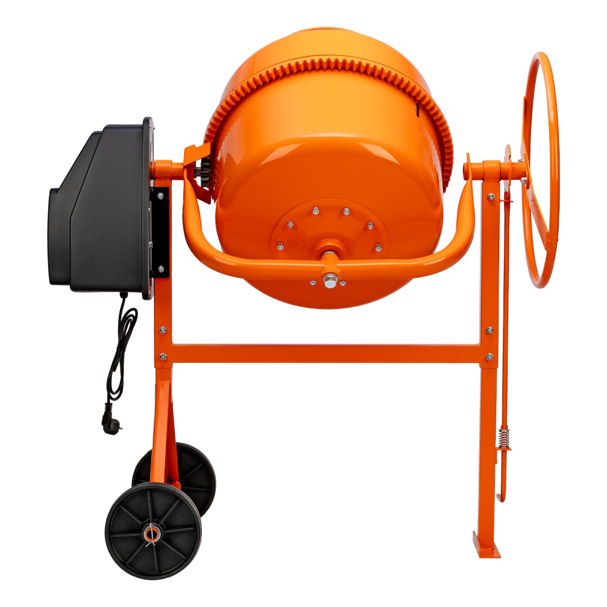 - Прочная опора – металлическая рама дополнительно усилена подкосами, поэтому нагрузка равномерно распределяется по всей конструкции независимо от степени наполненности бака.Экономия времени на сборку – барабан и опорная траверса соединены на заводе, там же выставлено зацепление венец-шестерня.Защитный стальной кожух – привод закрыт от внешних воздействий, также это решение обеспечивает безопасность оператора.Защита от влаги – клавиши пуска и отключения закрыты от попадания воды и грязи, что позволяет использовать устройство в условиях повышенной загрязненности.Легкий поворот барабана – угол наклона фиксируется педалью, поэтому разгрузить или загрузить бак не составит труда.Ведомый шкив поставляется с прочной стальной втулкой, поэтому вращение от вала передается ему без риска быстрого износа.Легкая замена деталей – подшипники можно заменить при необходимости, поскольку узел оси барабана сделан разъемным.Полный охват осей – траверса надежно прикреплена к раме, это обеспечивает сохранность узла при воздействии вибраций и постоянно меняющихся нагрузках.Сборная конструкция – барабан разбирается, это облегчает хранение и транспортировку бетоносмесителя.Удобство перемещения – маневренные колеса из прочного пластика помогают транспортировать бетоносмеситель даже по неровной земле, что облегчает использование на стройках.Защита электродвигателя от перегрева – электродвигатель оснащен тепловым выключателем, встроенным в обмотку, который защищает двигатель от перегрузки.