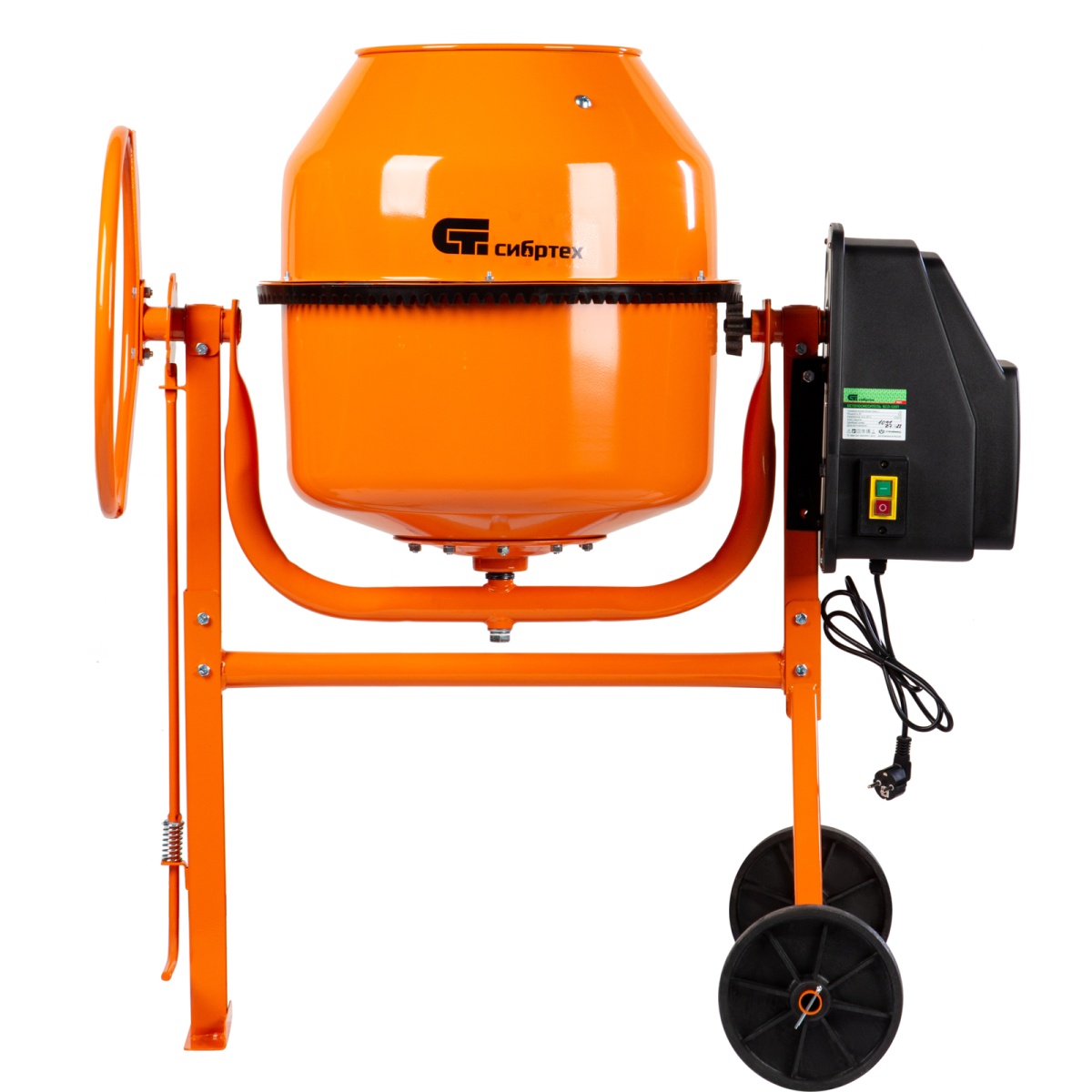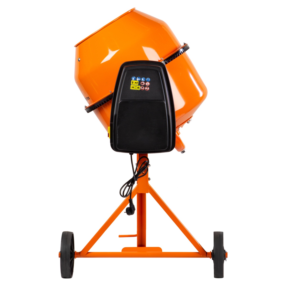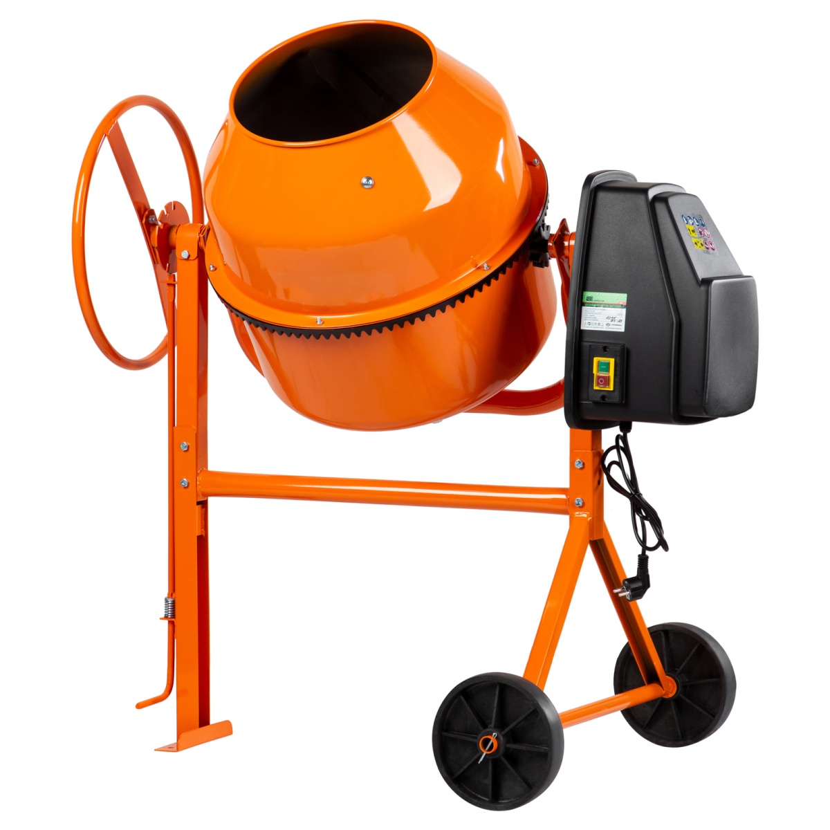 Быструю скорость перемешивания обеспечивает грушевидный барабан и надежные лопасти. Количество готового раствора при максимальном заполнении бака составляет 46 литров. Благодаря хорошему замешиванию раствор получается однородной консистенции, без комков, и не выливается при движении бака. Бетоносмеситель работает от сети 220В, поэтому оптимален для бытового применения.