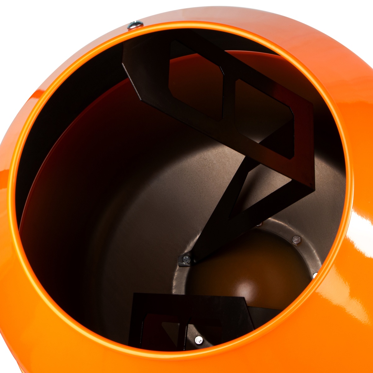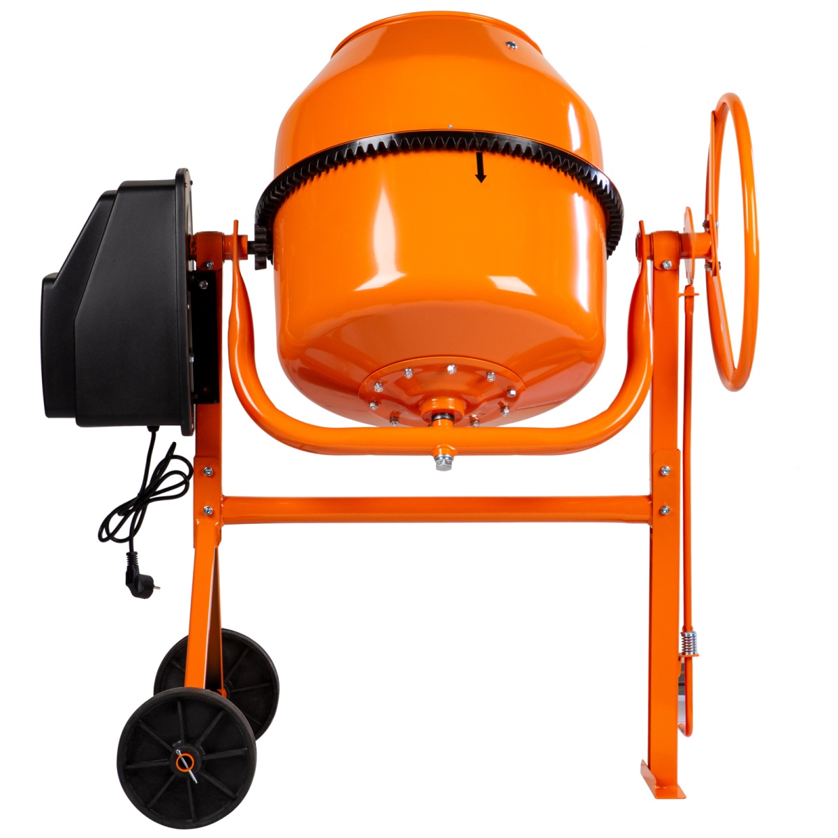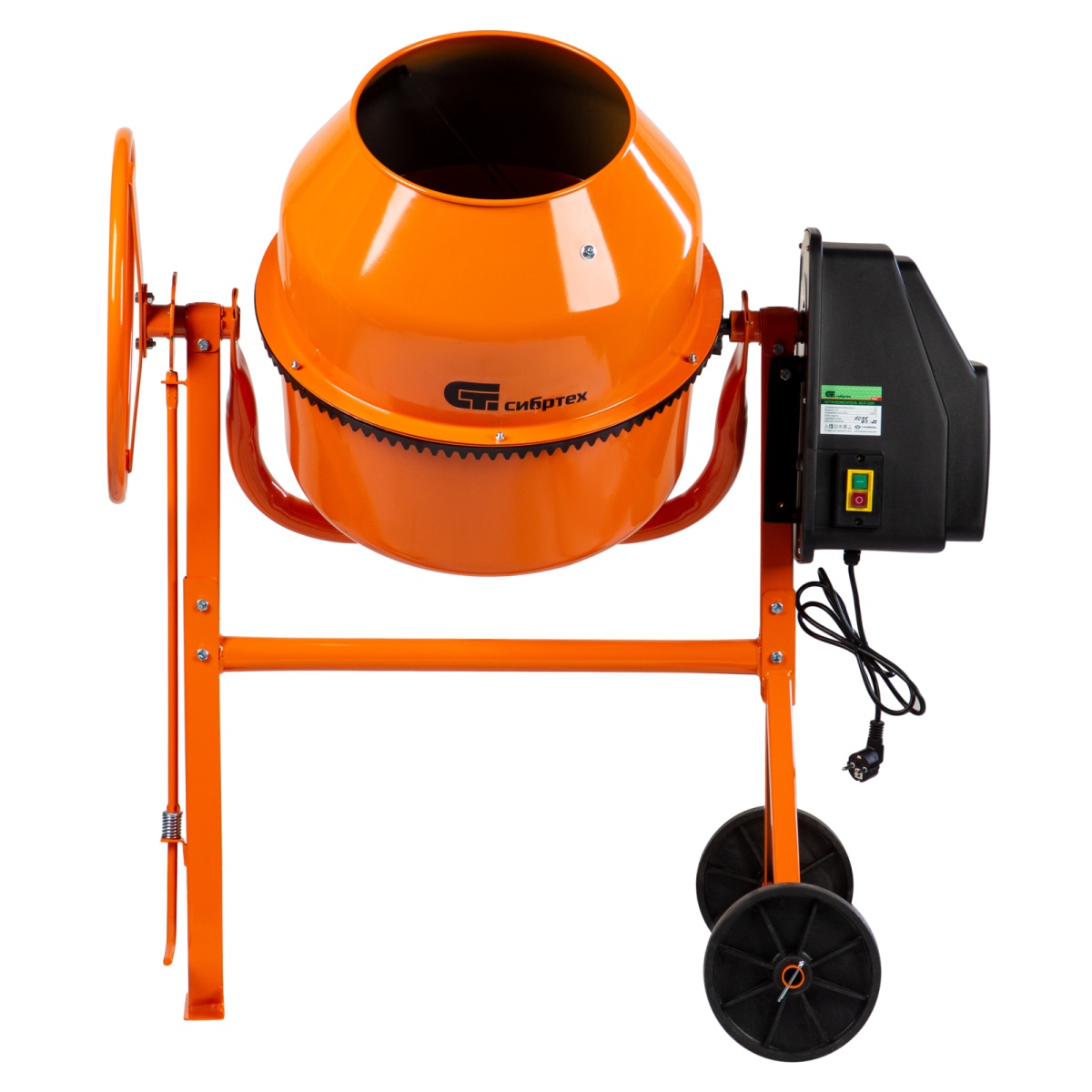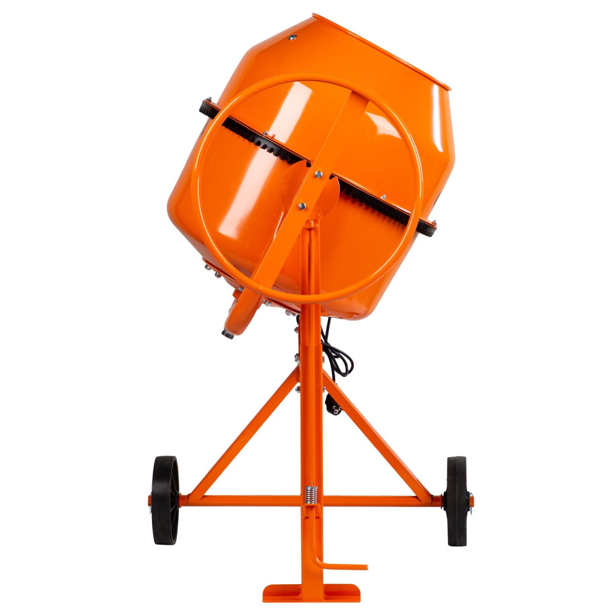 Быструю скорость перемешивания обеспечивает грушевидный барабан и надежные лопасти. Количество готового раствора при максимальном заполнении бака составляет 46 литров. Благодаря хорошему замешиванию раствор получается однородной консистенции, без комков, и не выливается при движении бака. Бетоносмеситель работает от сети 220В, поэтому оптимален для бытового применения.