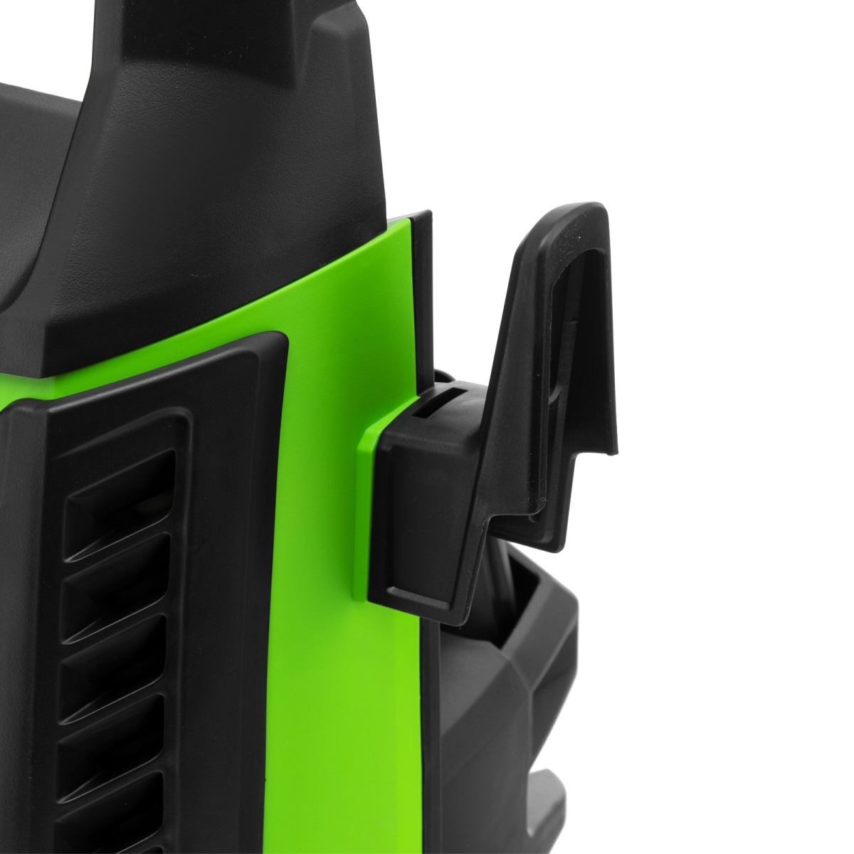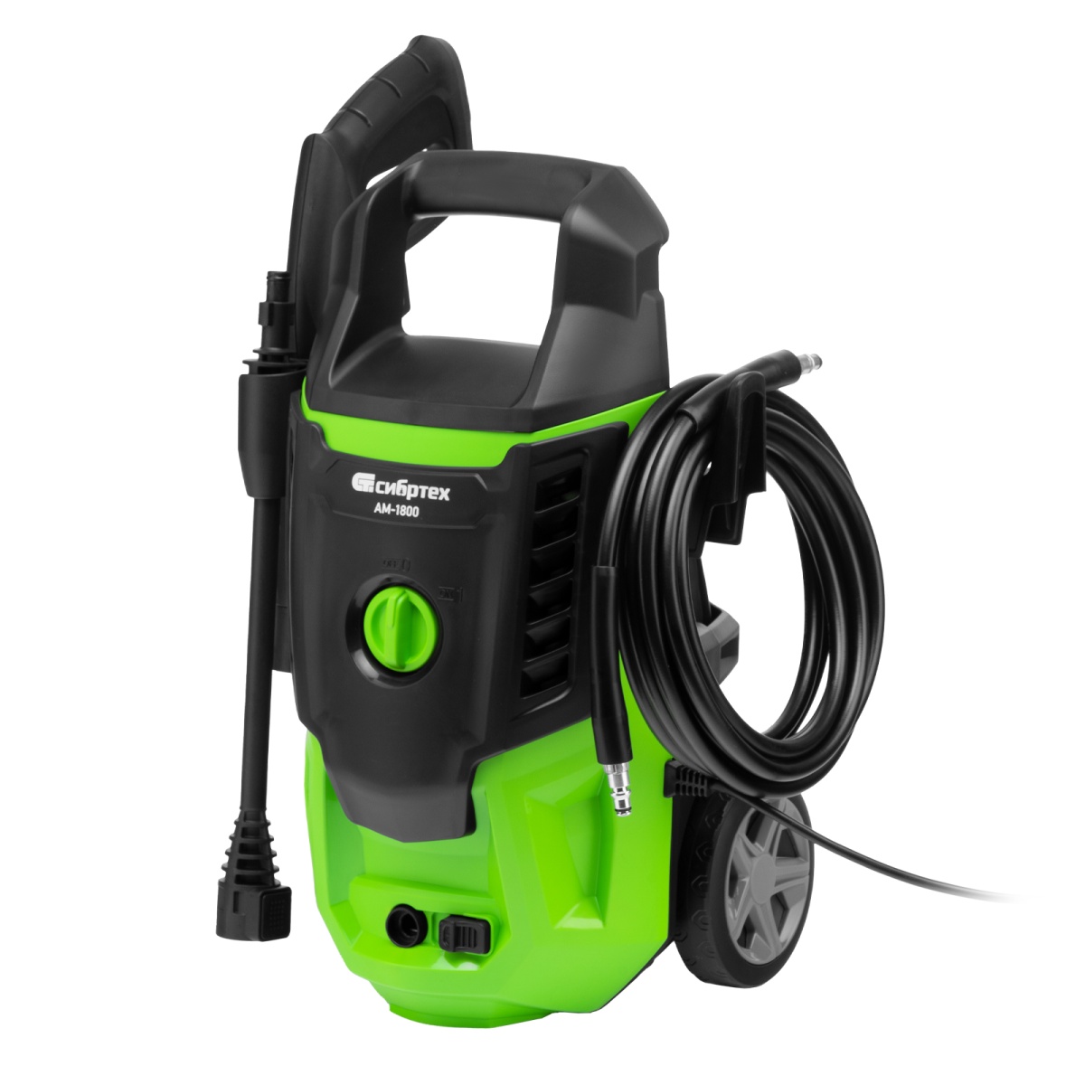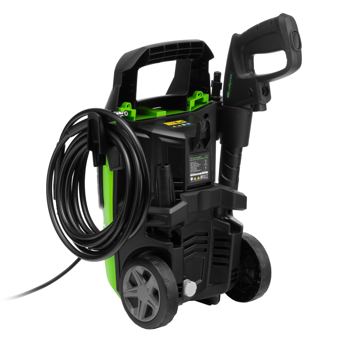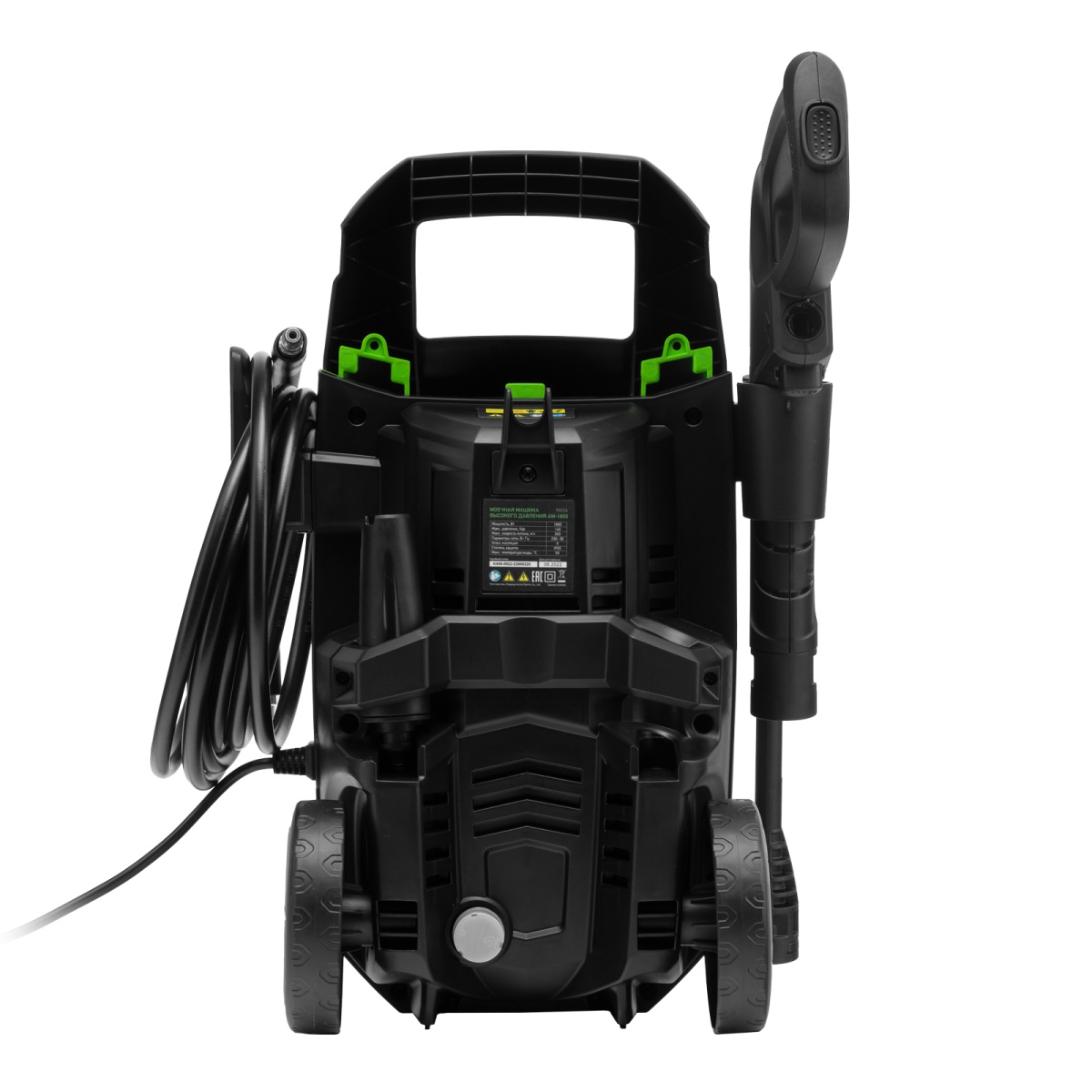 - Продуманное хранение и транспортировка — машина снабжена удобной ручкой и колесами, для кабеля и шланга предусмотрены специальные кронштейны.