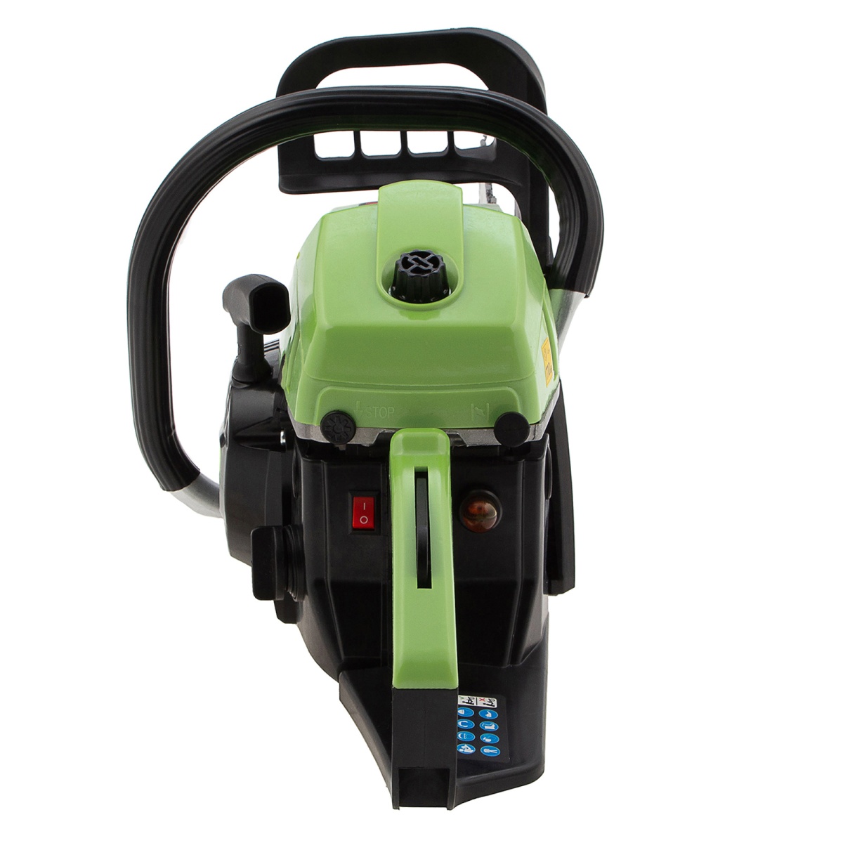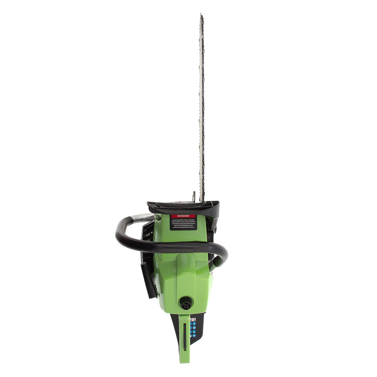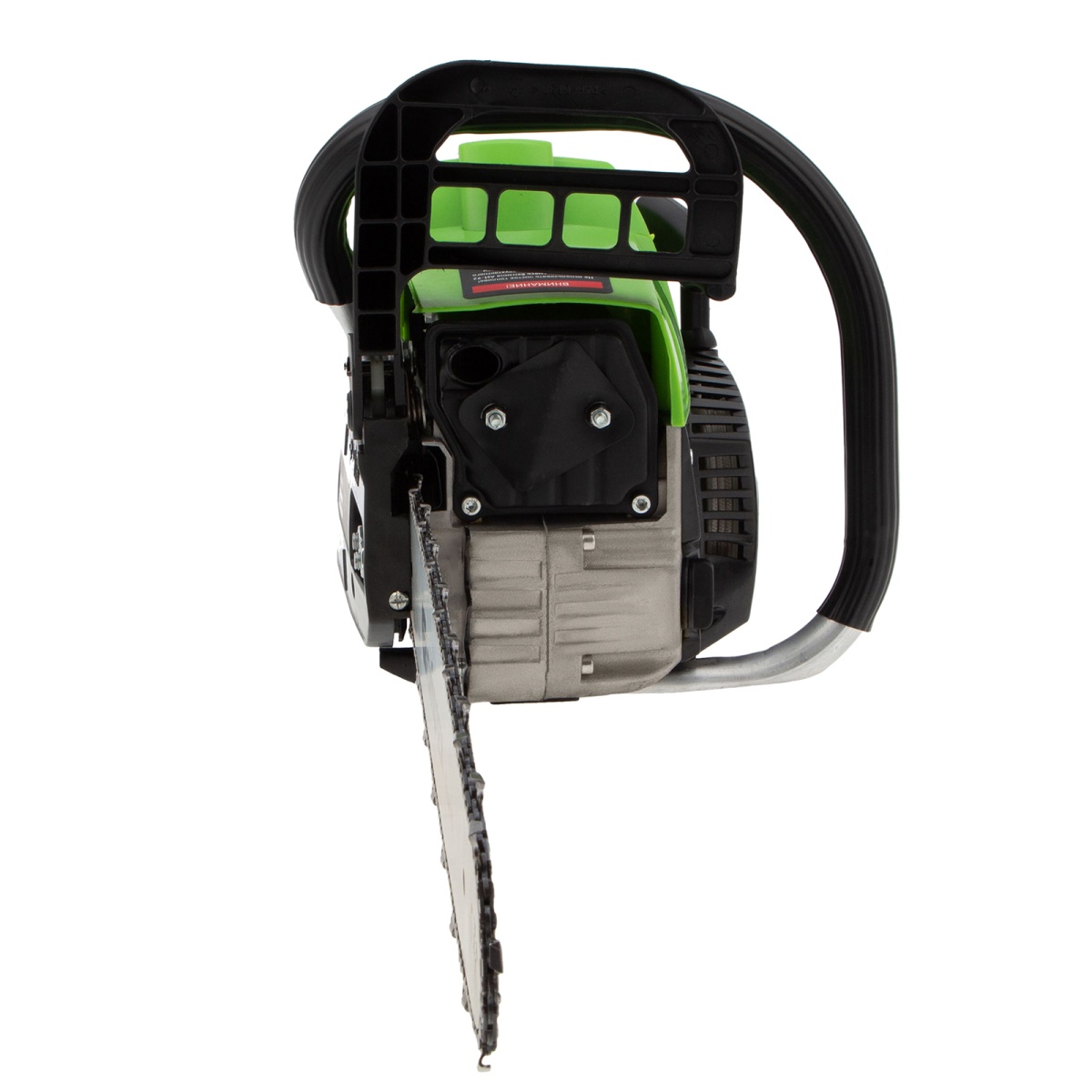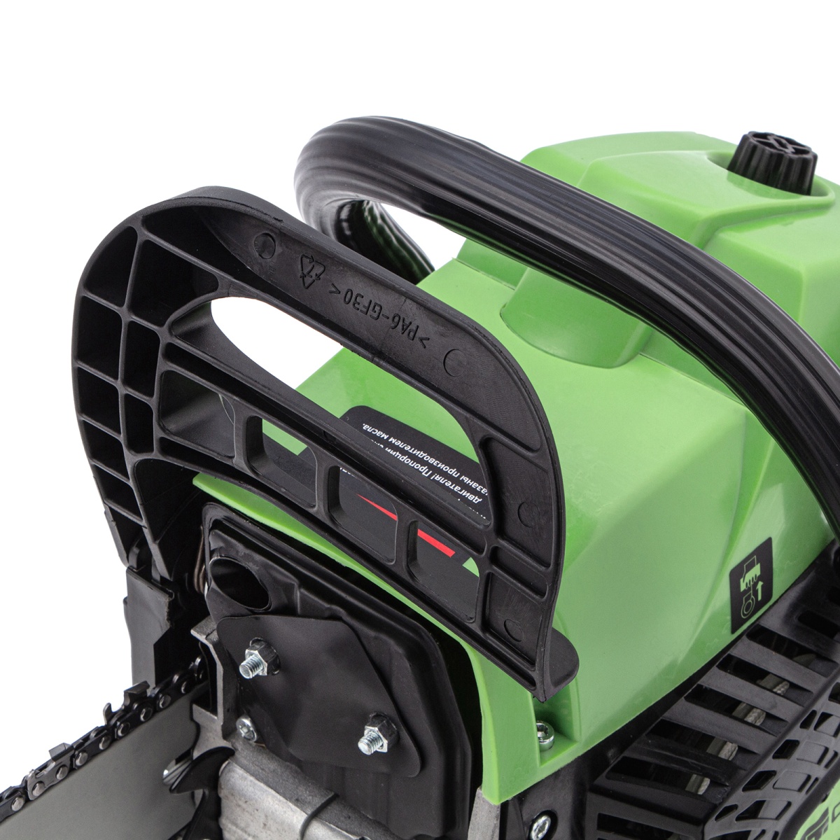 - Безопасность — пила оснащена блокировкой от случайного запуска и тормозом цепи, который моментально срабатывает при отскоке инструмента.